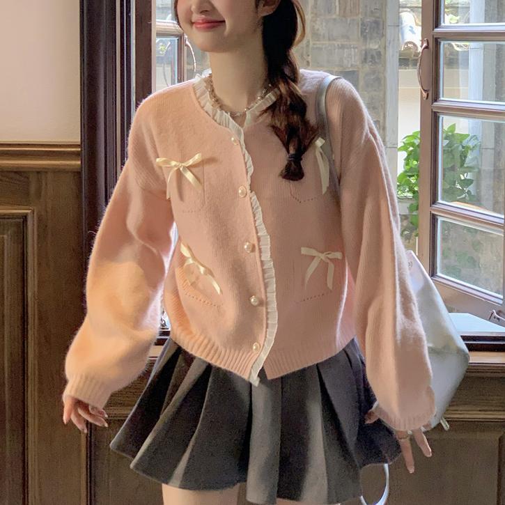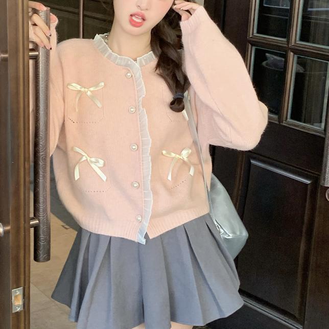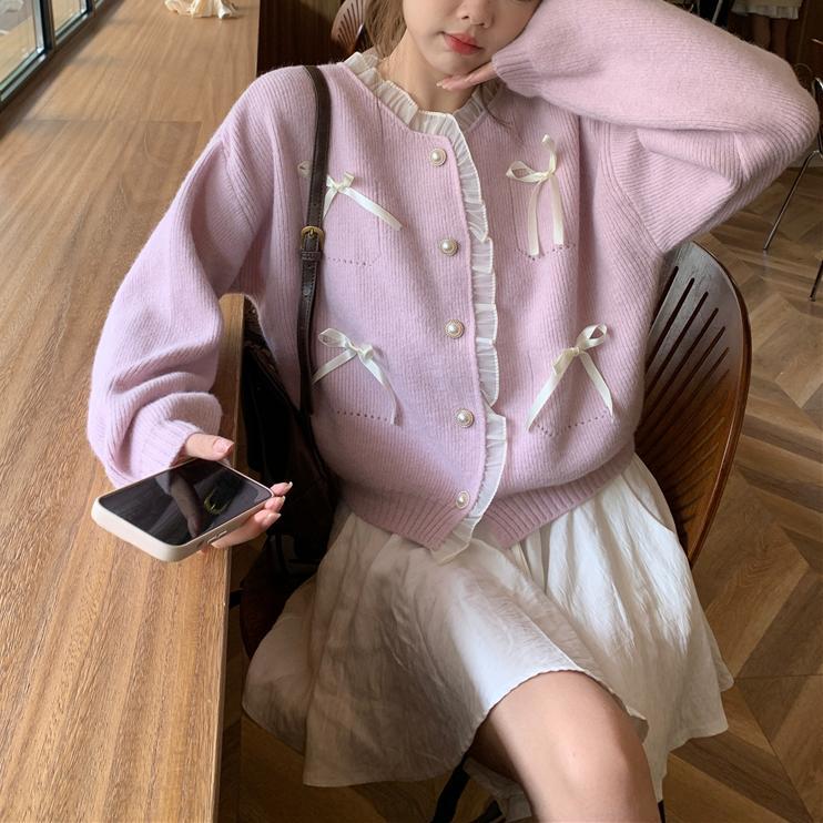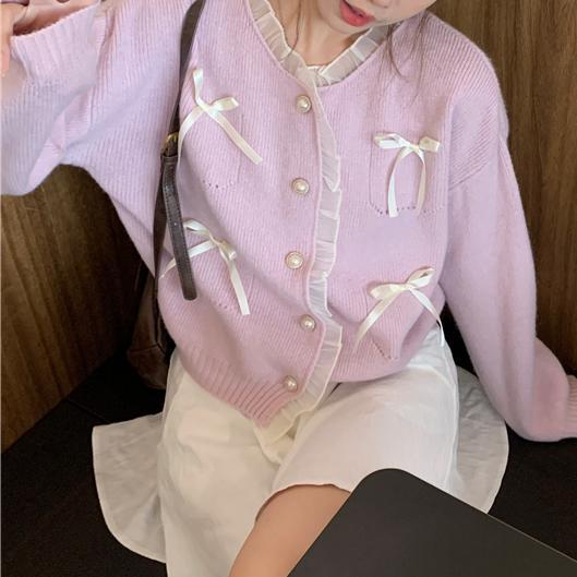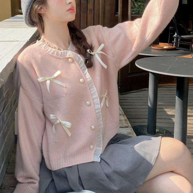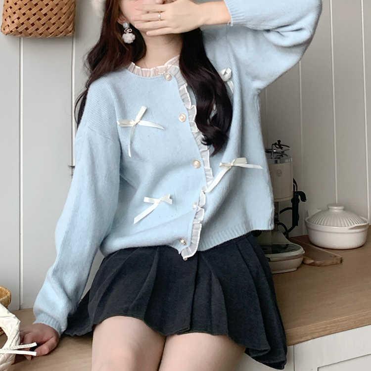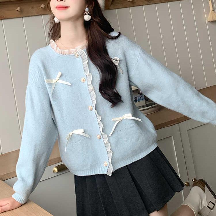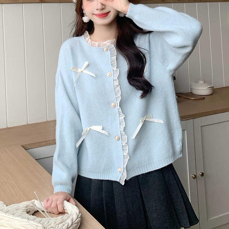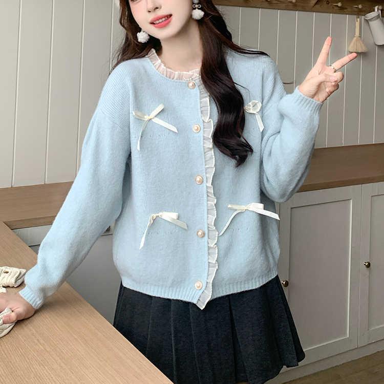 달콤한 스타일 레이스 바느질 긴팔 니트 카디건 여성의 가을 새로운 라운드 넥 나비 니트 카디건 탑스토어 가기