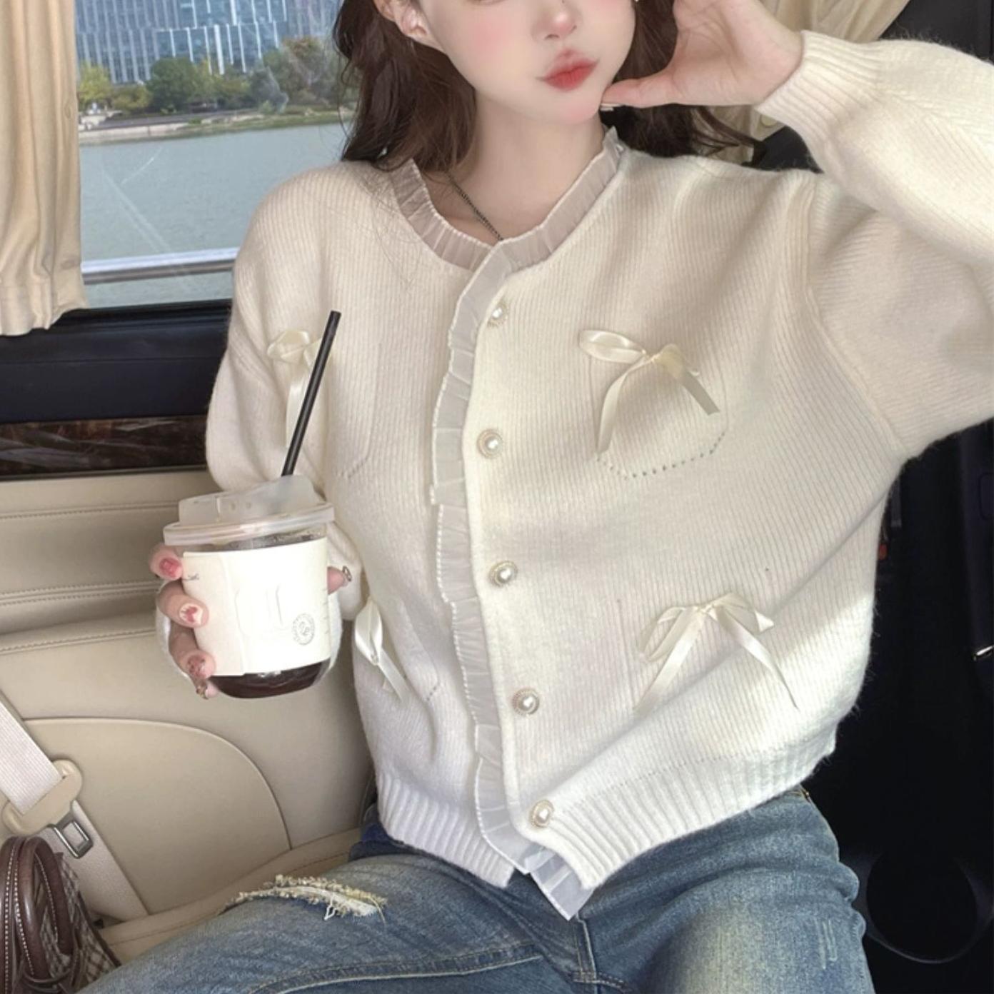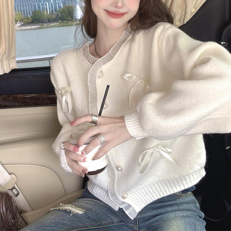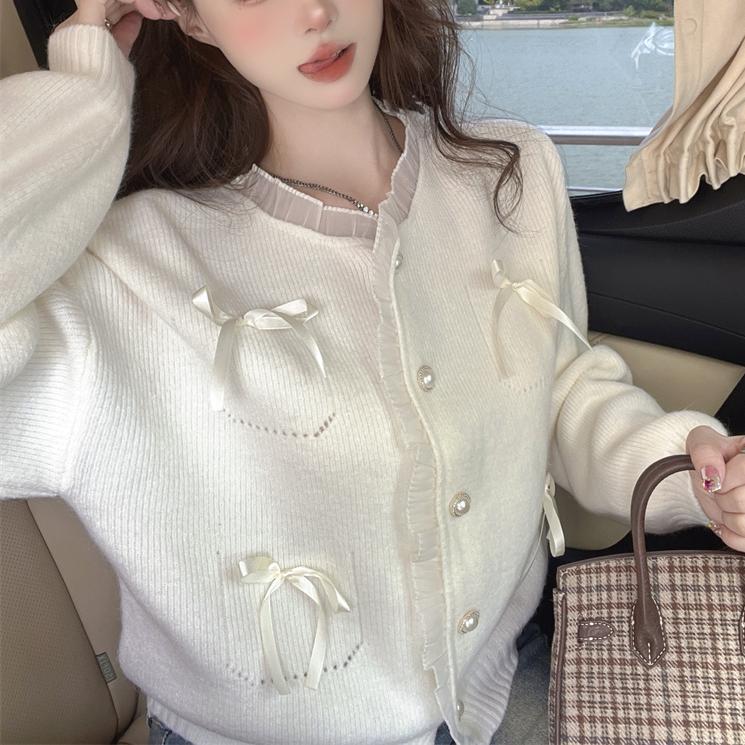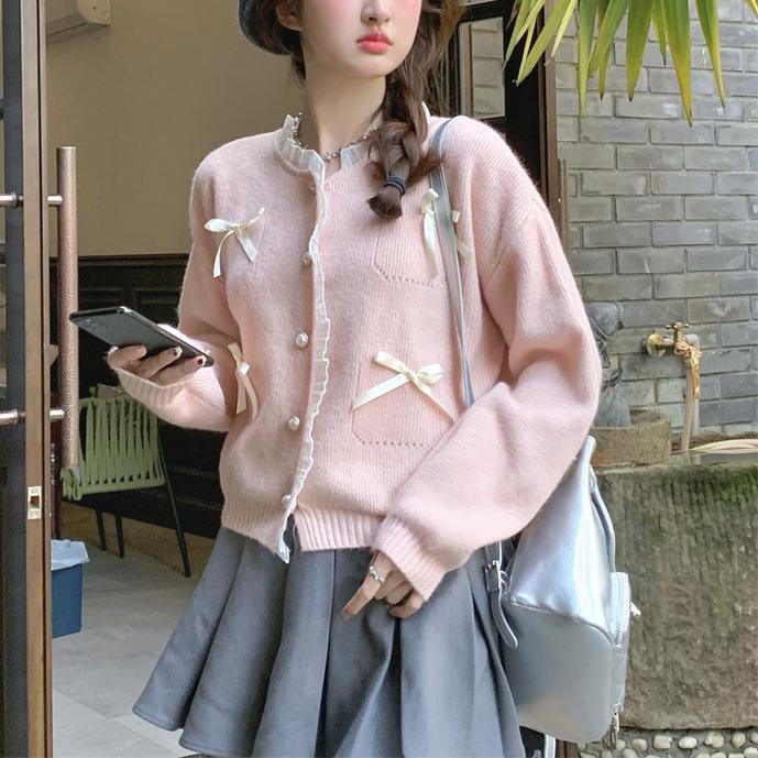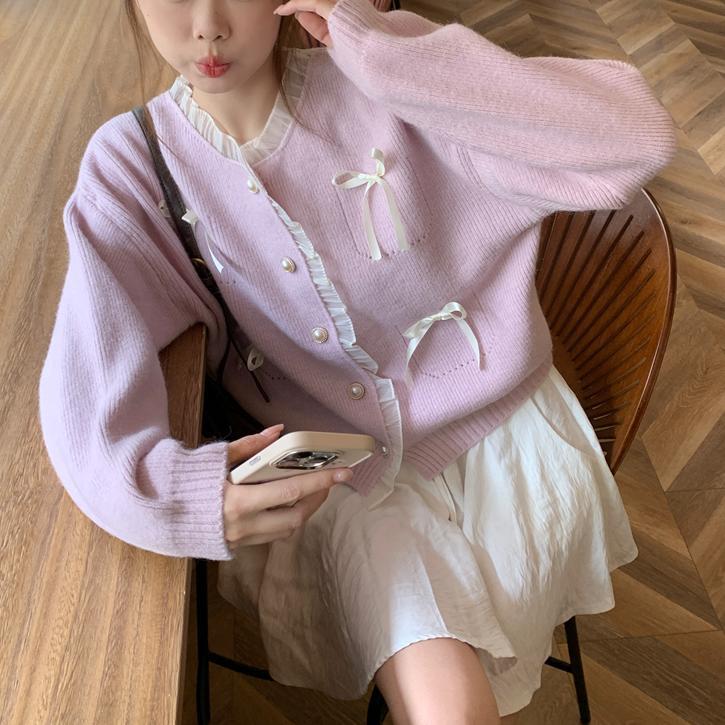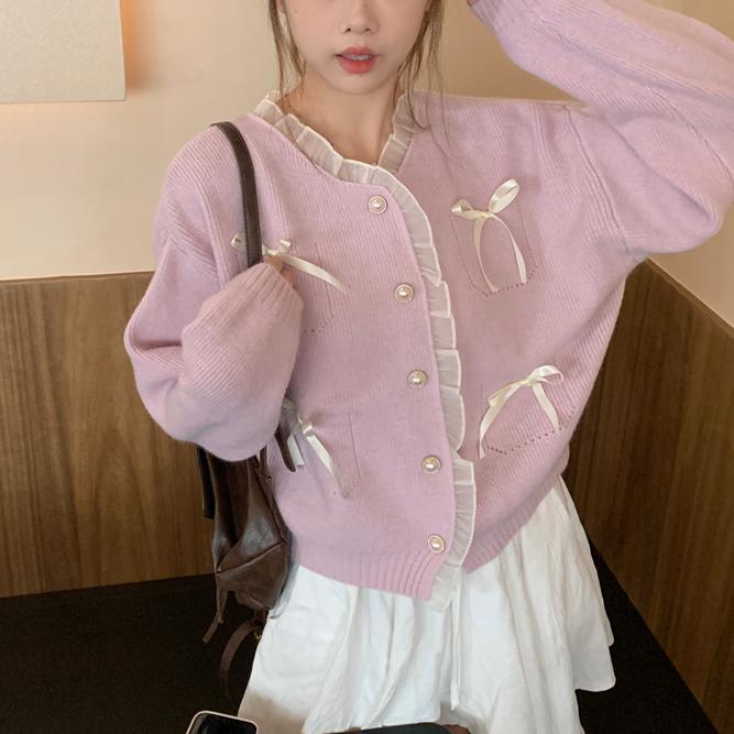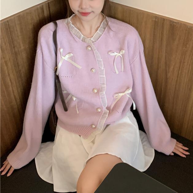 달콤한 스타일 레이스 바느질 긴팔 니트 카디건 여성의 가을 새로운 라운드 넥 나비 니트 카디건 탑스토어 가기
