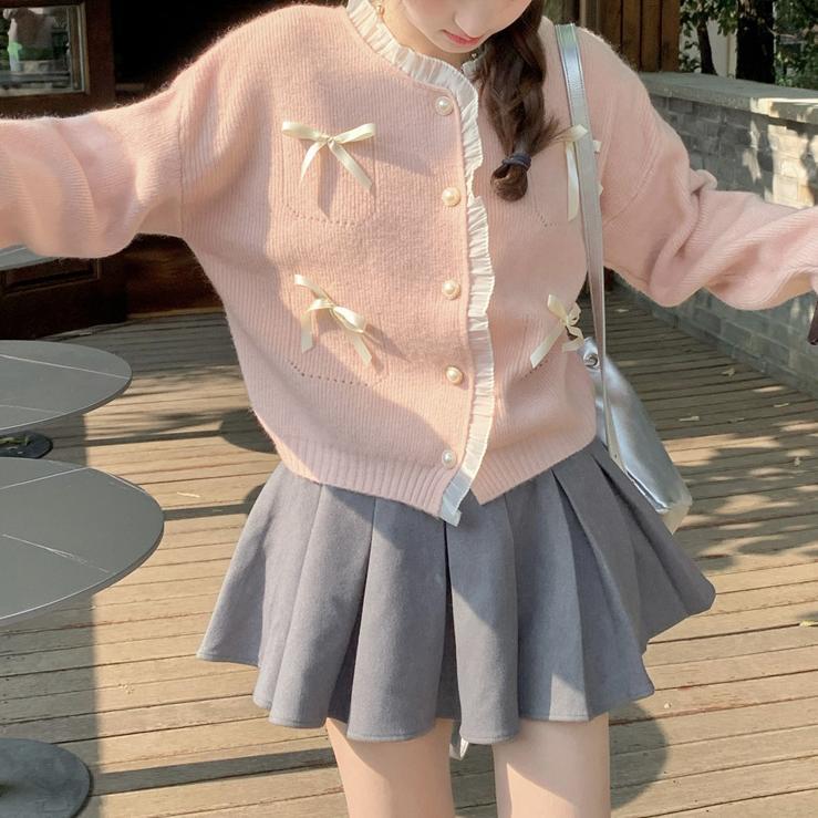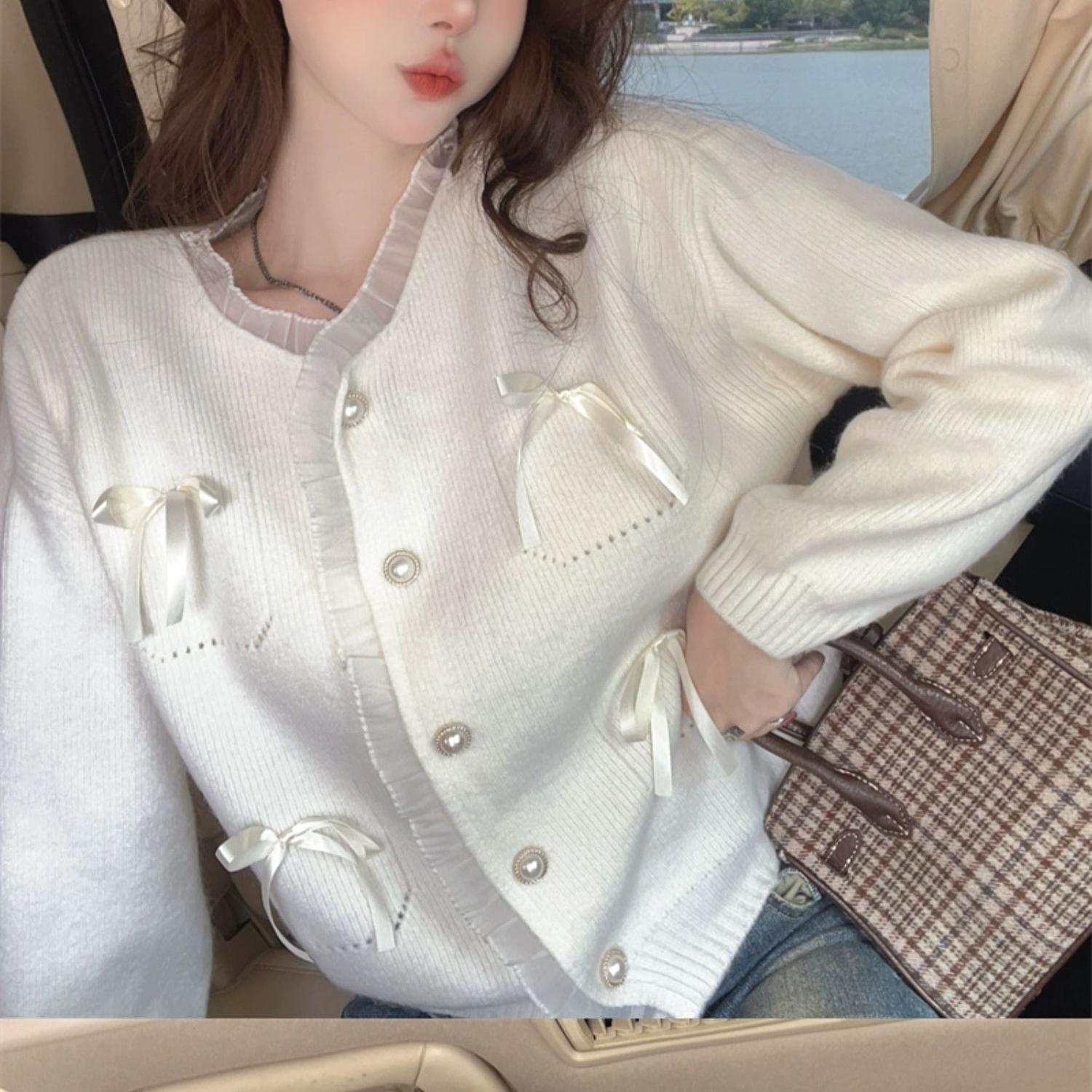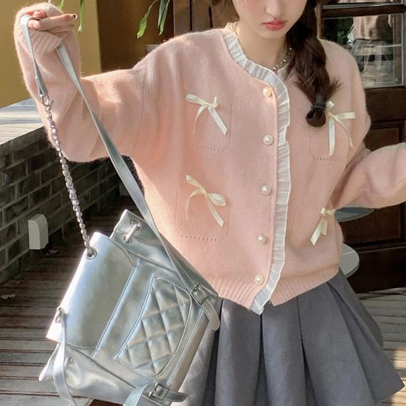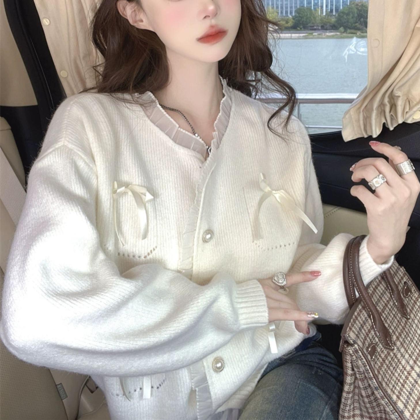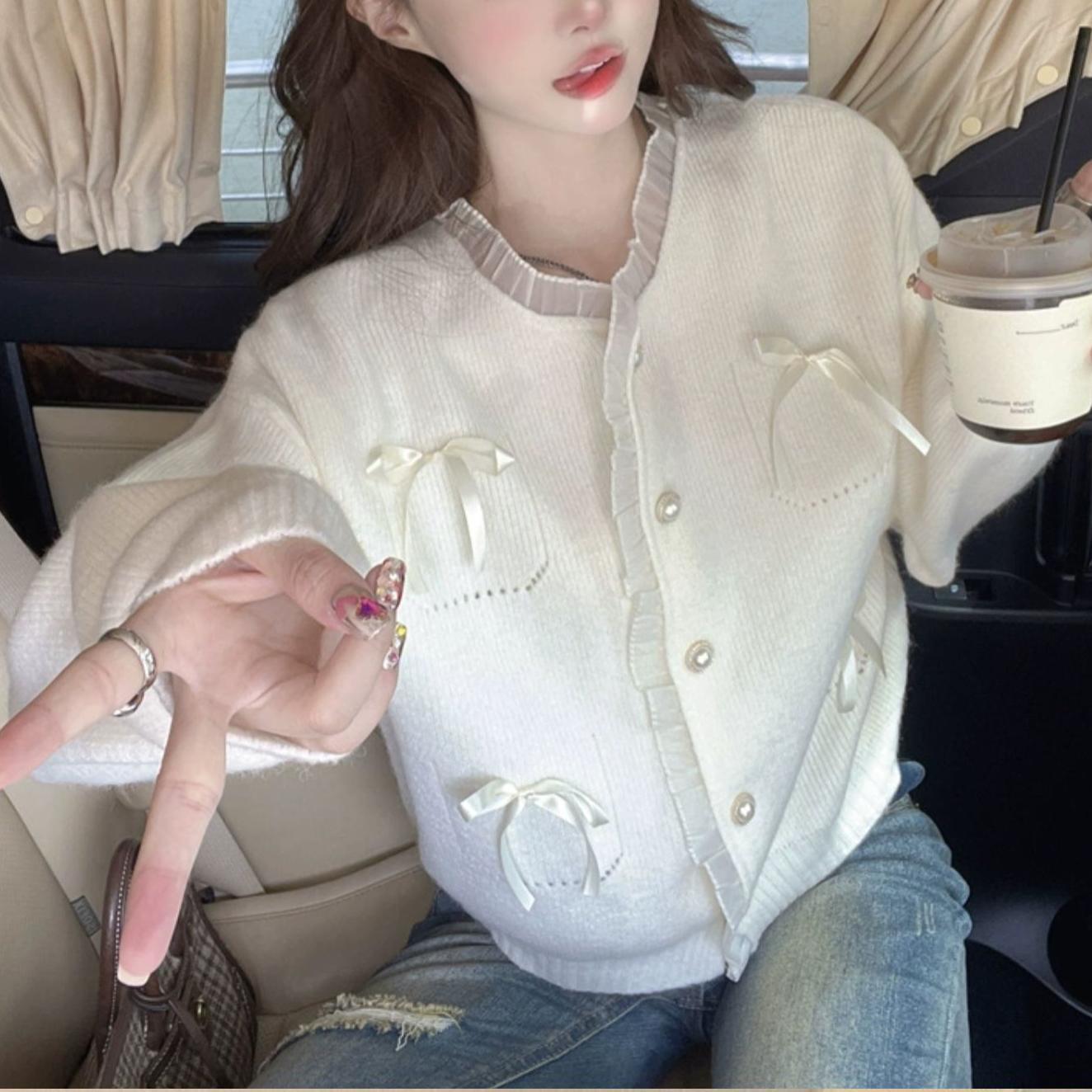 달콤한 스타일 레이스 바느질 긴팔 니트 카디건 여성의 가을 새로운 라운드 넥 나비 니트 카디건 탑스토어 가기