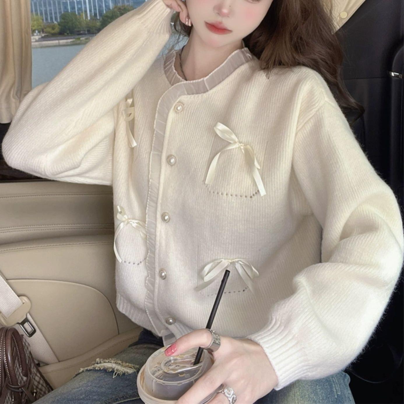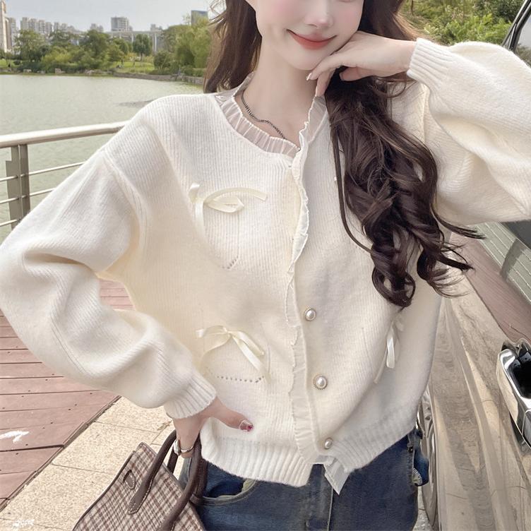 달콤한 스타일 레이스 바느질 긴팔 니트 카디건 여성의 가을 새로운 라운드 넥 나비 니트 카디건 탑