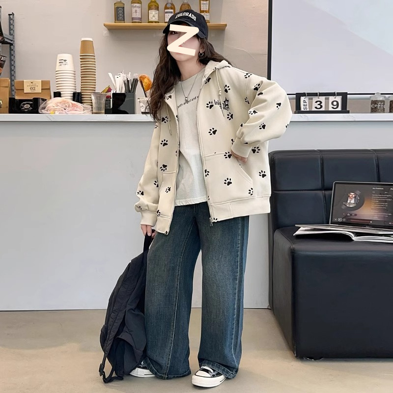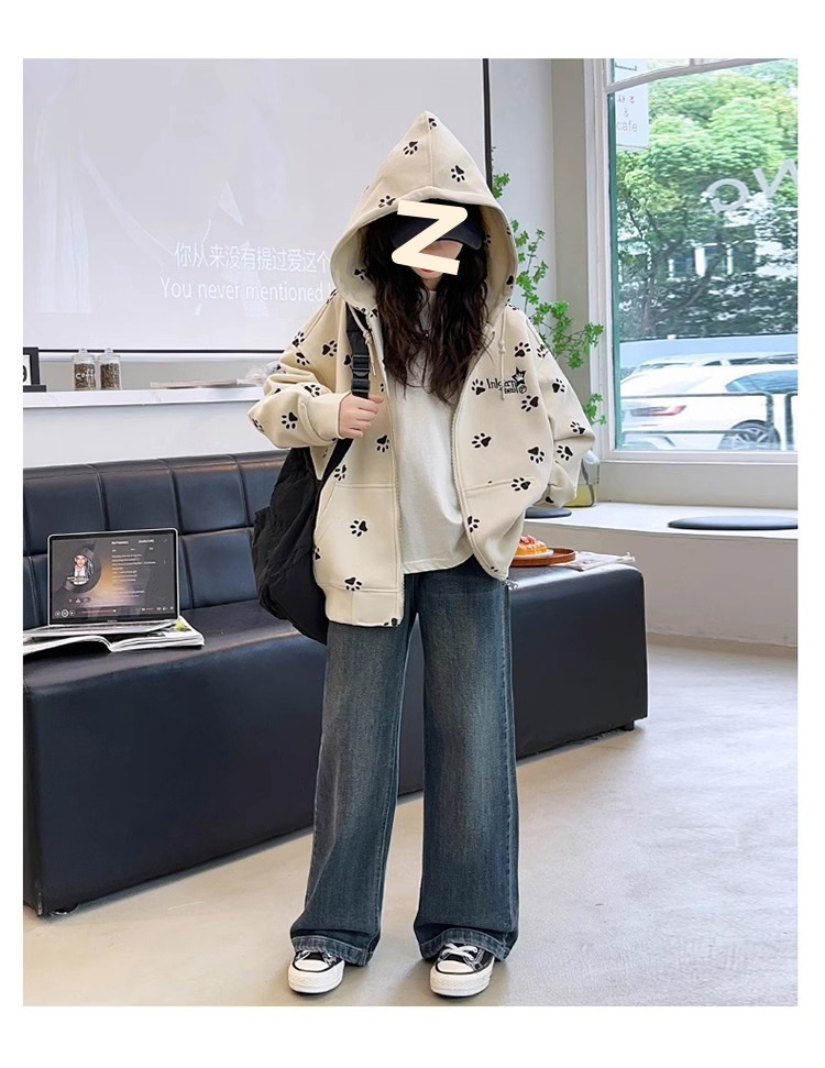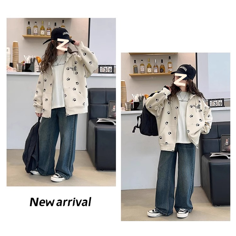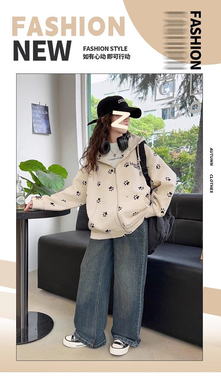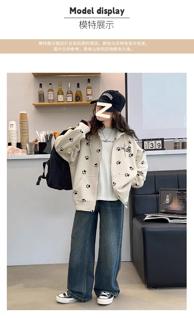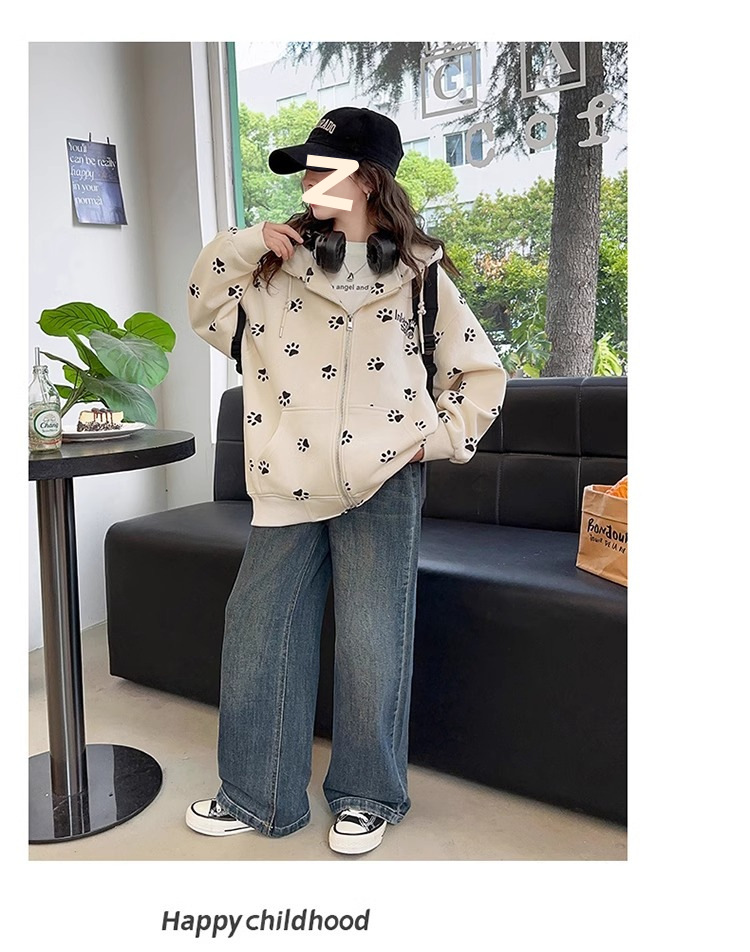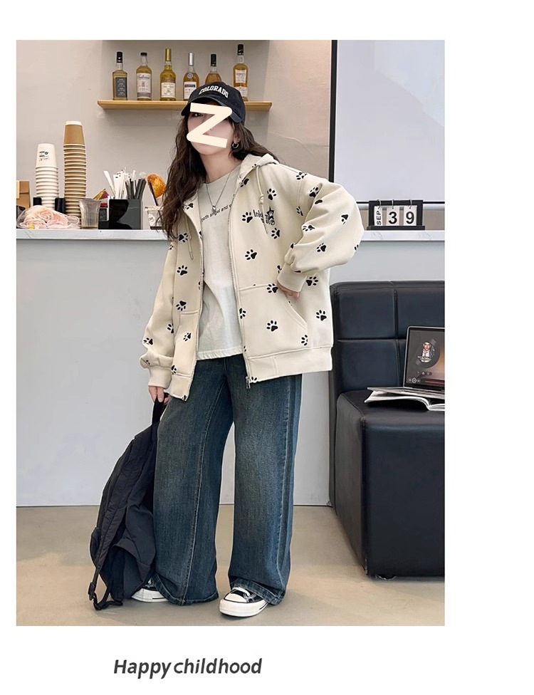 소녀 가을 한국 코트 2024 새로운 큰 키즈 만화 개 포 인쇄 느슨한 후드 카디건 탑스토어 가기