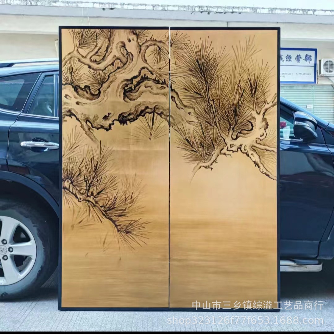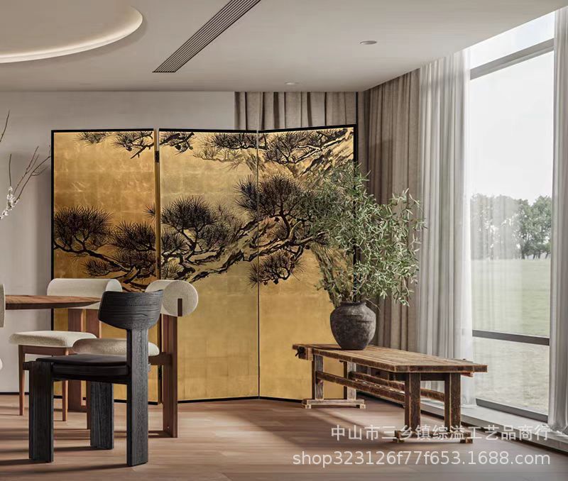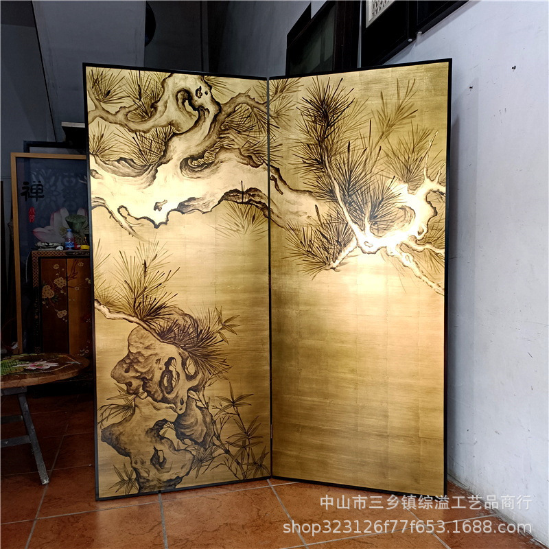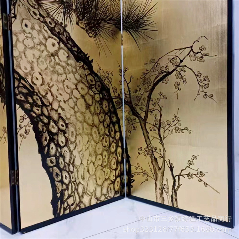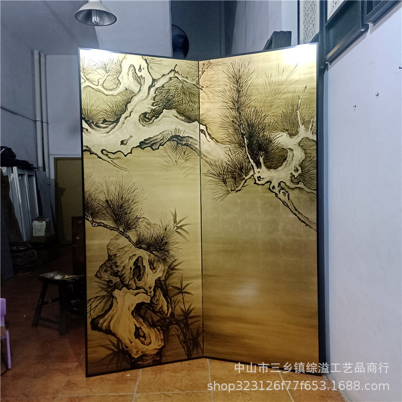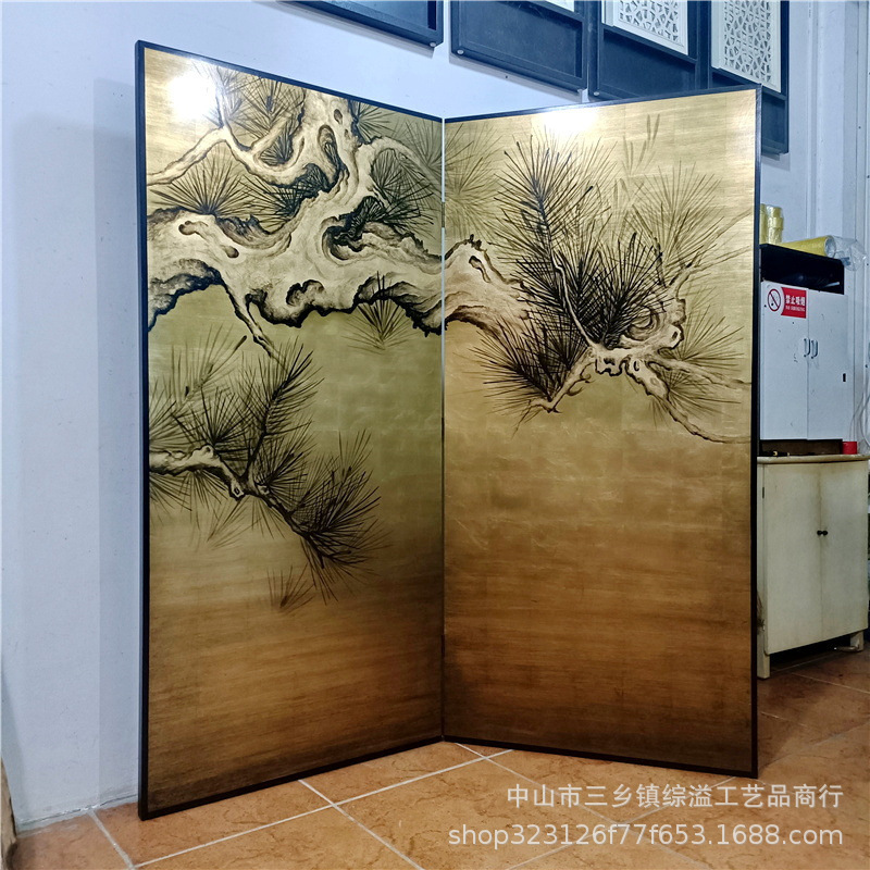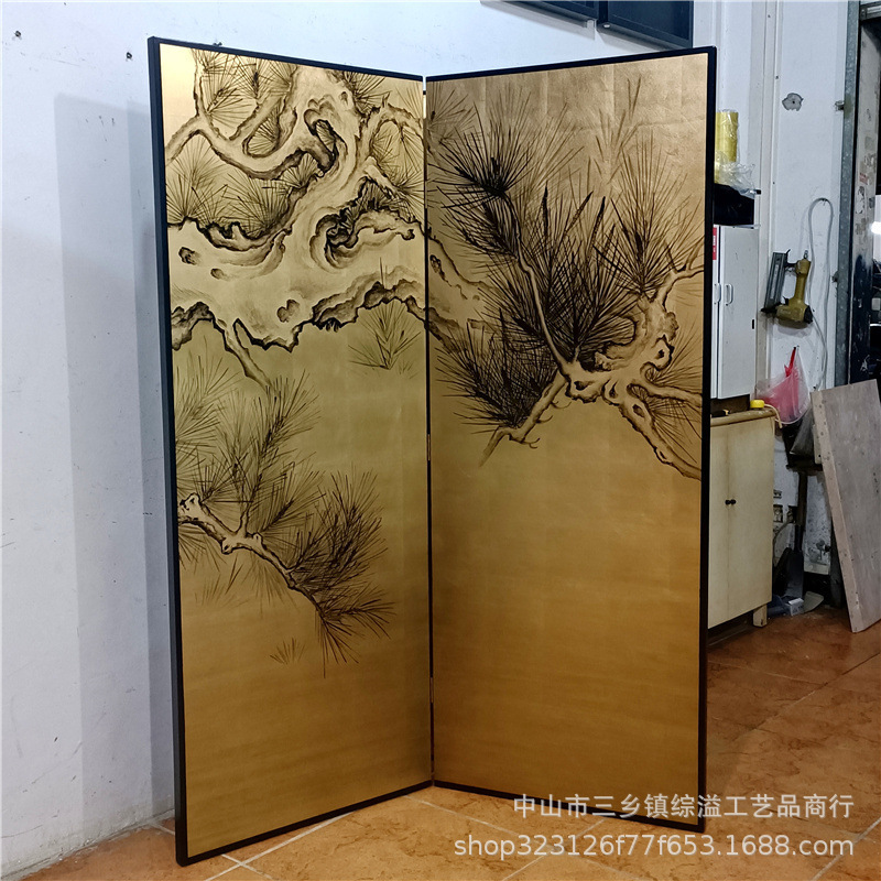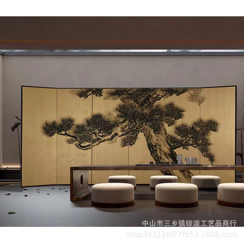 손으로 그린 소나무 고대 소나무 거실 사무실 사진 스튜디오 배경 장식 파티션 접이식 화면 금박 화면스토어 가기