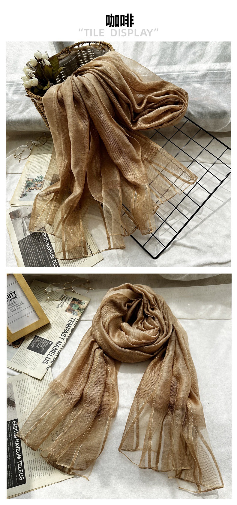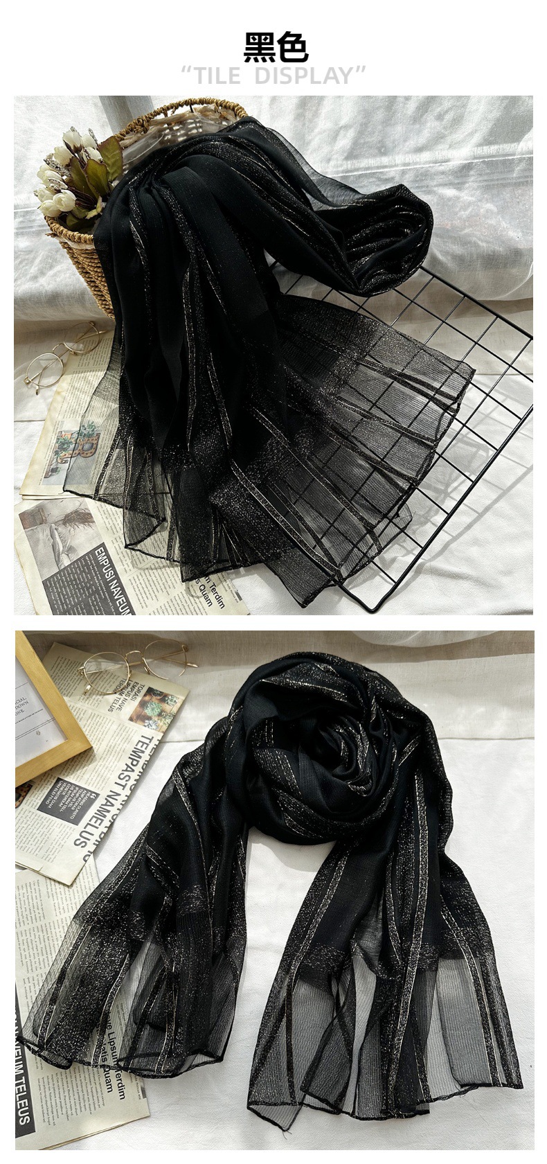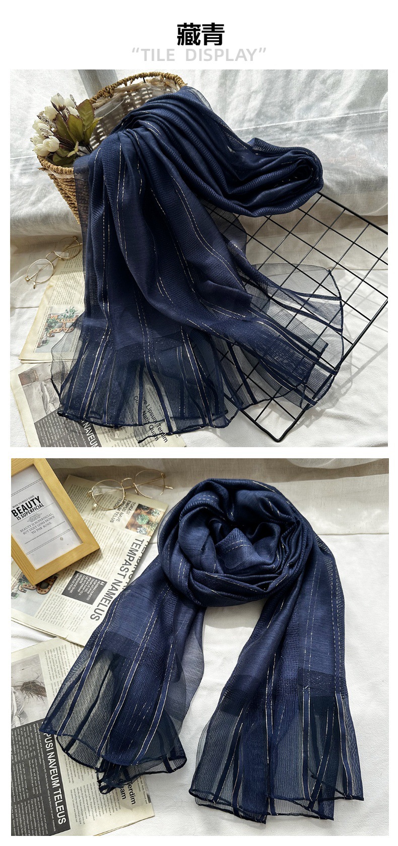 국경 간 실크 스카프 고급 단색 긴 머리 스카프 여성의 새로운 우아한 골드 라인 목도리 빈 스카프스토어 가기
