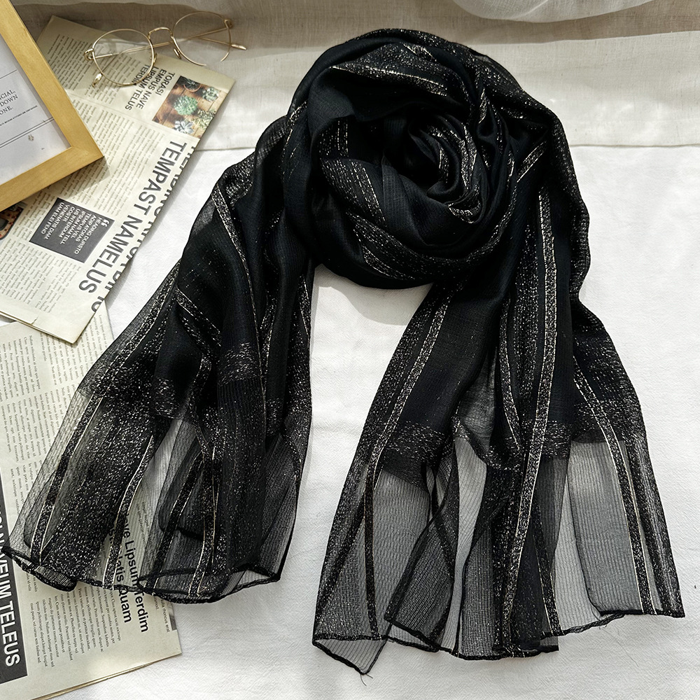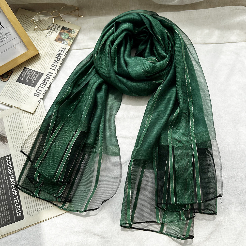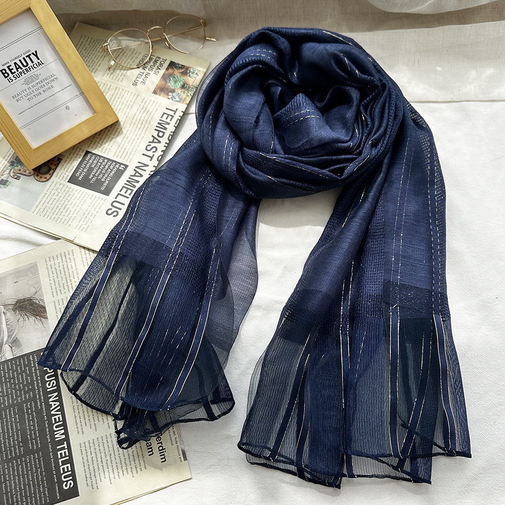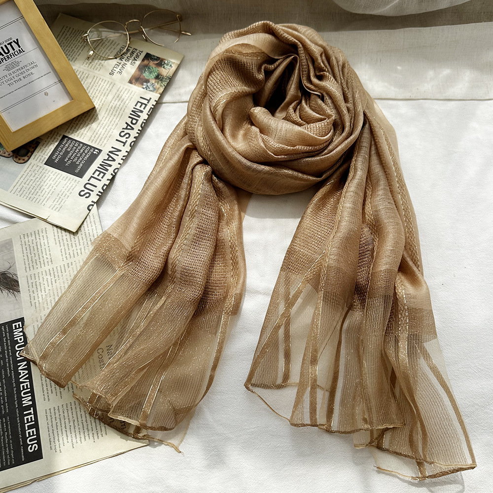 국경 간 실크 스카프 고급 단색 긴 머리 스카프 여성의 새로운 우아한 골드 라인 목도리 빈 스카프