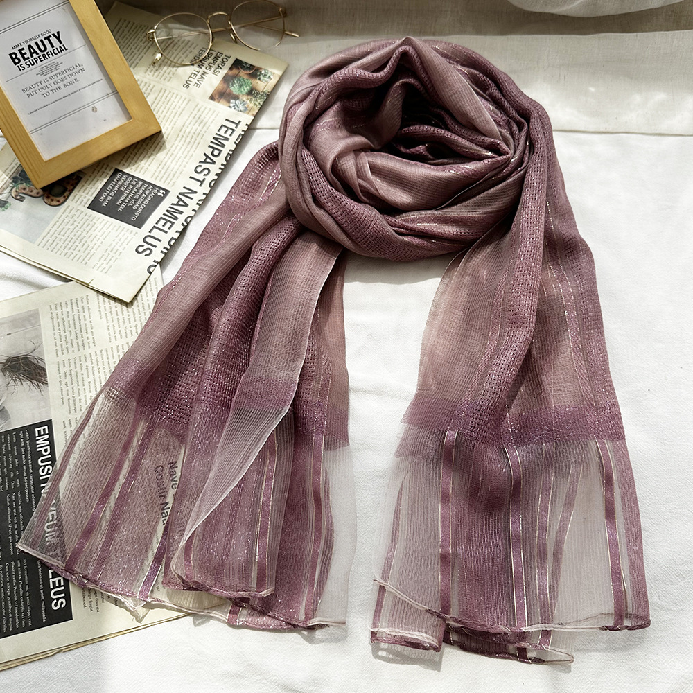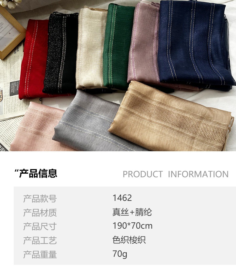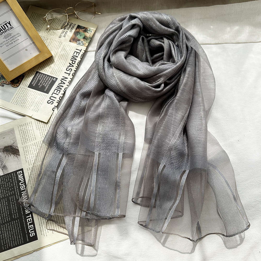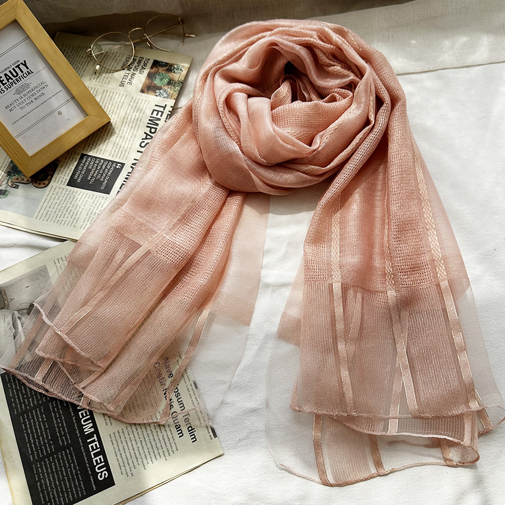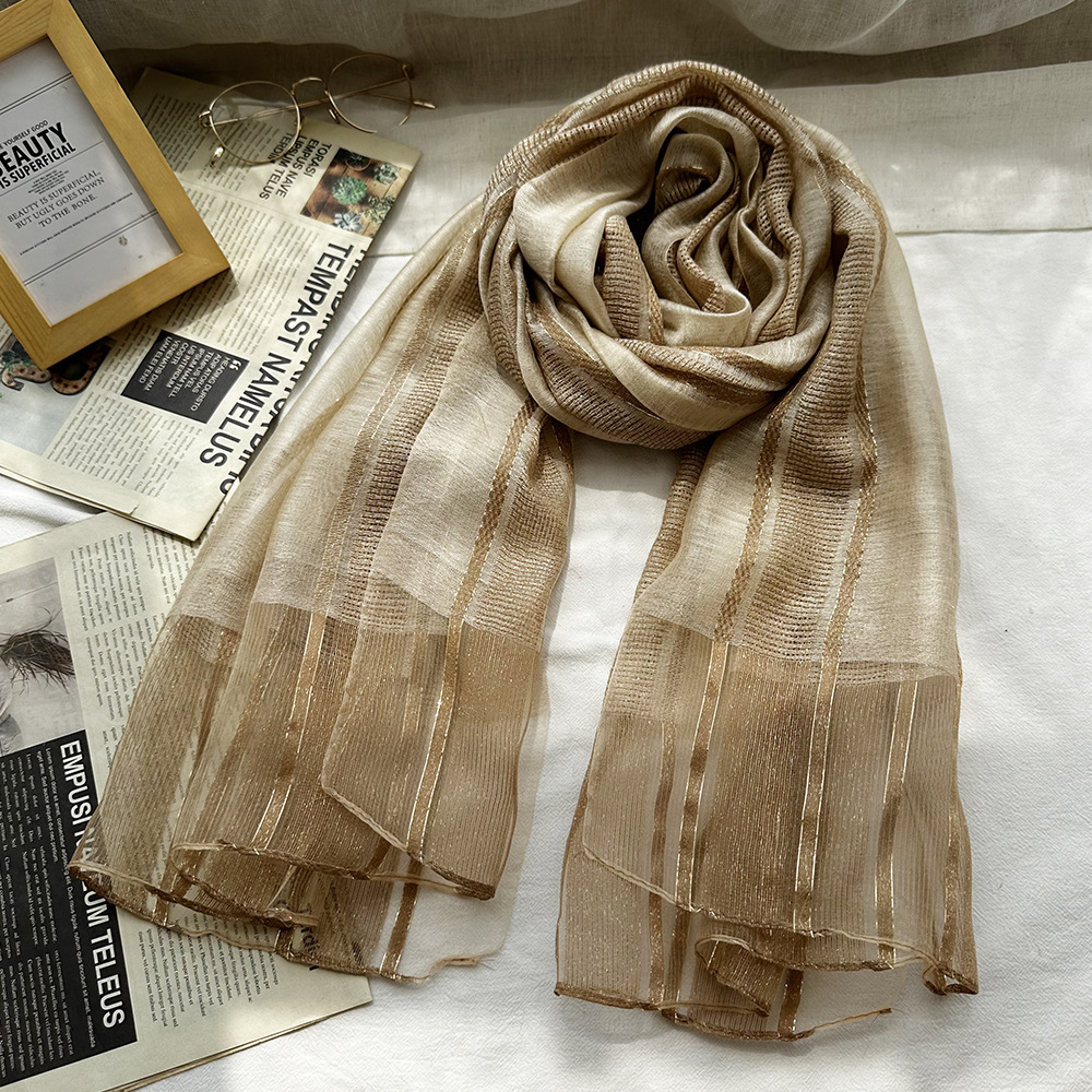 국경 간 실크 스카프 고급 단색 긴 머리 스카프 여성의 새로운 우아한 골드 라인 목도리 빈 스카프