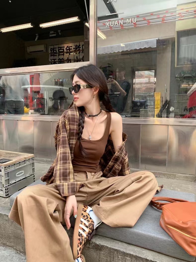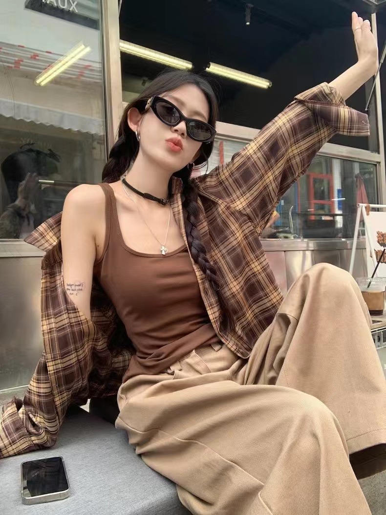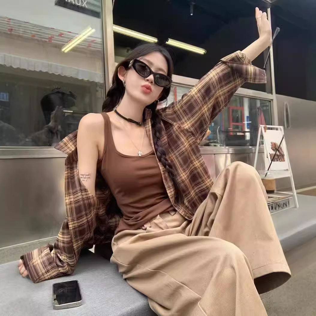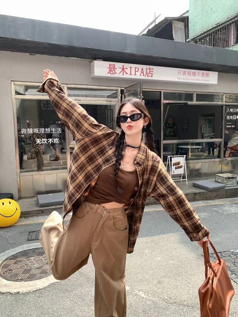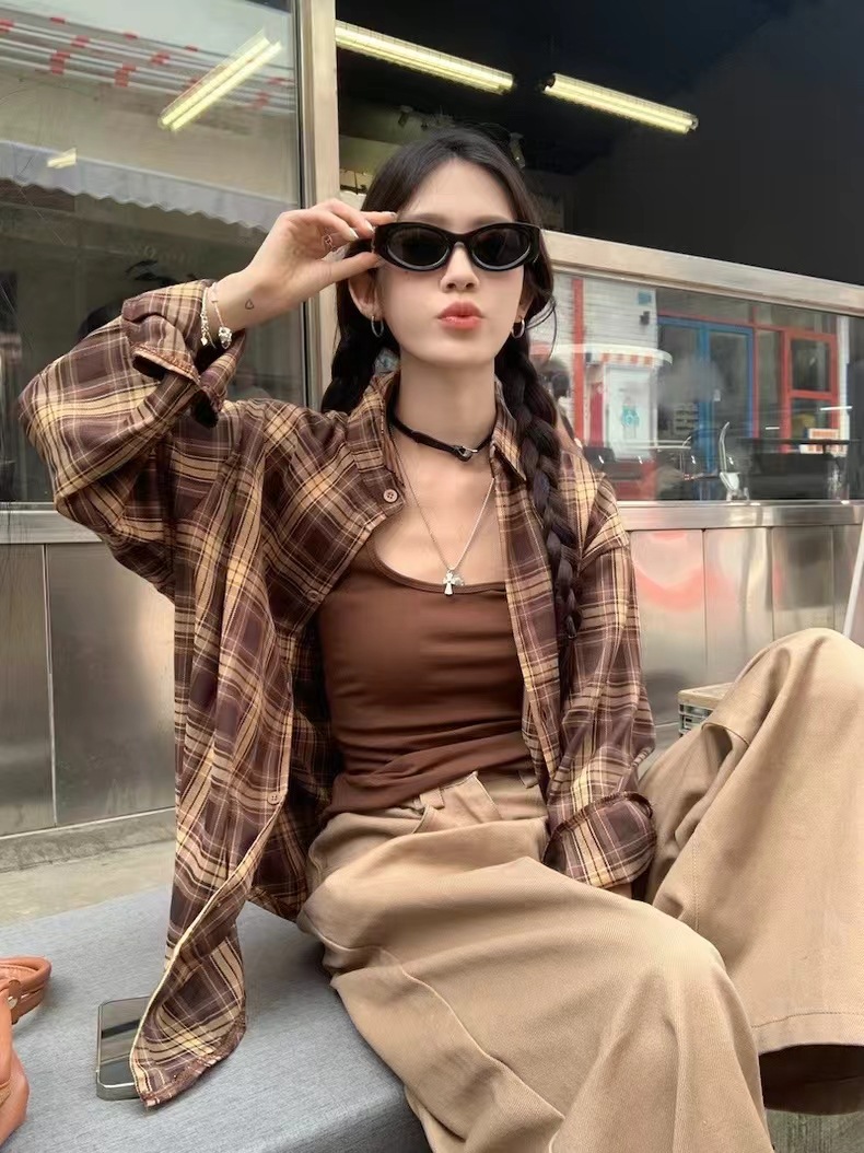 아메리칸 레트로 브라운 체크 무늬 셔츠 여성 카디건 재킷 봄, 가을, 여름 하이 엔드 느슨한 자외선 차단제 얇은 셔츠스토어 가기