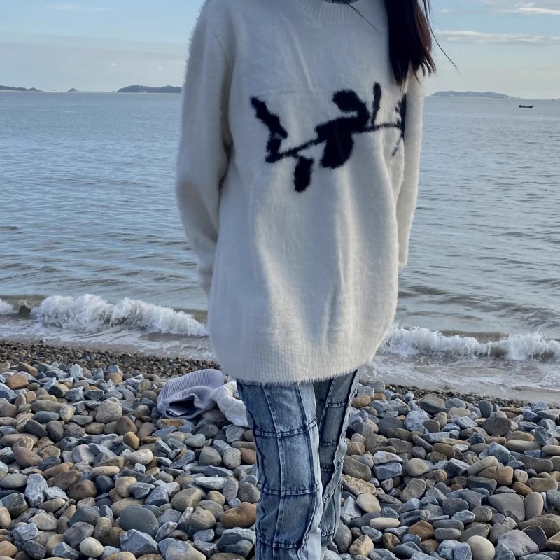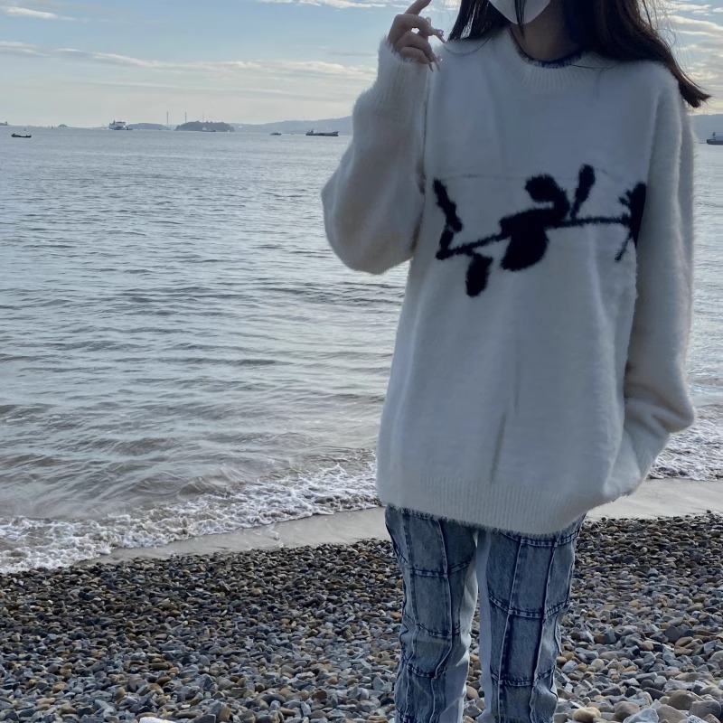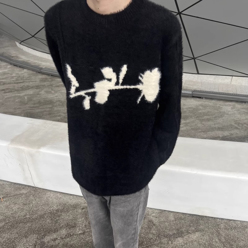 가을과 겨울 새로운 하이 엔드 다크 스타일 로즈 자카드 스웨터 남성 디자인 센스 클린 핏 루즈 니트 탑