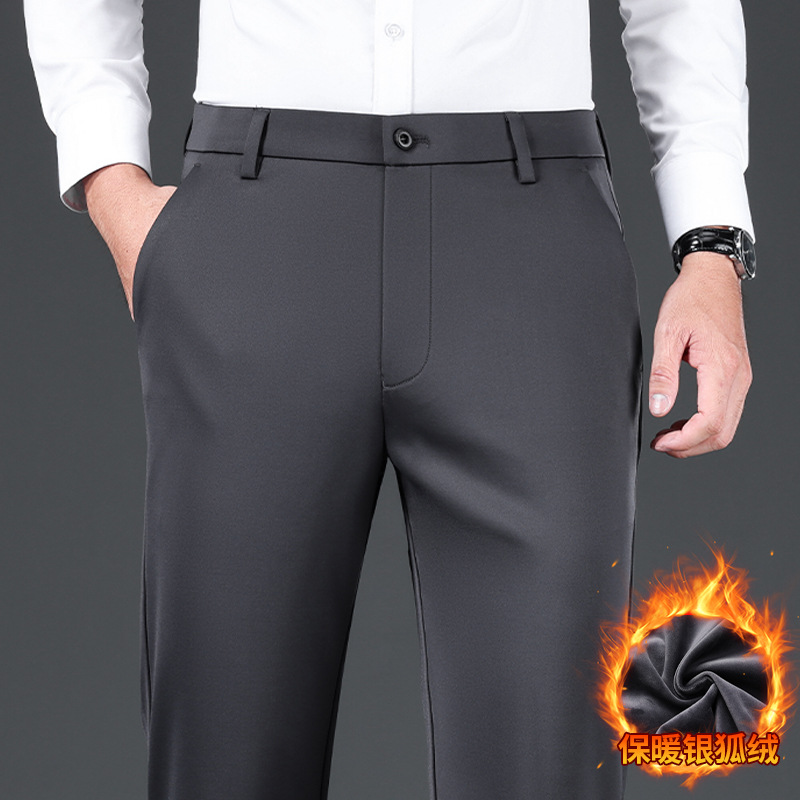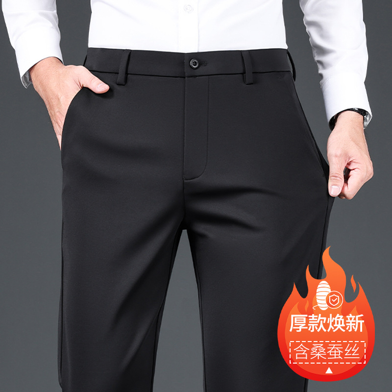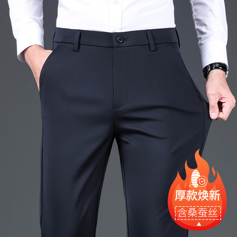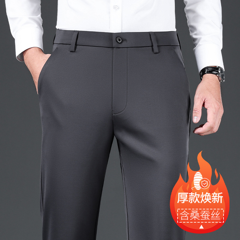 2025 가을 겨울 기모 실크 혼방 캐주얼 팬츠 남성 비즈니스 중하이웨이스트 스트레이트 엘라스틱 정장 바지 남성 바지스토어 가기