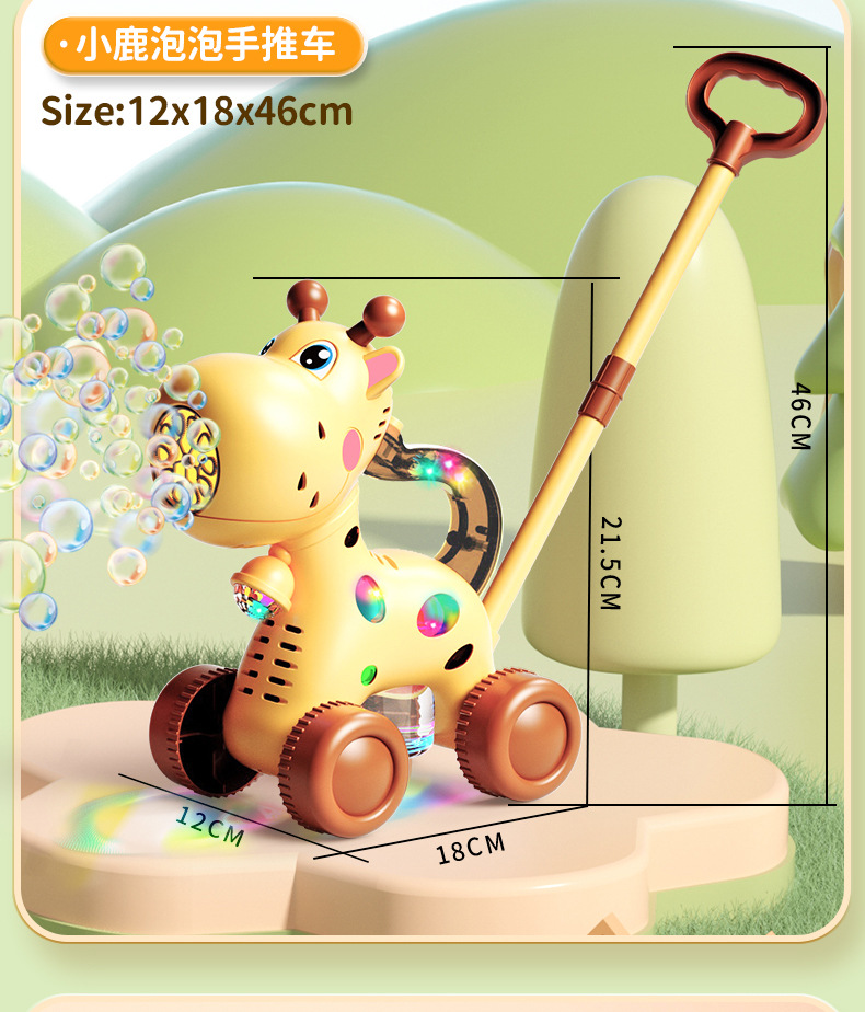 어린이 만화 사슴 모양 손으로 밀어주는 버블 머신 유아용 푸시카 2-in-1 전동 버블카 조명 야외 장난감스토어 가기