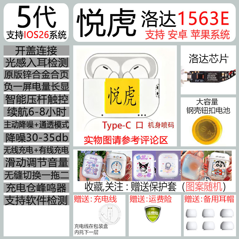 • 5세대 pro2 상위 버전: Yuehu 1563E + 능동형 소음 감소 35db + 투명도 + 무선 충전 + 슬라이딩 볼륨 조정 + 버저