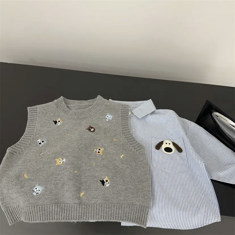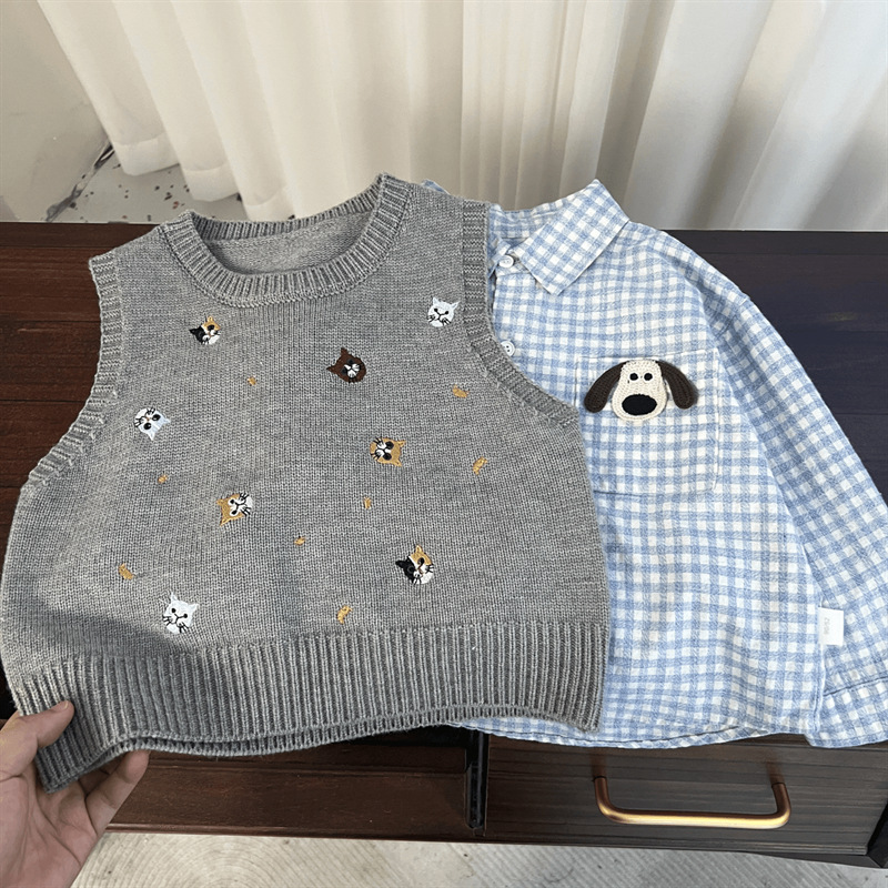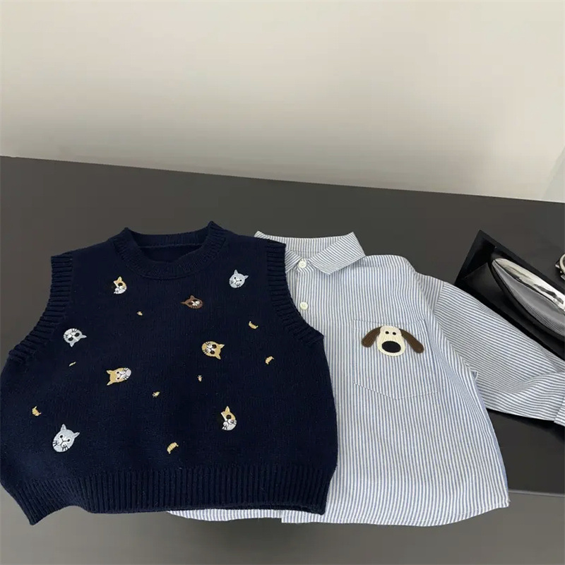 남아용 2025 봄 신상 만화 캐릭터 회색 조끼와 파란색 체크무늬 강아지 셔츠 패션 투피스 세트스토어 가기