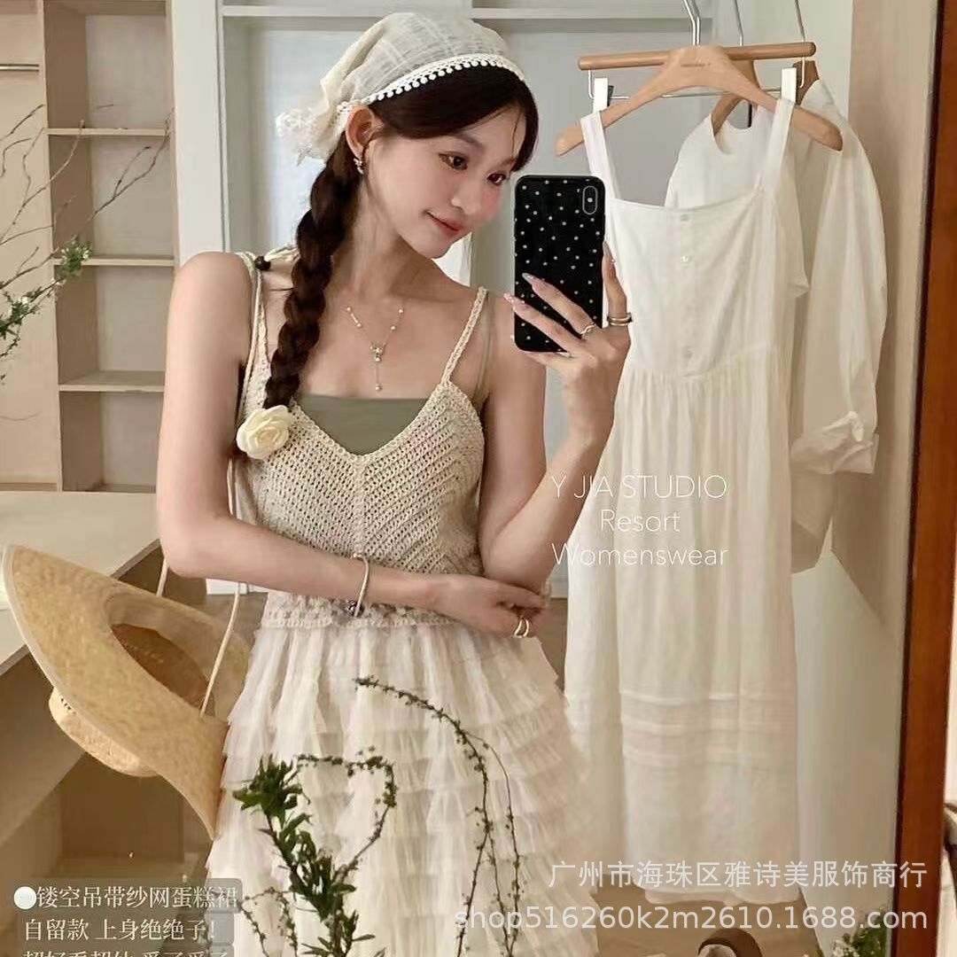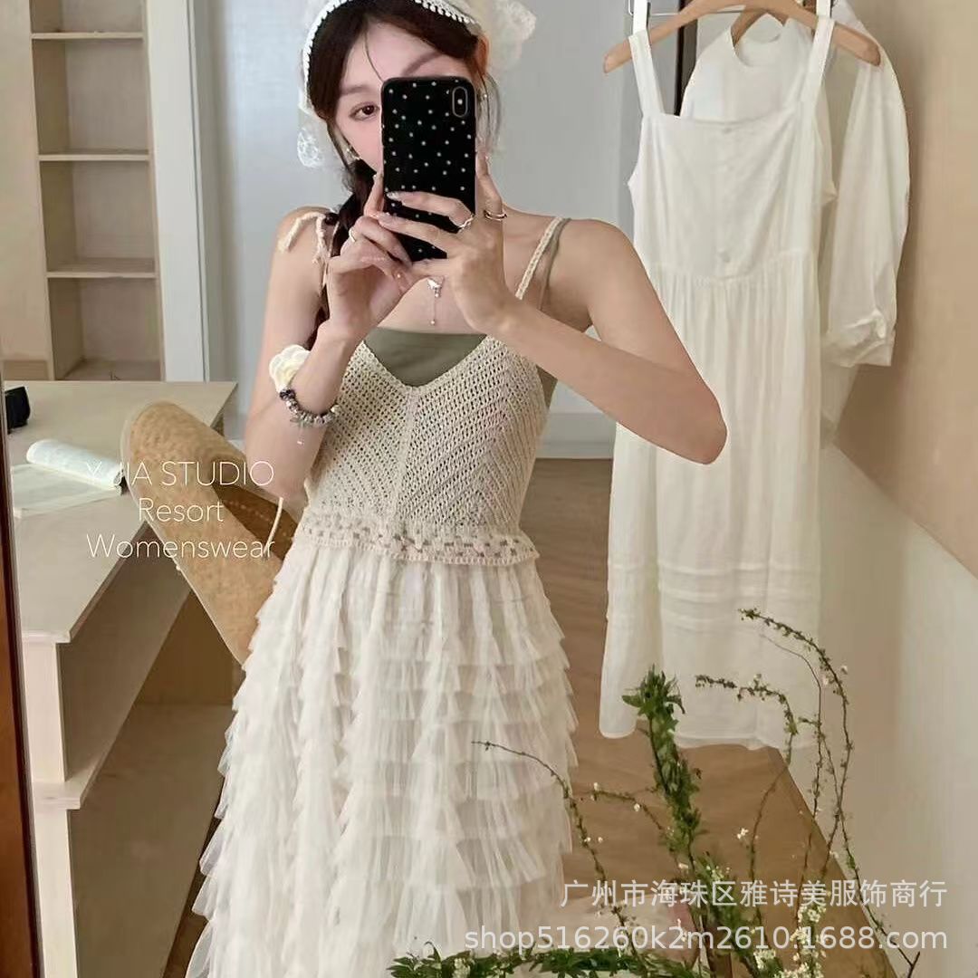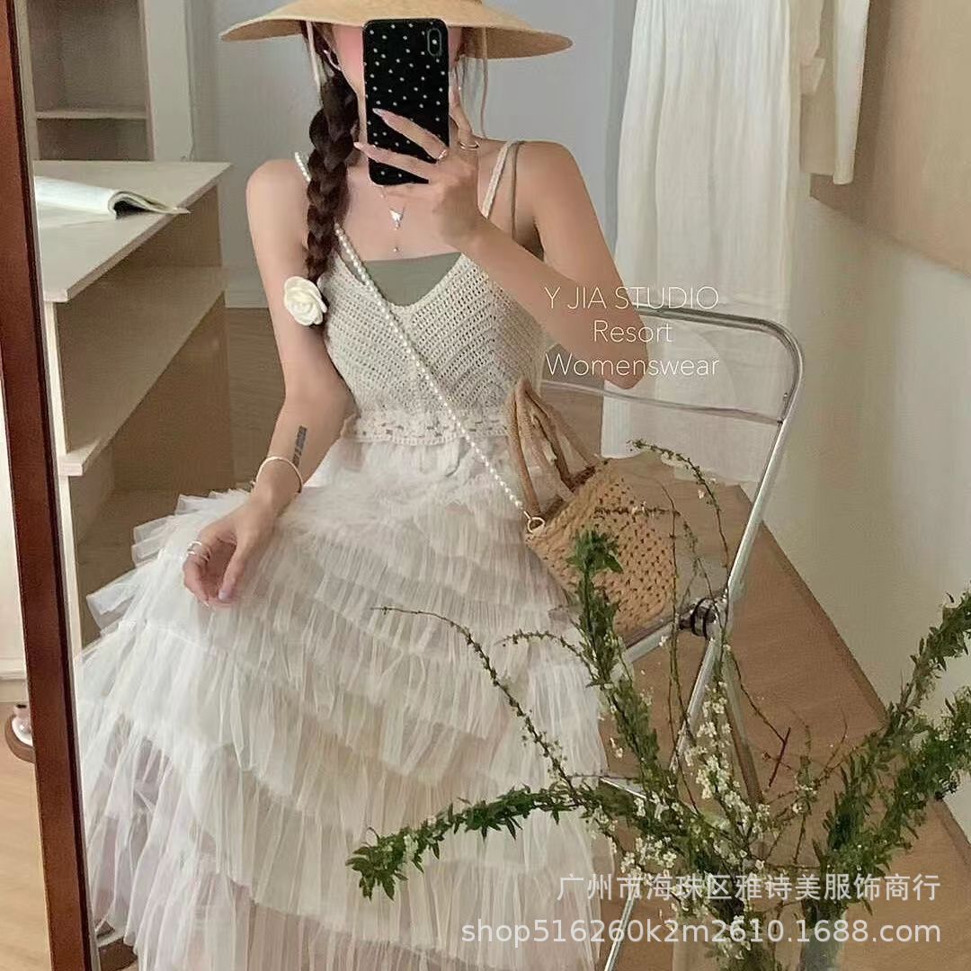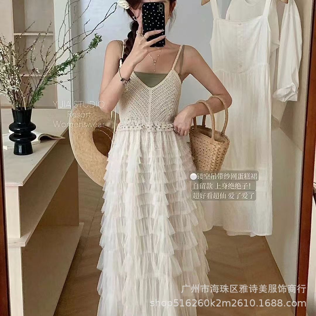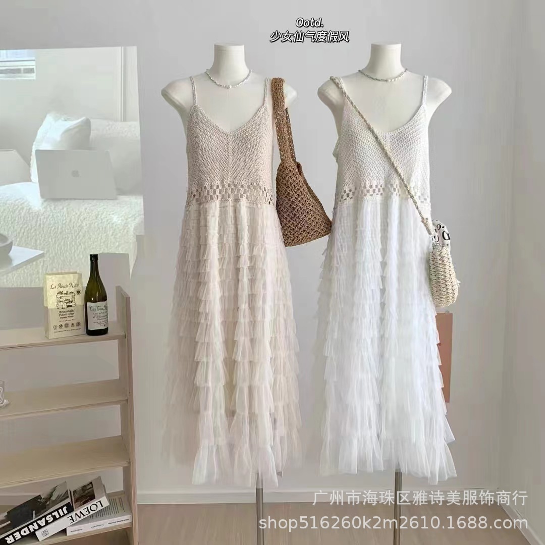 여름 새로운 부드러운 스타일 V-Neck 할로우 니트 스티칭 레이어 별 케이크 메쉬 중장 슬링 원피스 여성스토어 가기