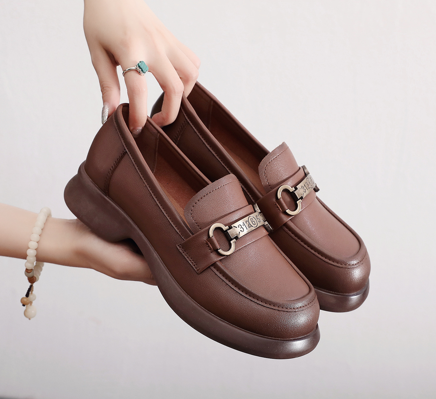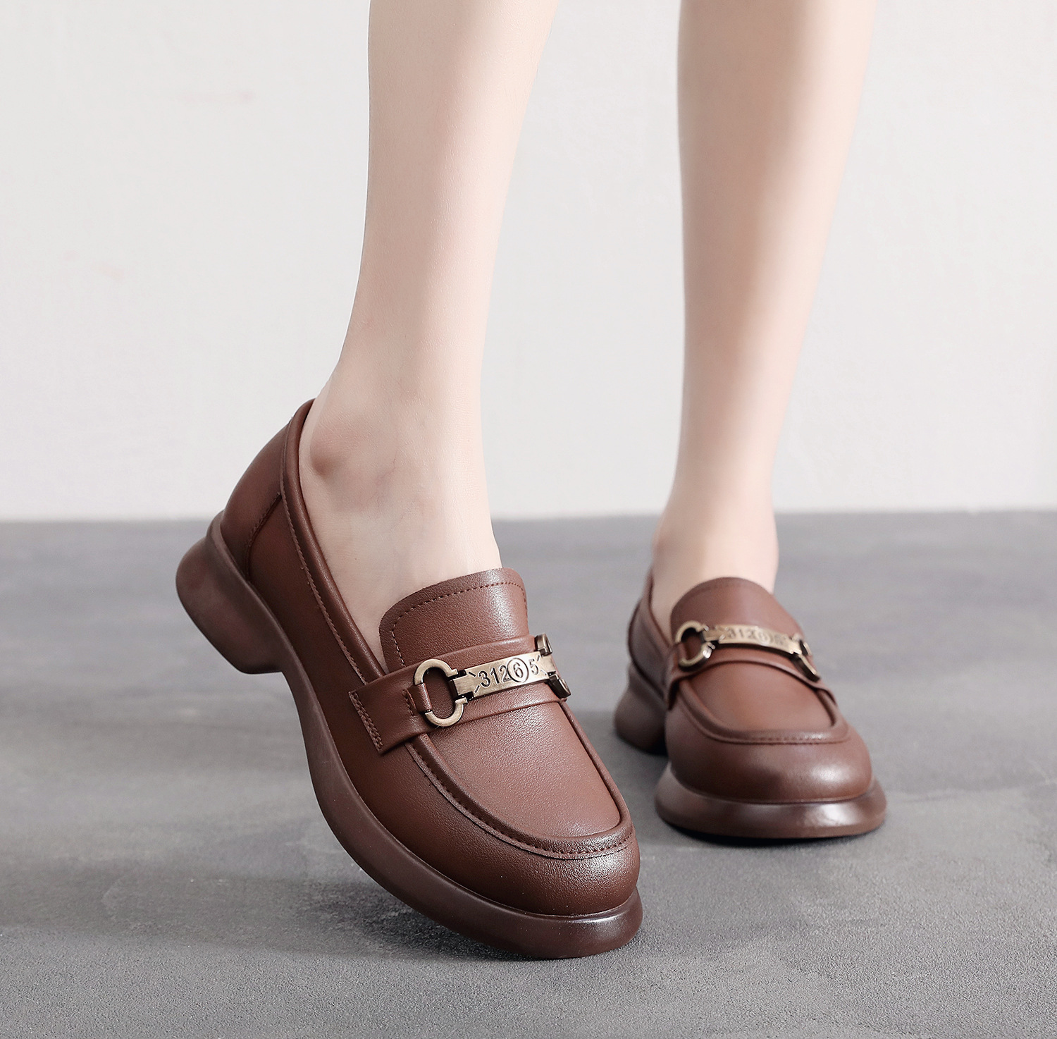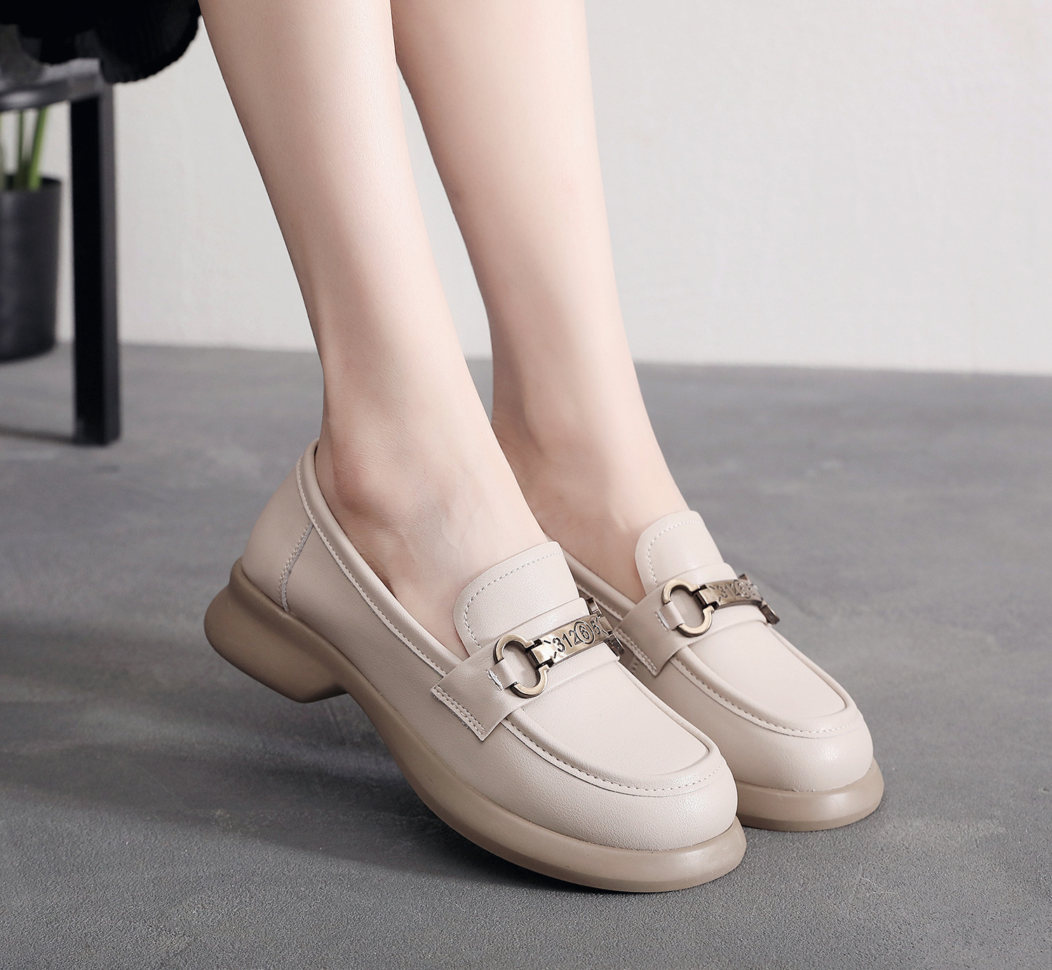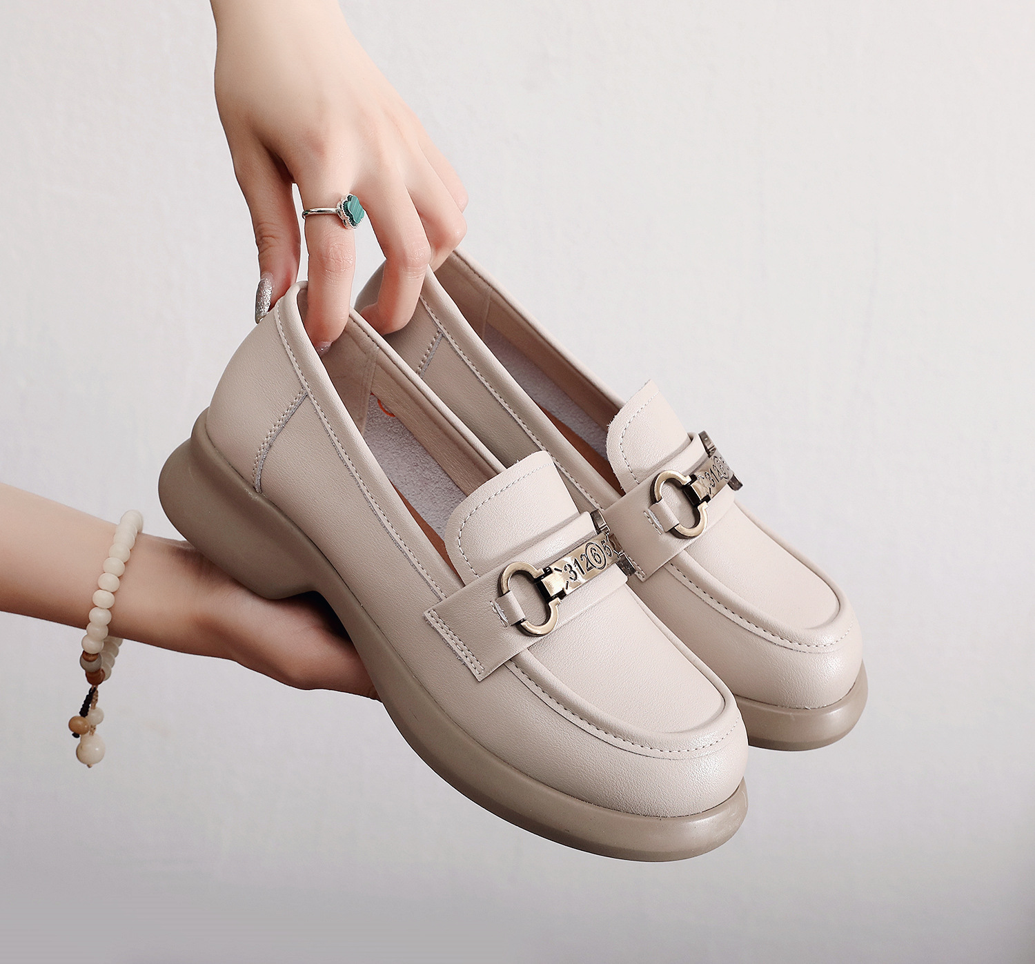 2024년 봄 여성용 천연 가죽 슬립온 부드러운 밑창 로퍼 소가죽 라운드 토 버클 장식 캐주얼 가죽 신발 낮은 굽