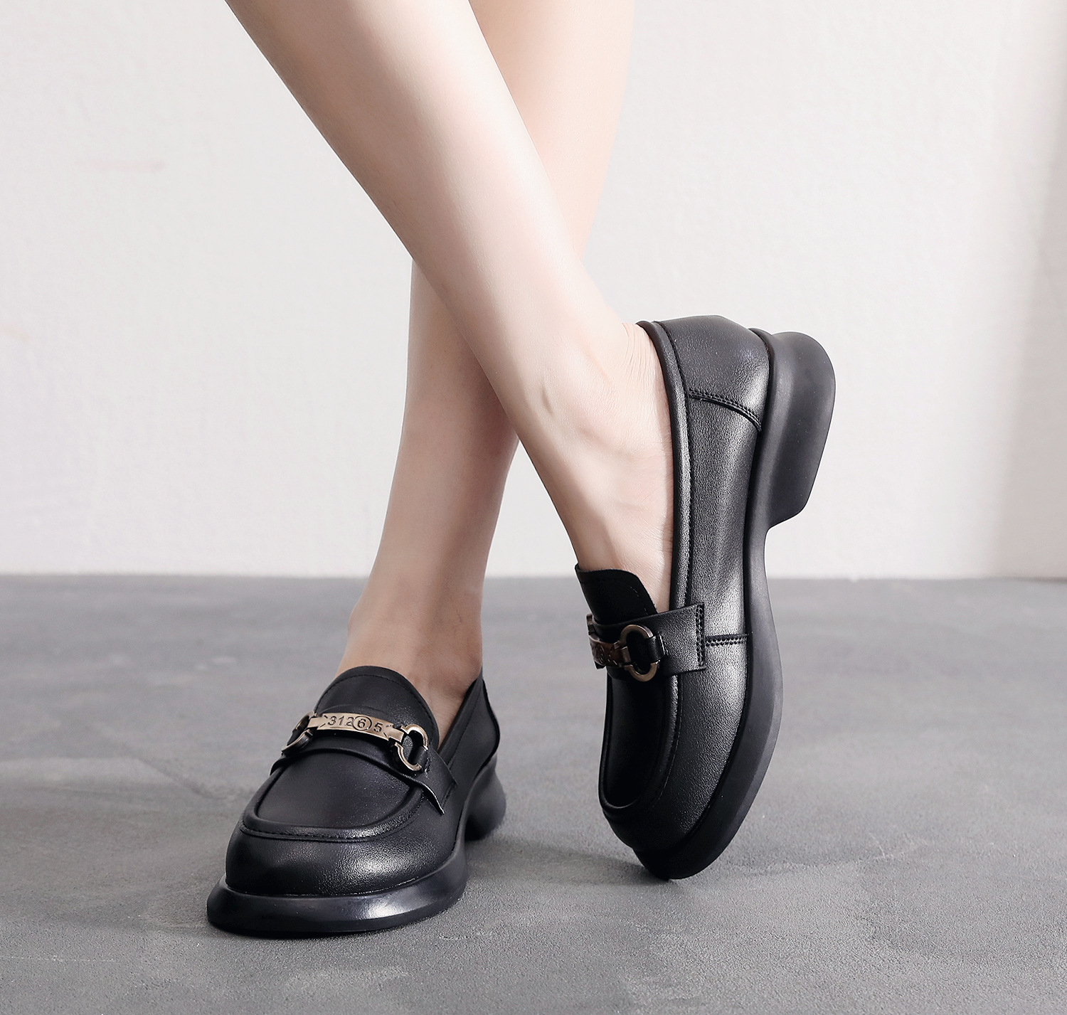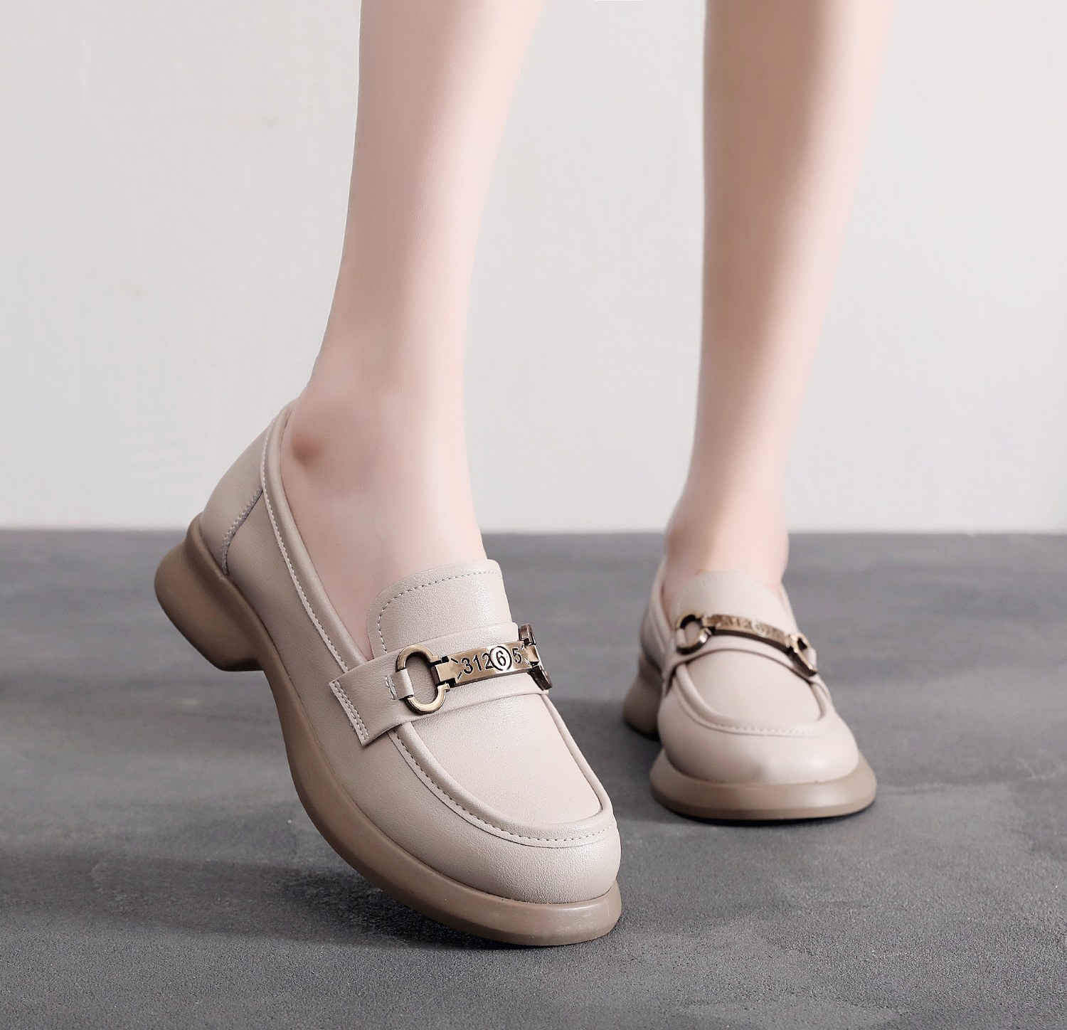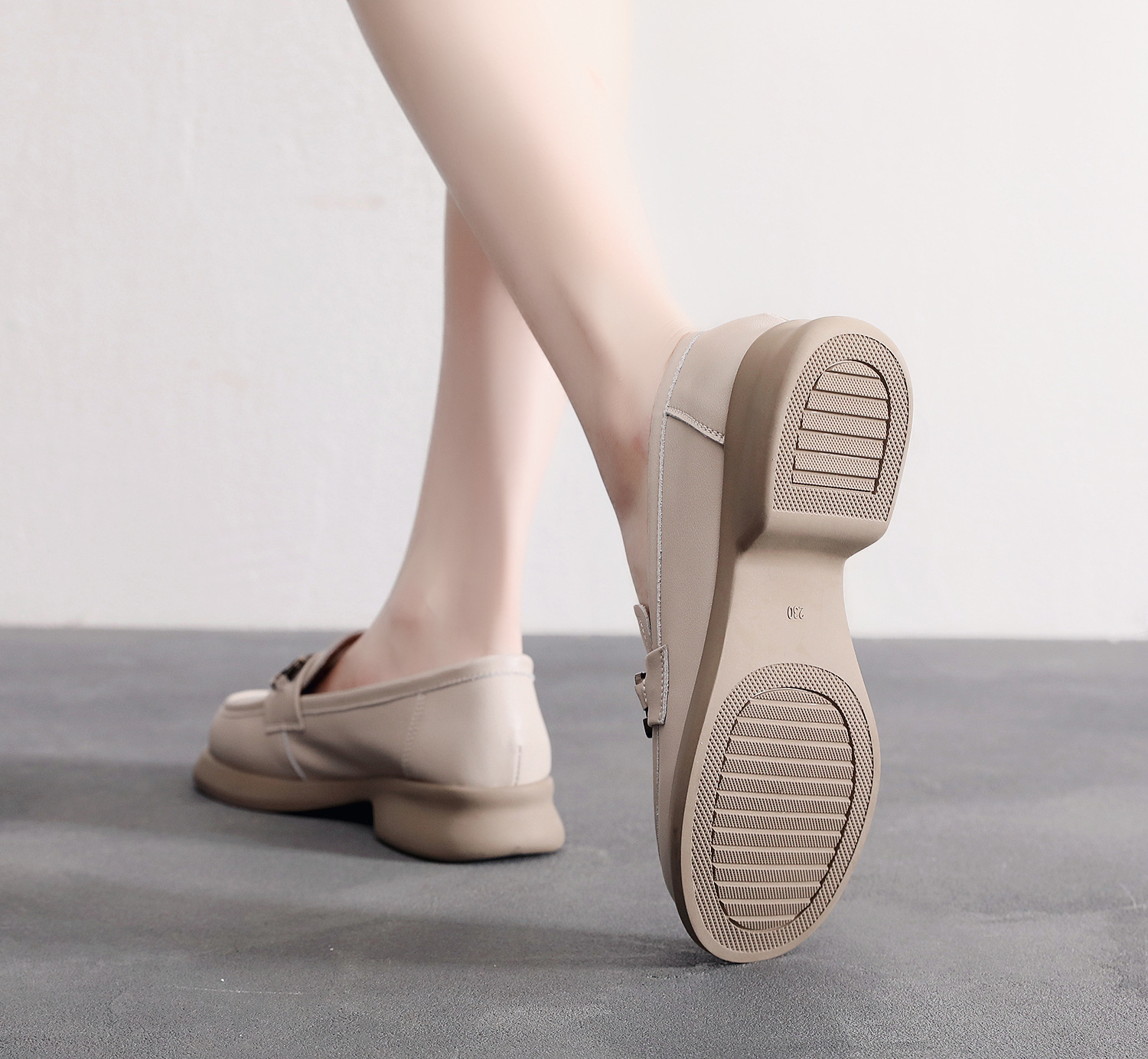 2024년 봄 여성용 천연 가죽 슬립온 부드러운 밑창 로퍼 소가죽 라운드 토 버클 장식 캐주얼 가죽 신발 낮은 굽