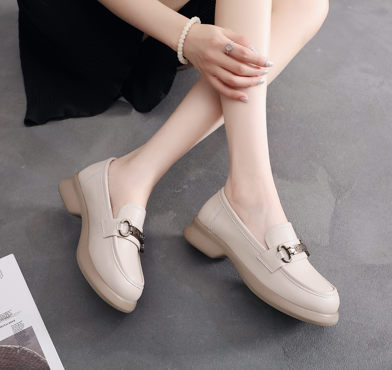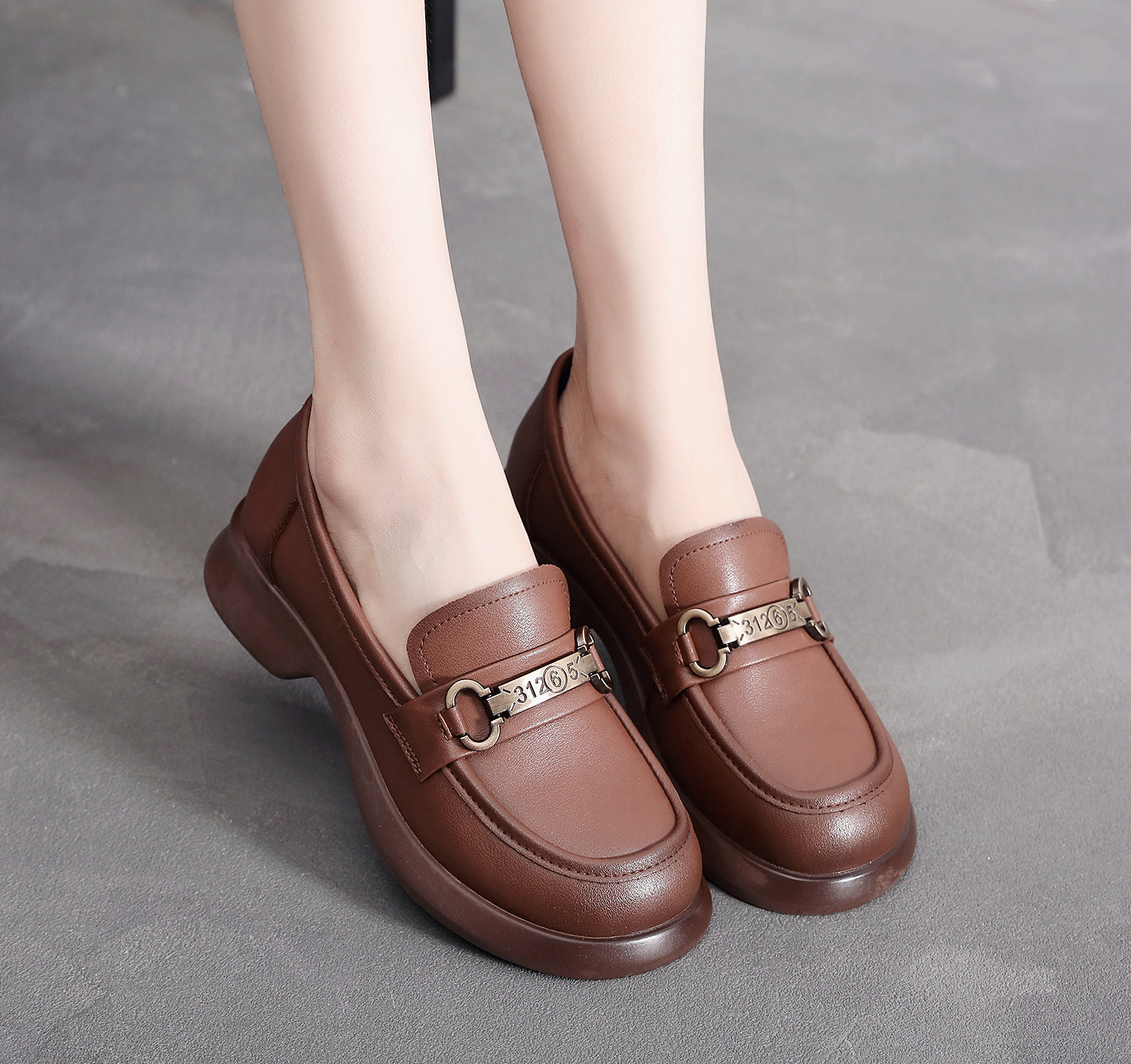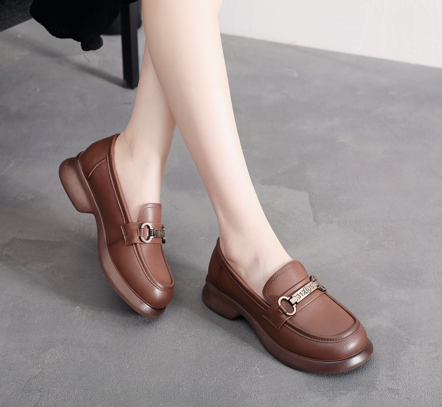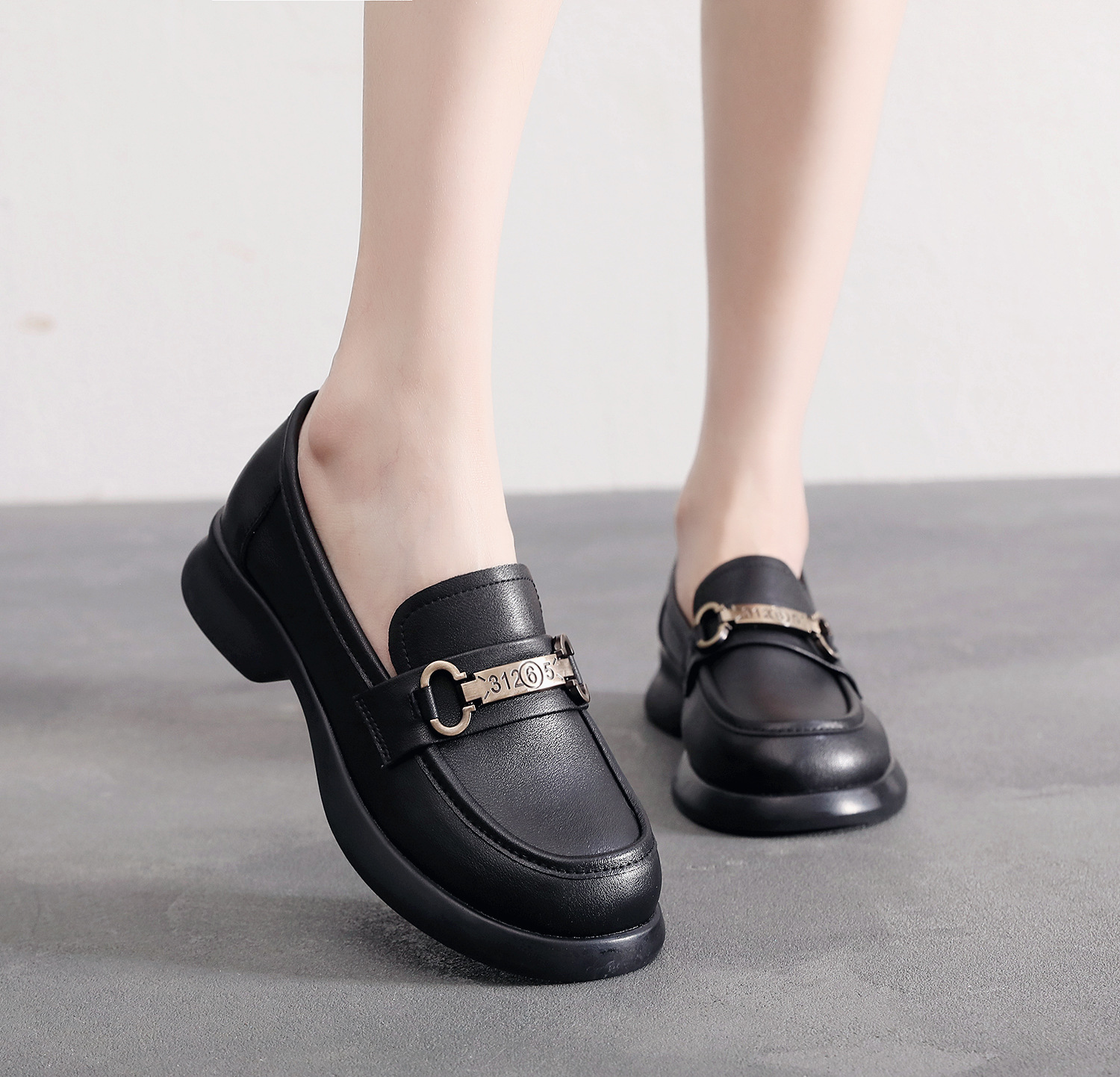 2024년 봄 여성용 천연 가죽 슬립온 부드러운 밑창 로퍼 소가죽 라운드 토 버클 장식 캐주얼 가죽 신발 낮은 굽