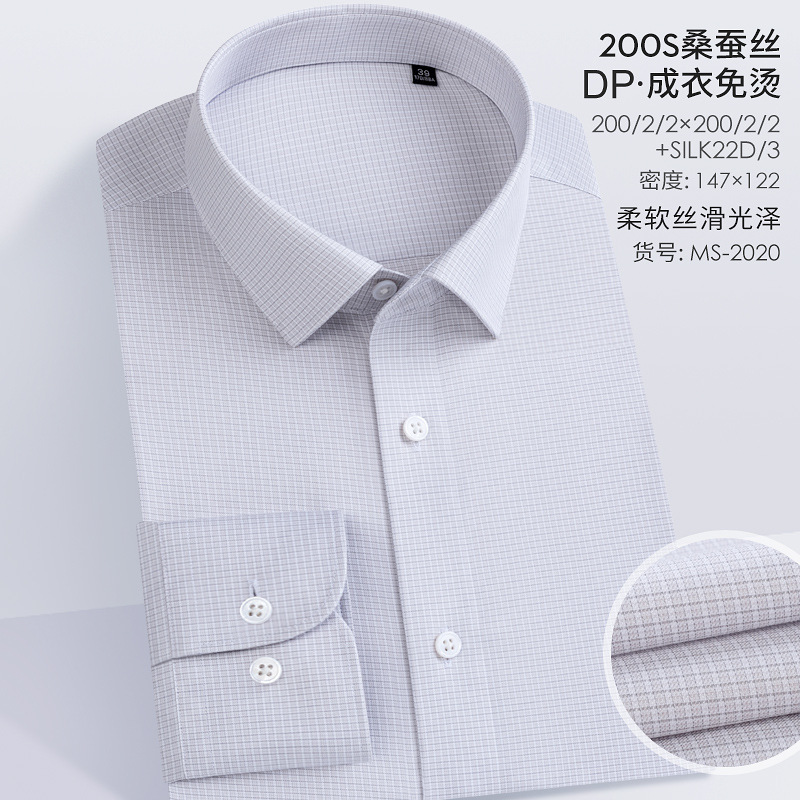 200S 면 실크 남성 긴팔 셔츠 신상 고급 비즈니스 남성복 기성복 다림질 필요 없는 체크무늬 정장 셔츠