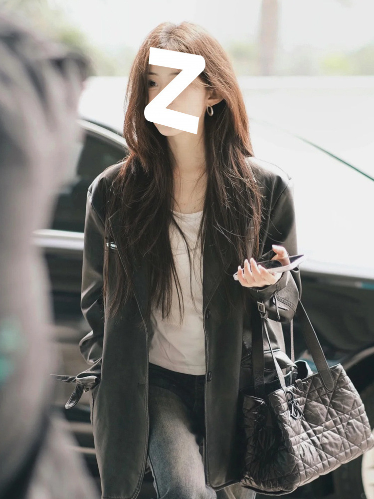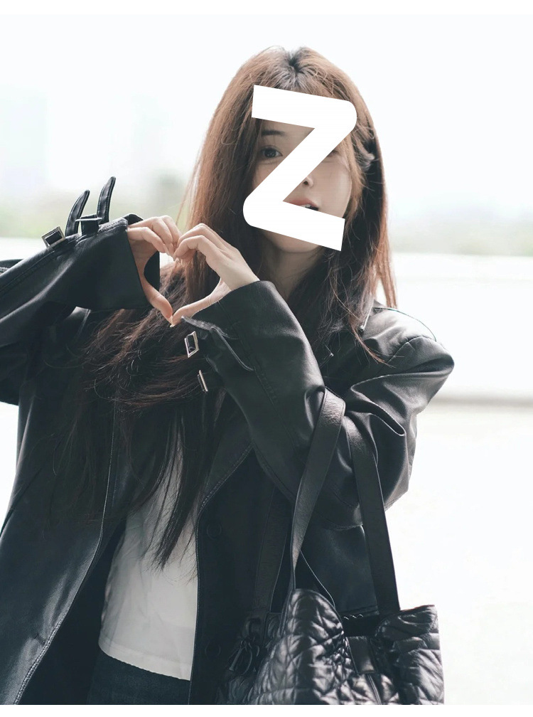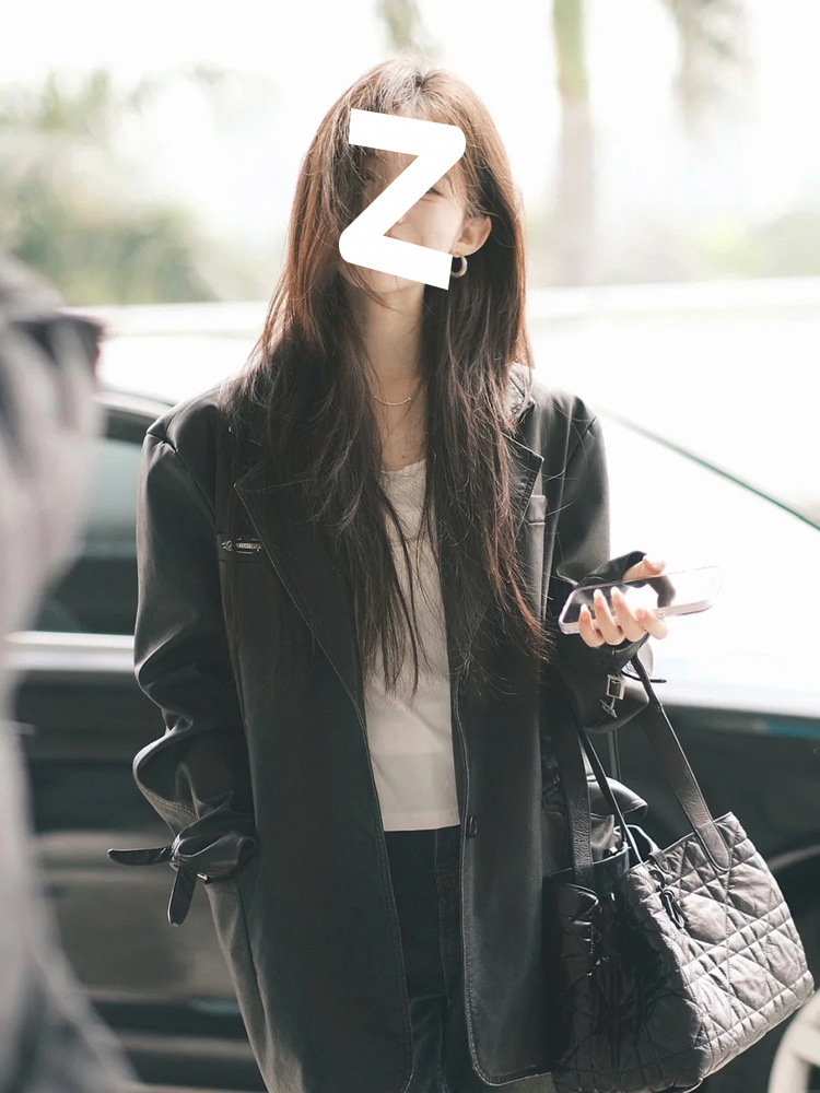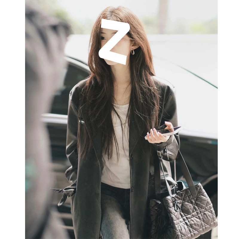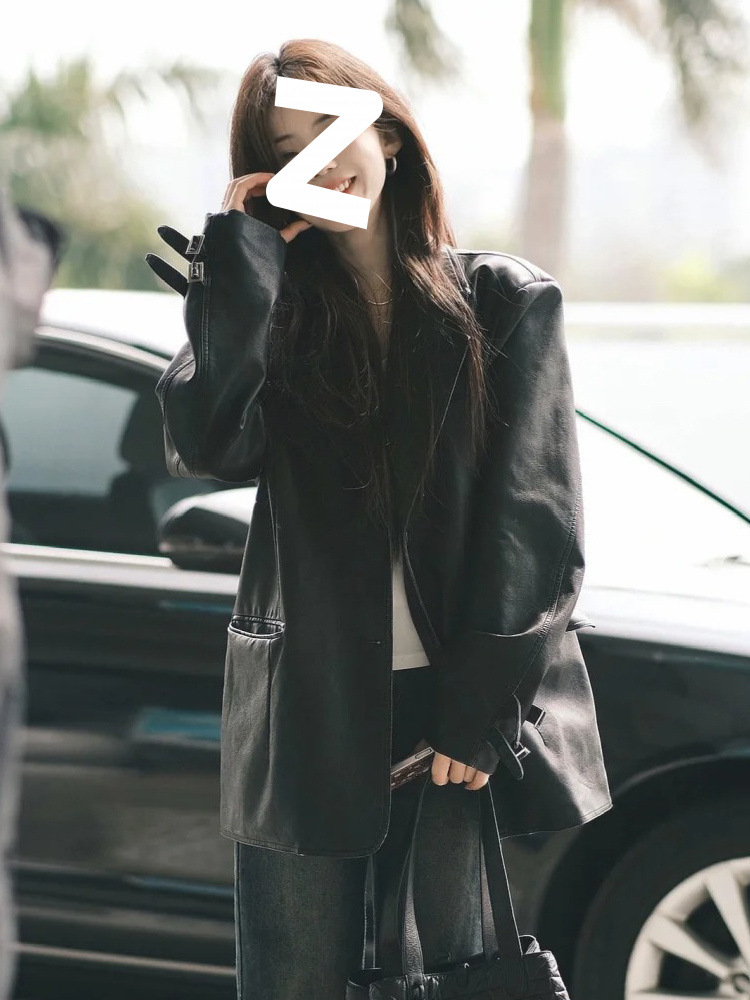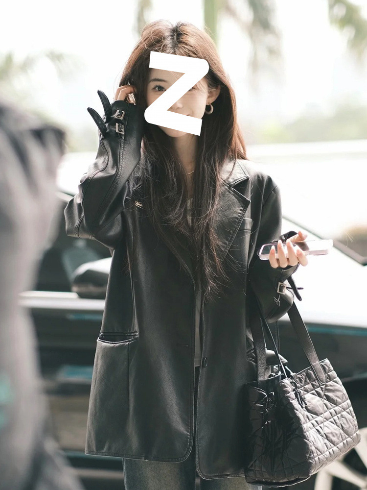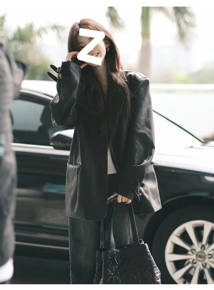 검은 중간 길이 가죽 코트 여성의 2024 봄과 가을 새로운 폭발 독특한 외부 재킷 작은 오토바이스토어 가기