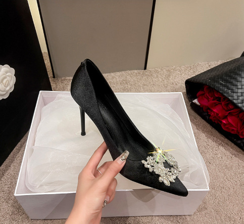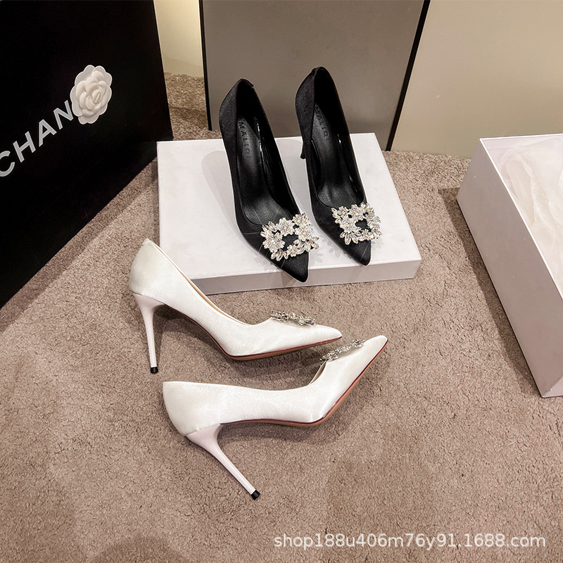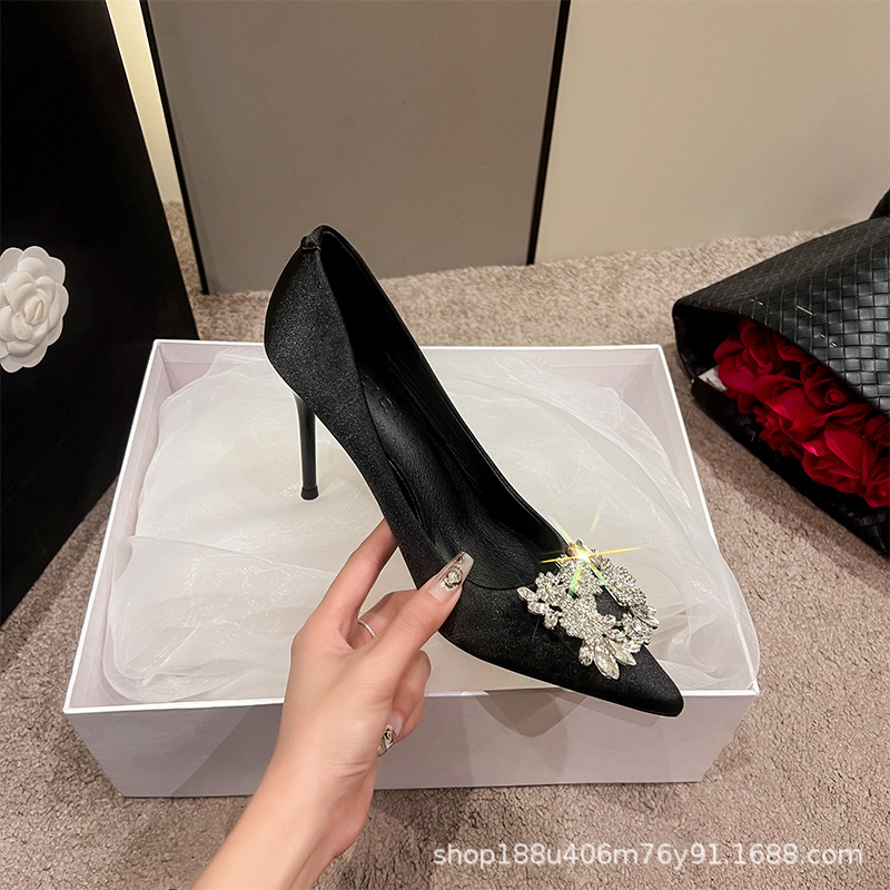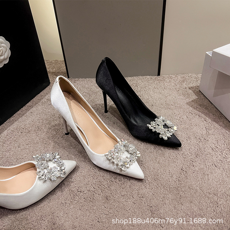 [재고 있음] 샴페인 색상 하이힐 여성용 2025 신상 뾰족코 얇은 굽 우아한 프렌치 스타일 크리스탈 실크 새틴 구두 웨딩용스토어 가기