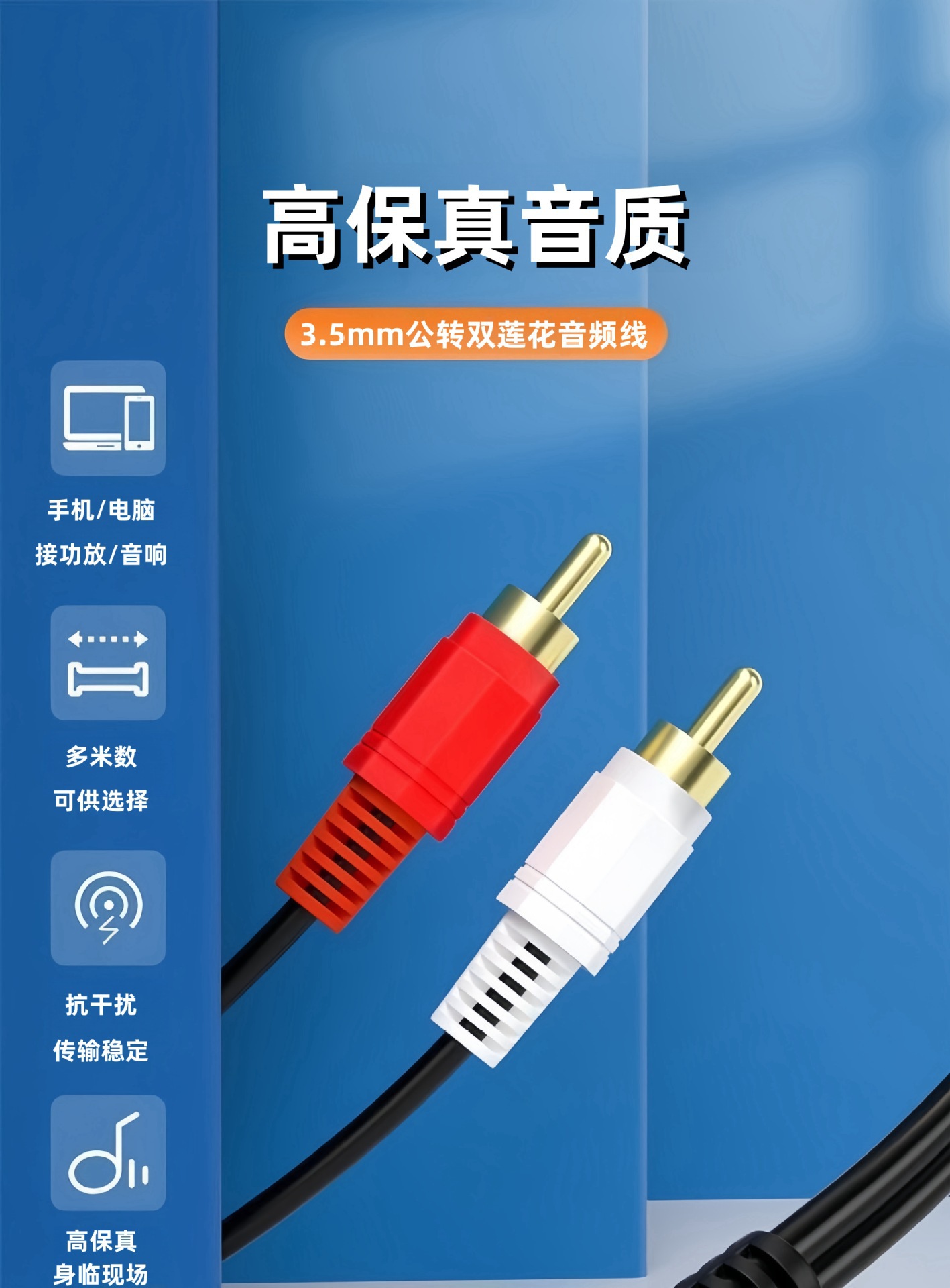 用途:适用于计算机,MP3 DVD CD机 电视机 收音机 电脑与功放 音箱之间的连接并传输它们的音频信号