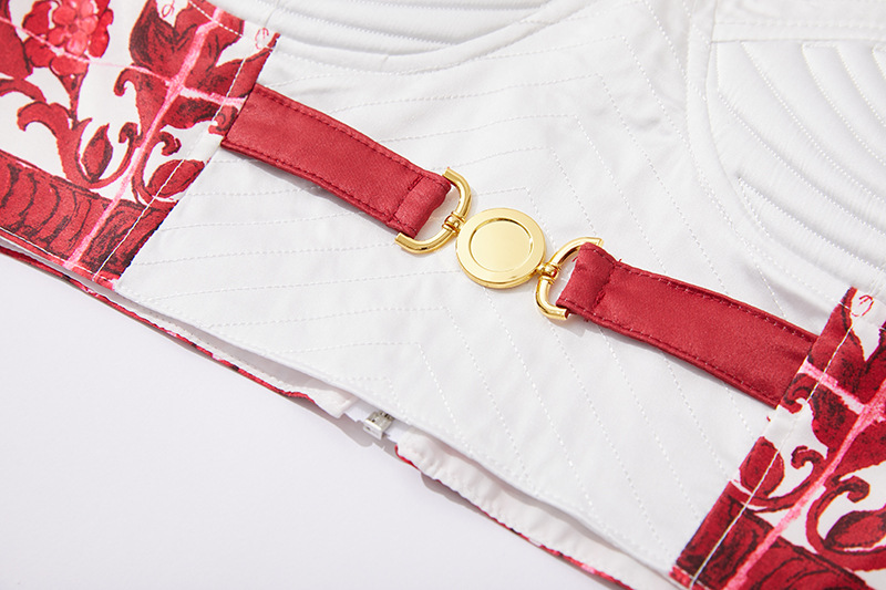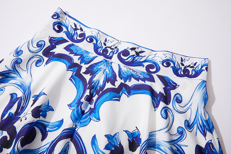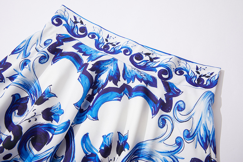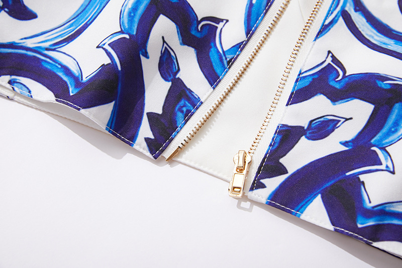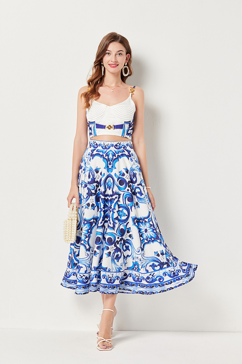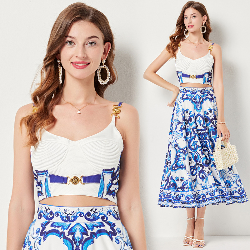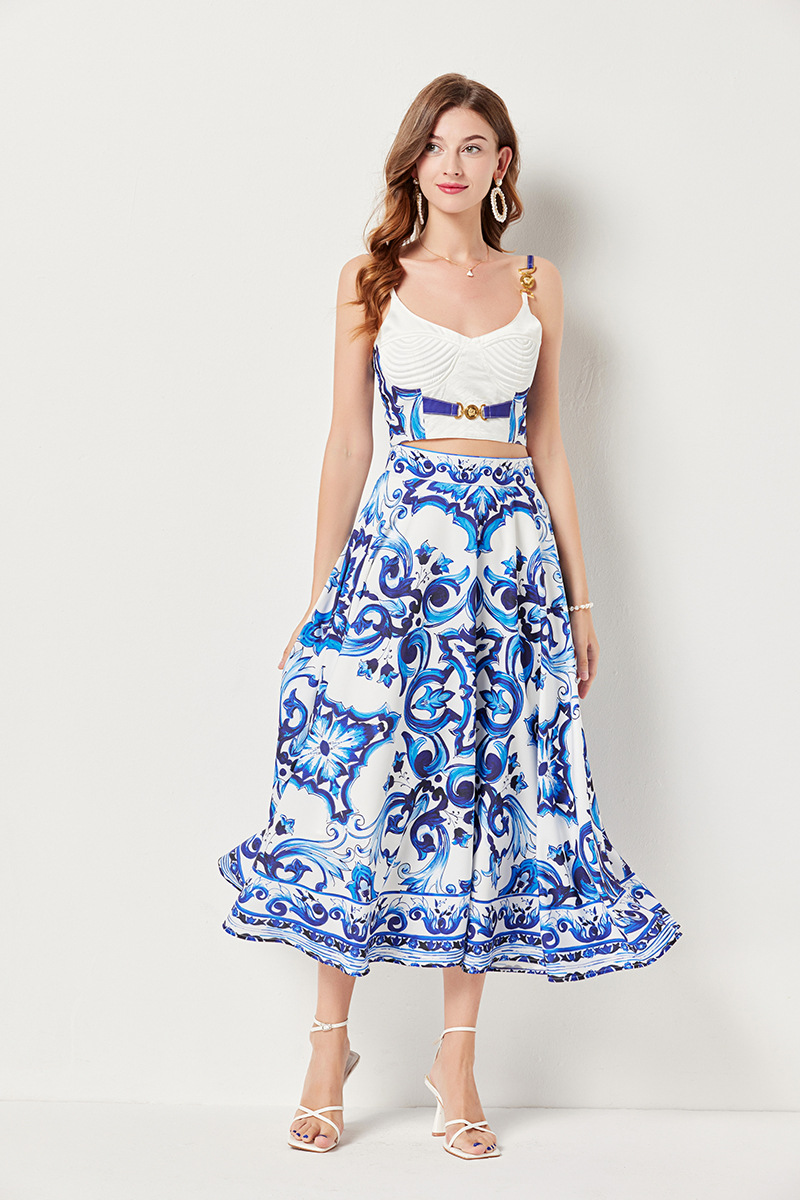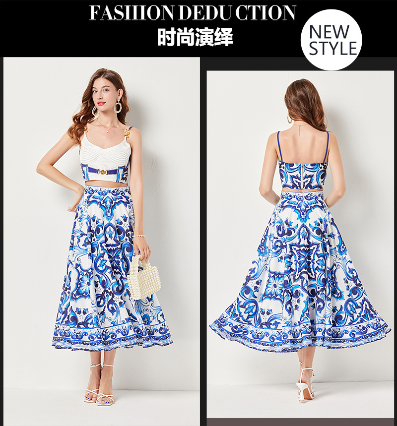 대형 스윙 스커트 투피스 세트가있는 실제 촬영 파란색과 흰색 도자기 중공업 금속 버클 3 차원 튜브 탑 스트랩 재킷