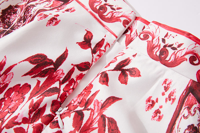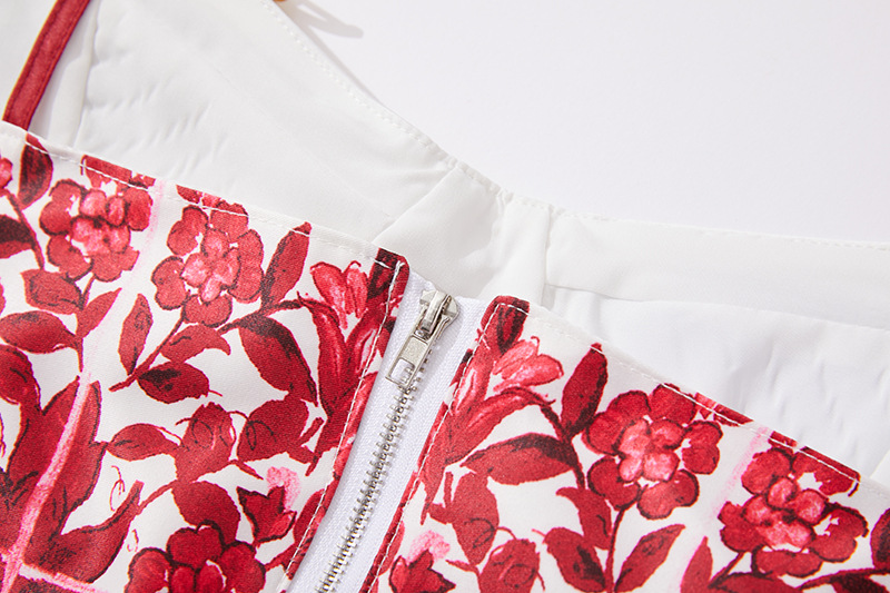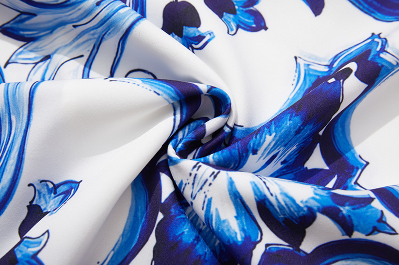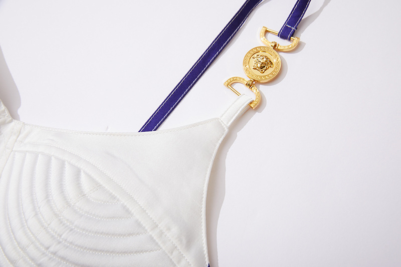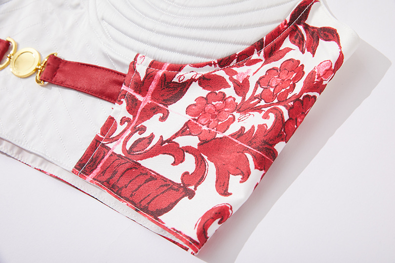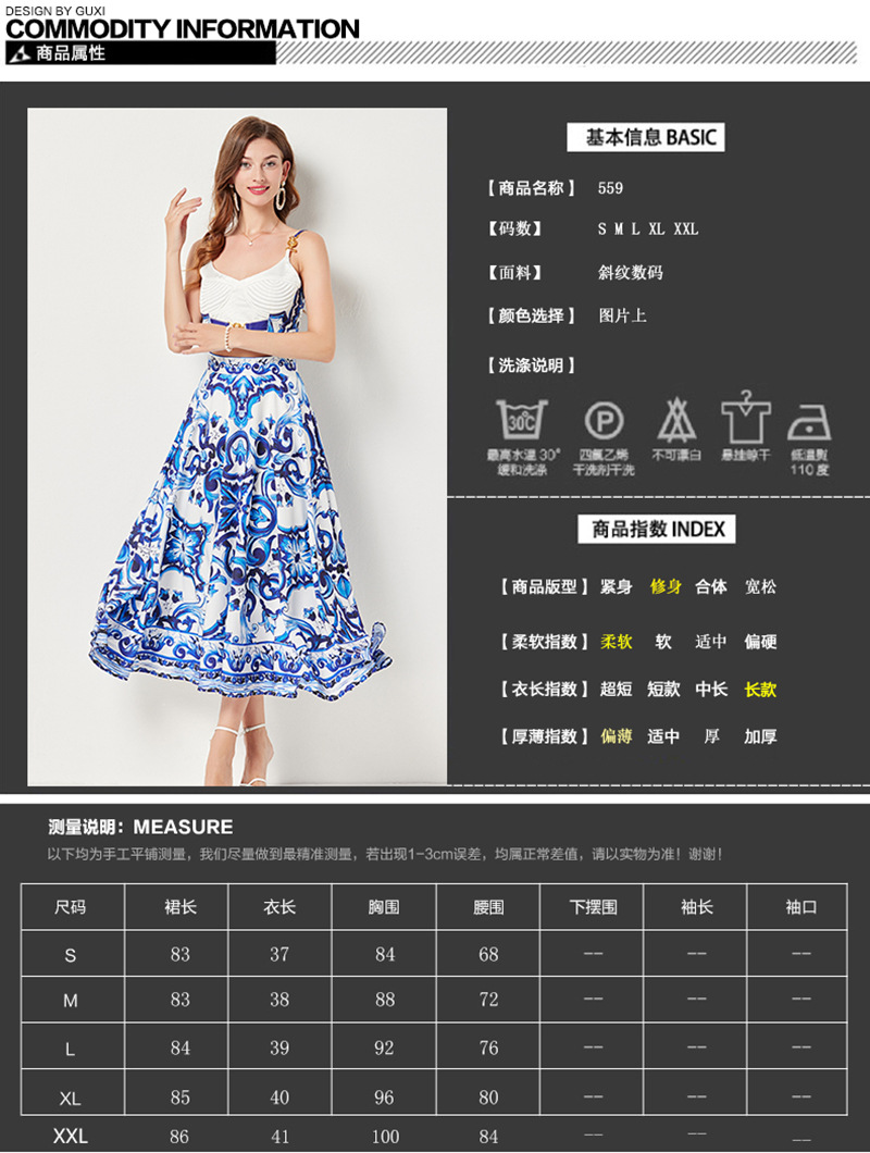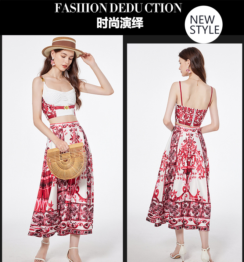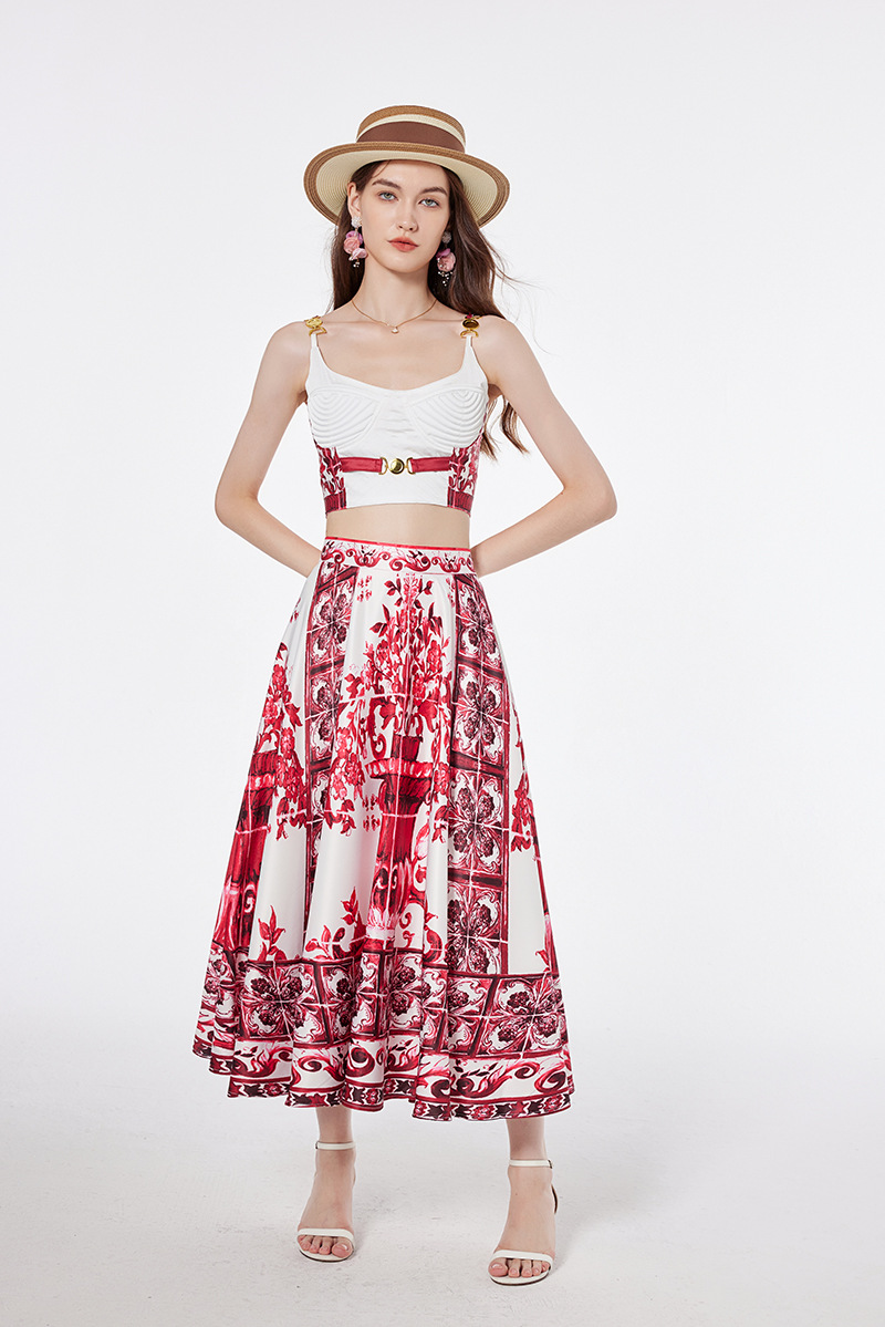 대형 스윙 스커트 투피스 세트가있는 실제 촬영 파란색과 흰색 도자기 중공업 금속 버클 3 차원 튜브 탑 스트랩 재킷