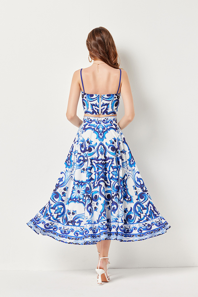 대형 스윙 스커트 투피스 세트가있는 실제 촬영 파란색과 흰색 도자기 중공업 금속 버클 3 차원 튜브 탑 스트랩 재킷스토어 가기