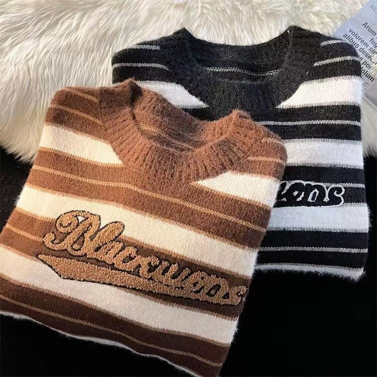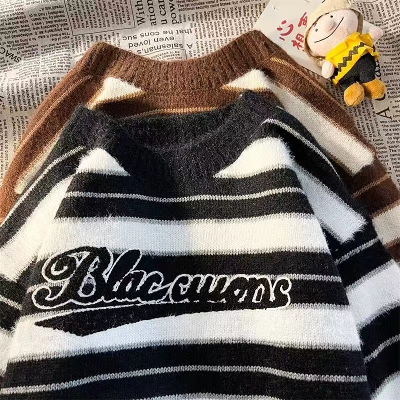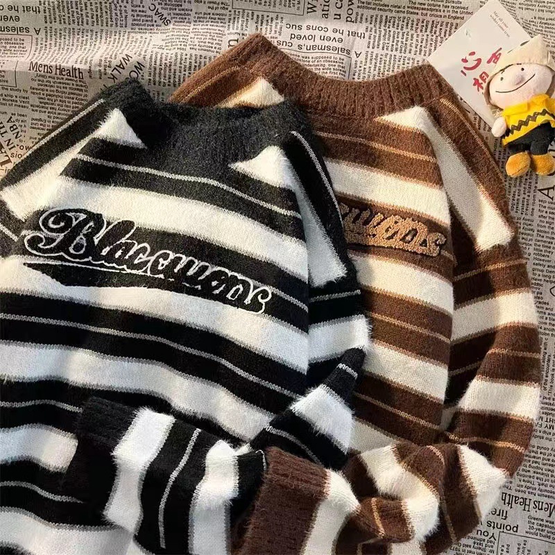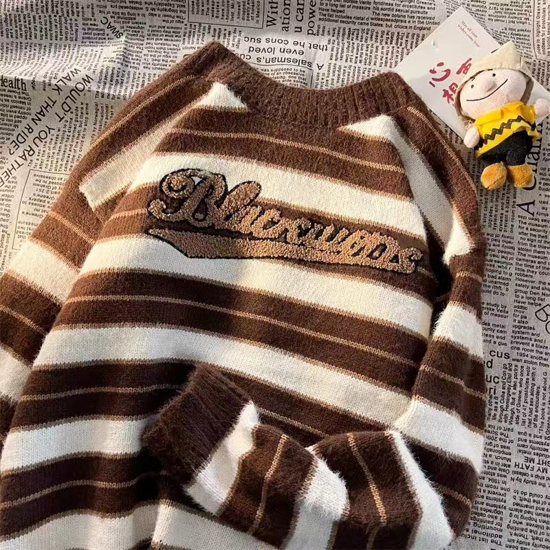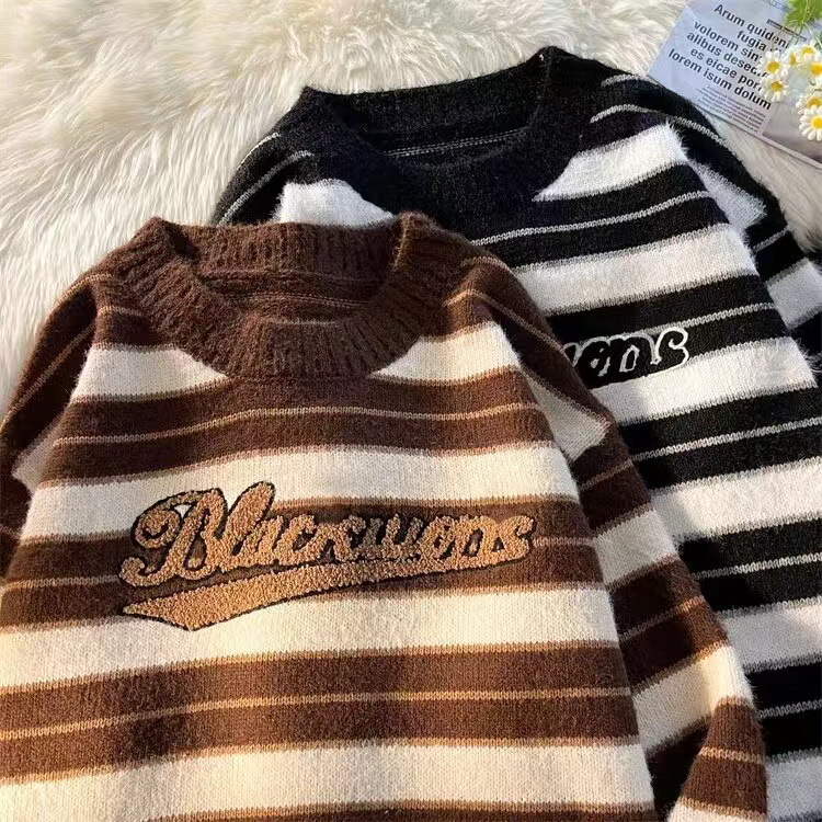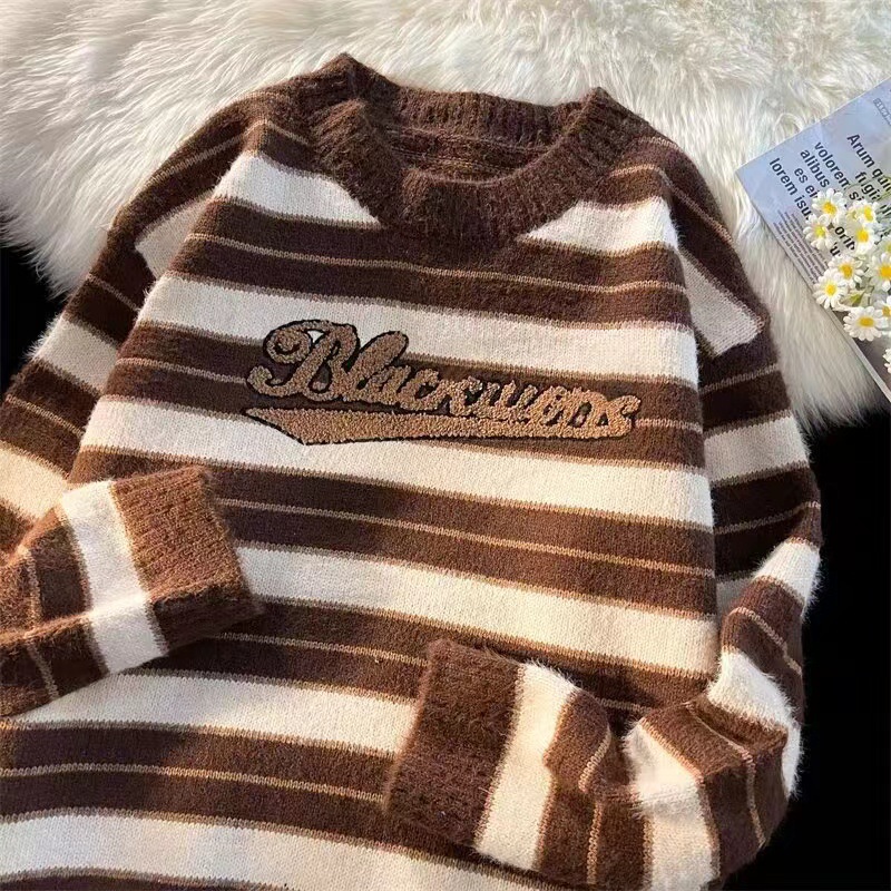 미국 레트로 게으른 줄무늬 스웨터 소년 가을과 겨울 새로운 하이 엔드 크루 넥 긴팔 스웨터 패션 브랜드스토어 가기