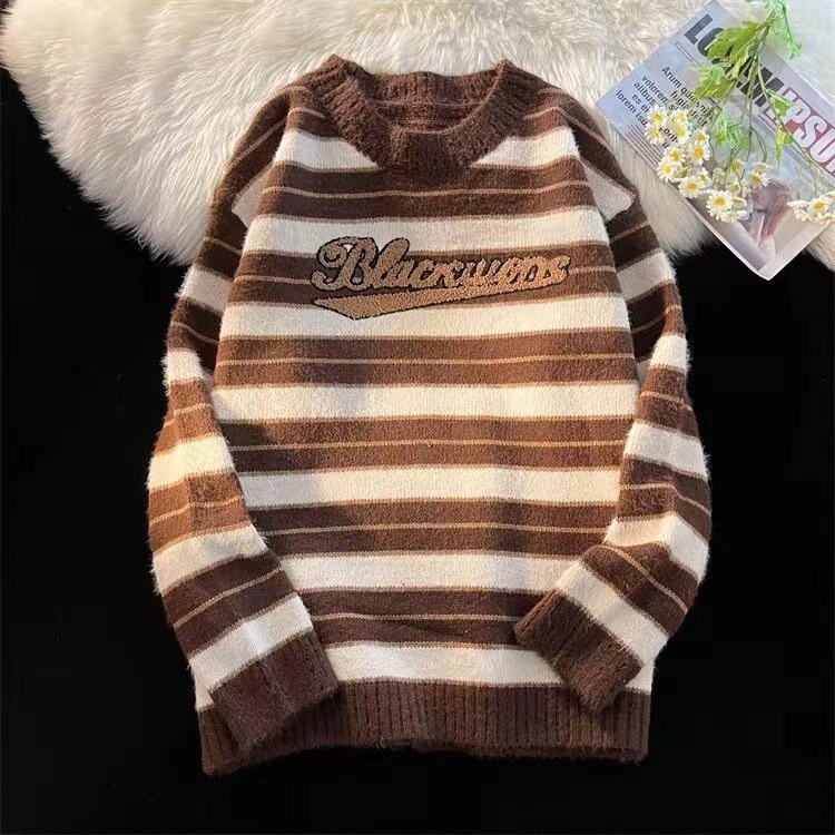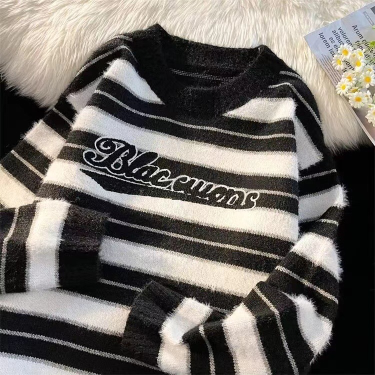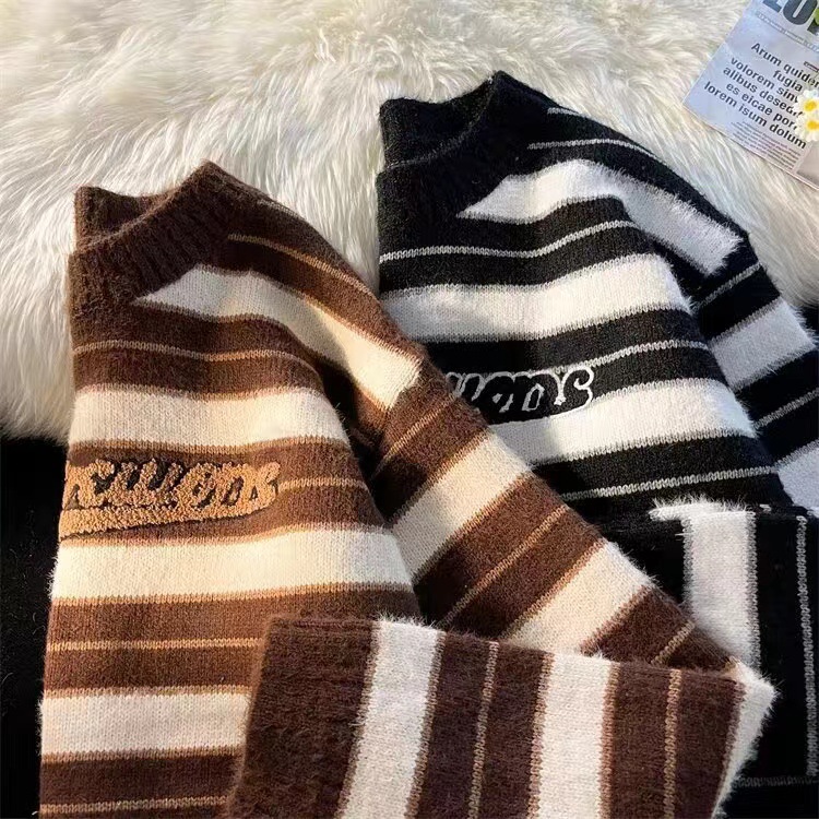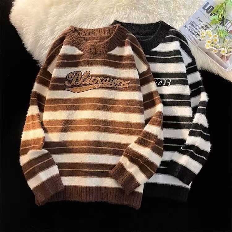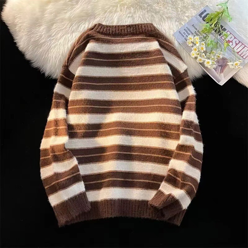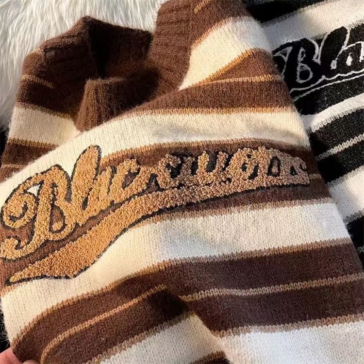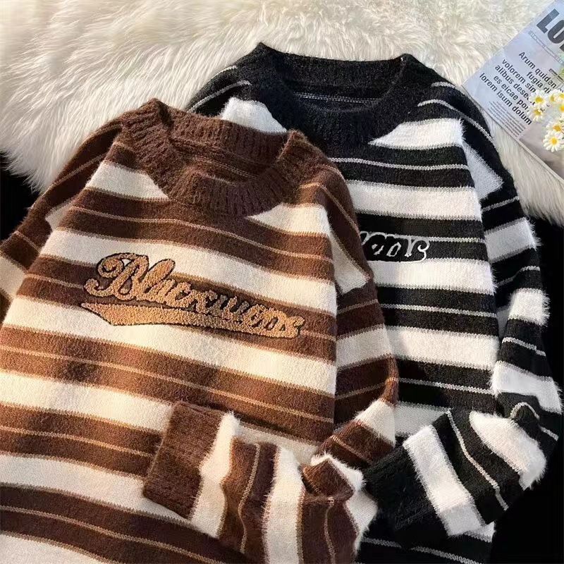 미국 레트로 게으른 줄무늬 스웨터 소년 가을과 겨울 새로운 하이 엔드 크루 넥 긴팔 스웨터 패션 브랜드스토어 가기