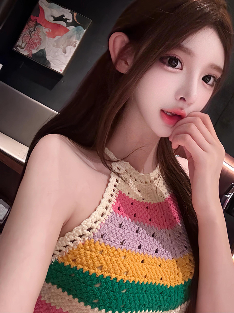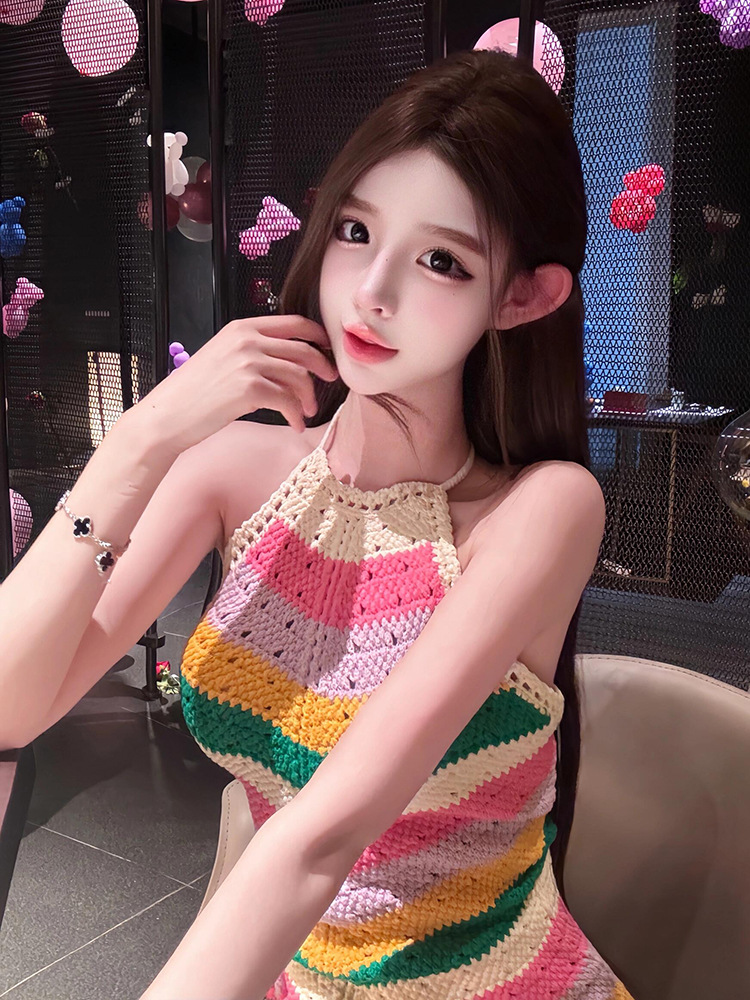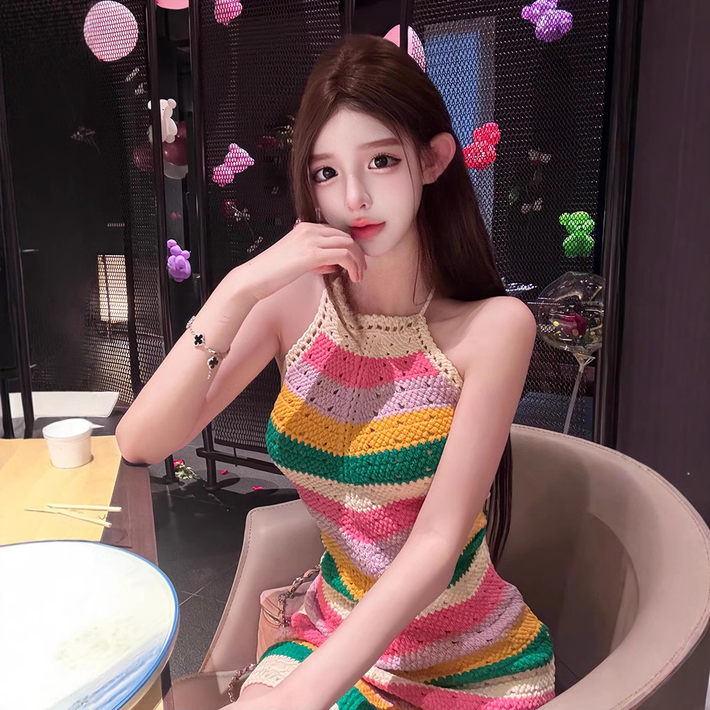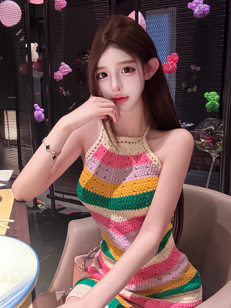 4560 컬러 스트라이프 어깨 빈 목 니트 원피스 여성의 새로운 디자인 센스 틈새 엉덩이 스커트