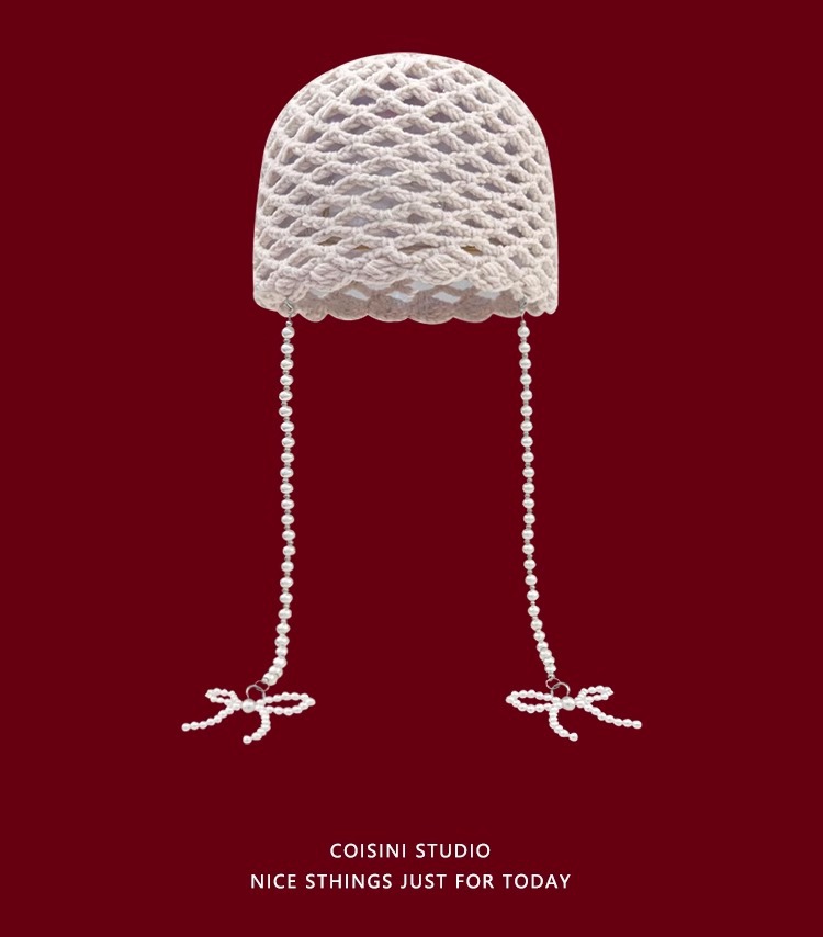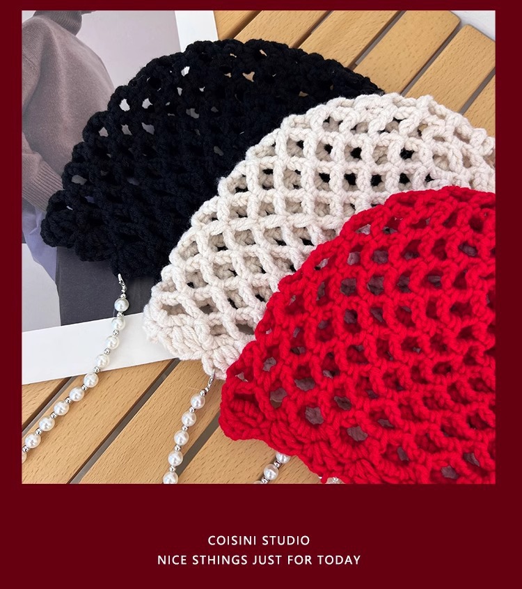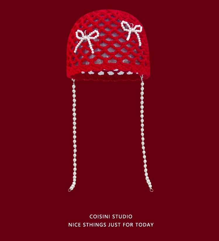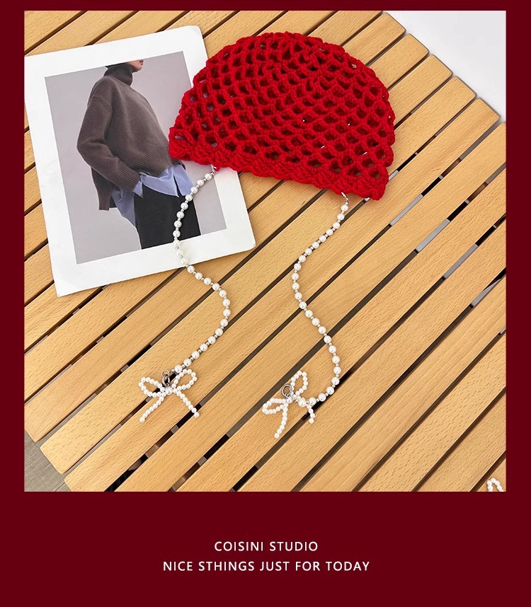 한국식 펄 보우 레드 바오터우 모자 여성 빈티지 할로우 아웃 풀오버 모자 큰 머리 와이 얼굴 작은 니트 모자