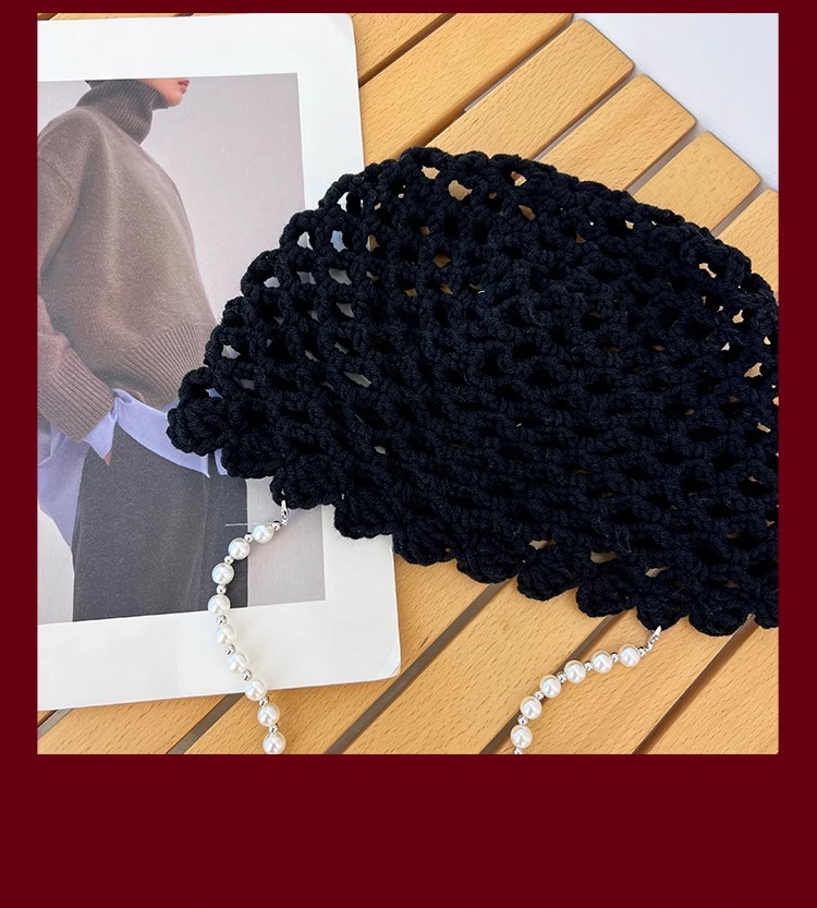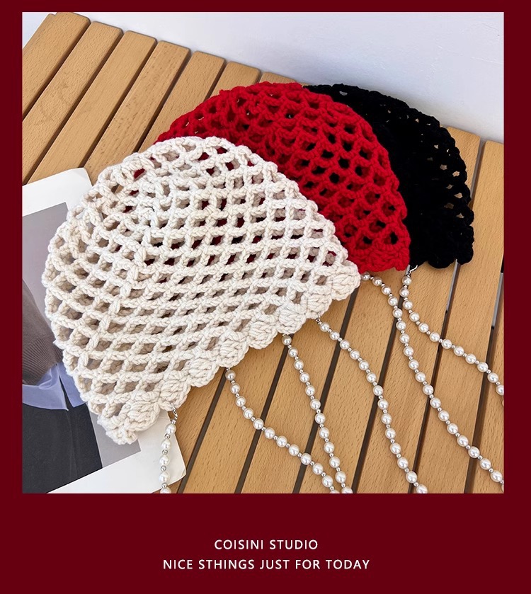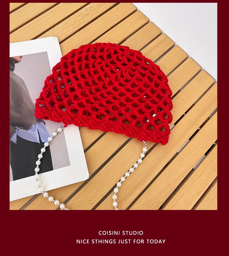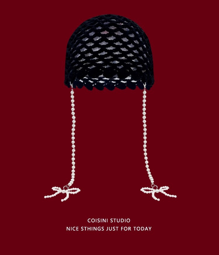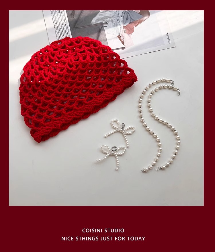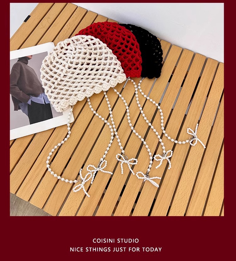 한국식 펄 보우 레드 바오터우 모자 여성 빈티지 할로우 아웃 풀오버 모자 큰 머리 와이 얼굴 작은 니트 모자스토어 가기