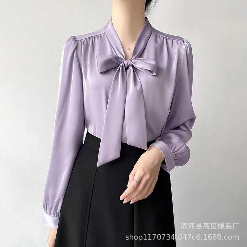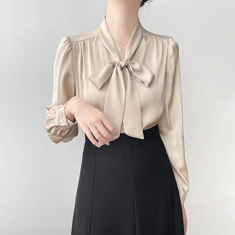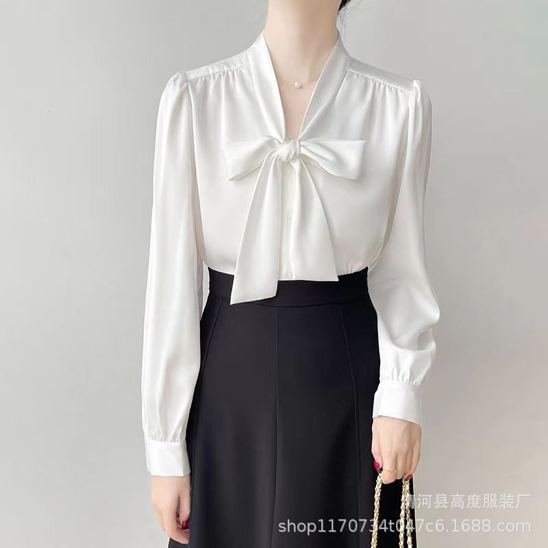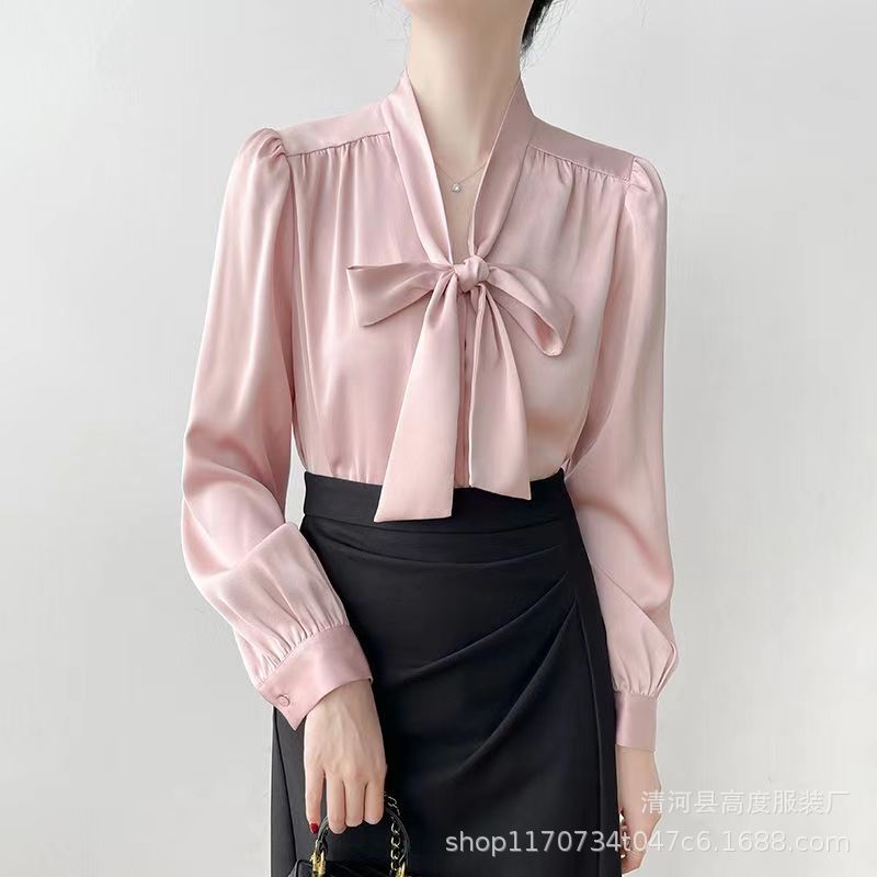 프랑스 스타일 여성용 리본 새틴 긴팔 셔츠 여성용 봄 스타일 틈새 통근 전문 기질 리본 탑스토어 가기