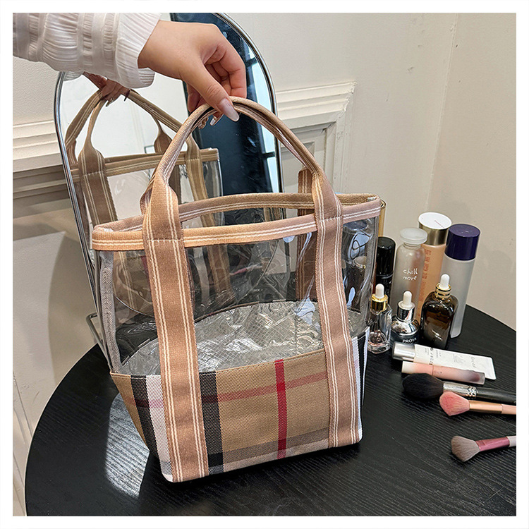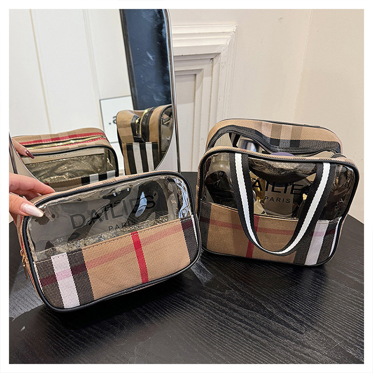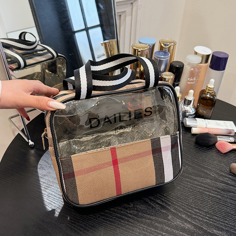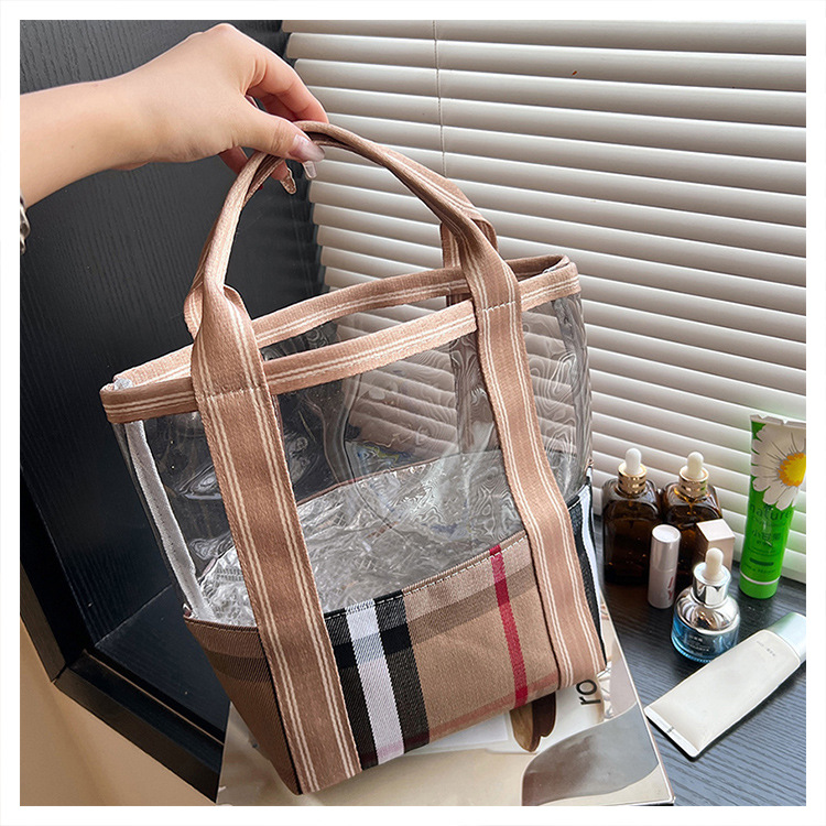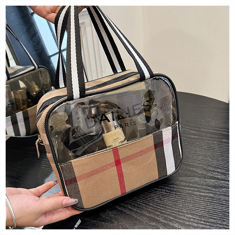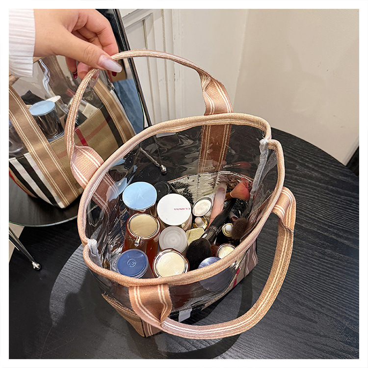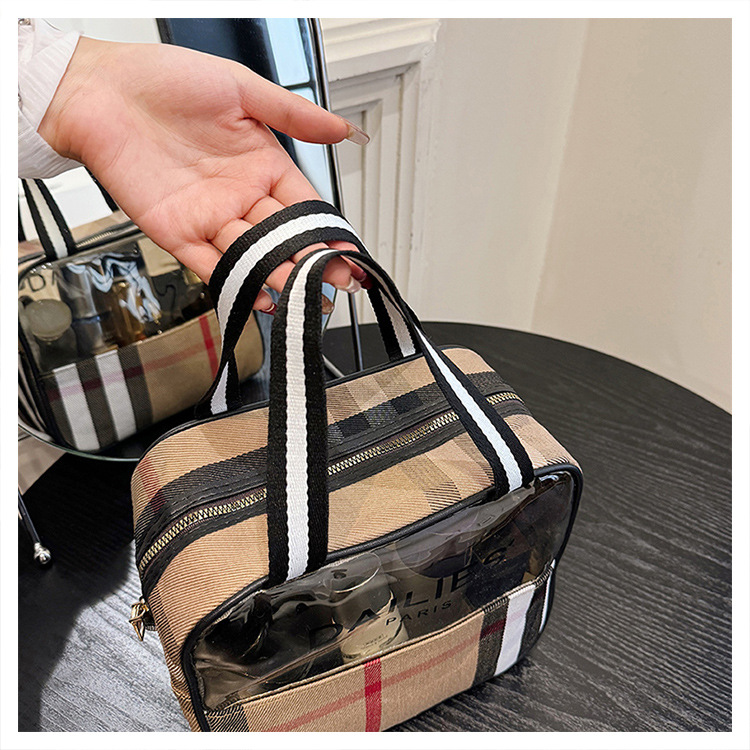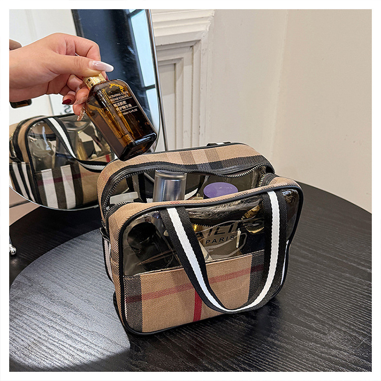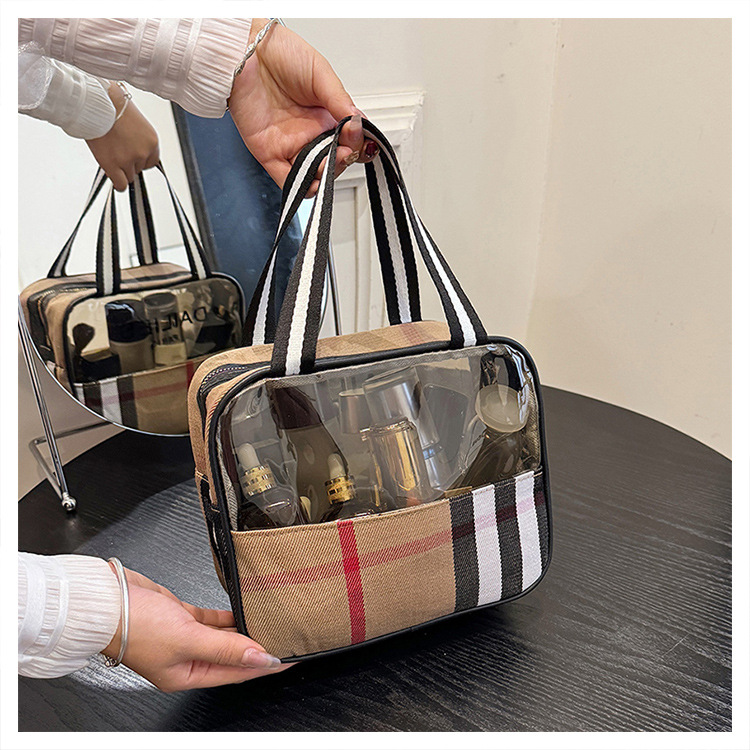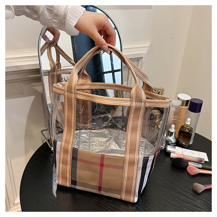 편리한 여행 보관 휴대용 격자 무늬 투명한 화장품 가방 접이식 대용량 메쉬 핸드백 도시락 가방 도매스토어 가기