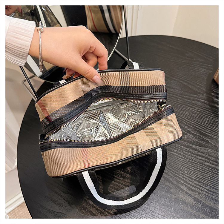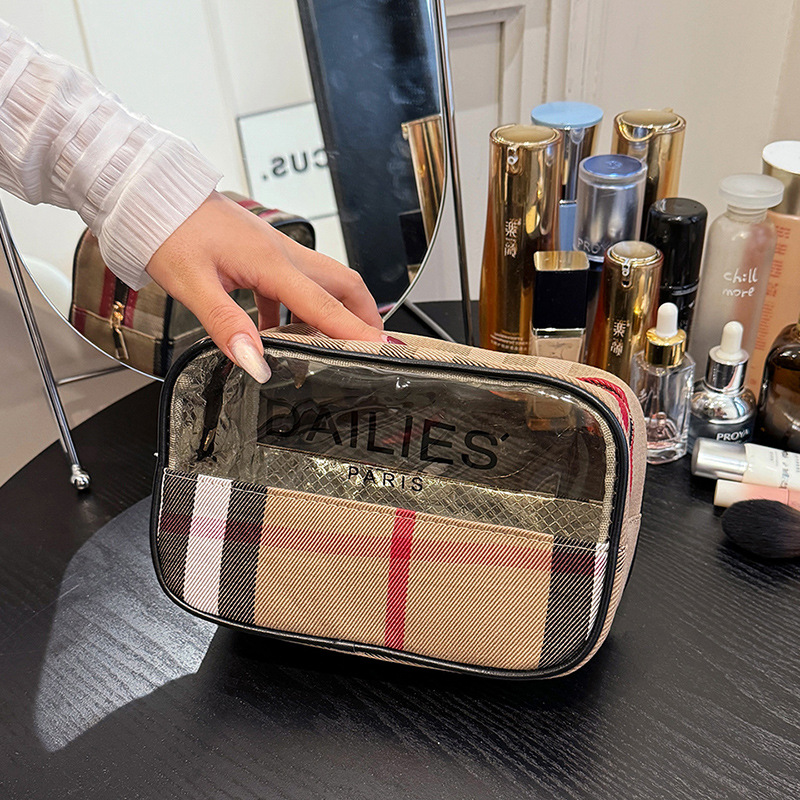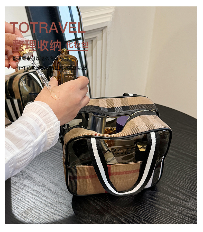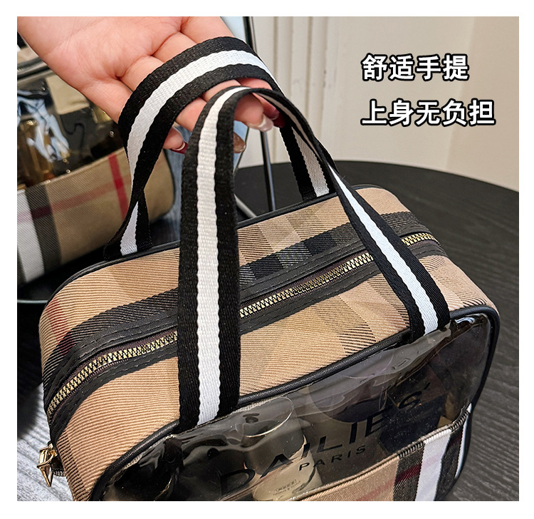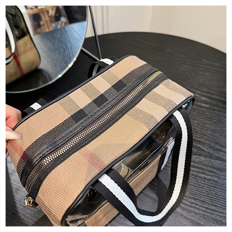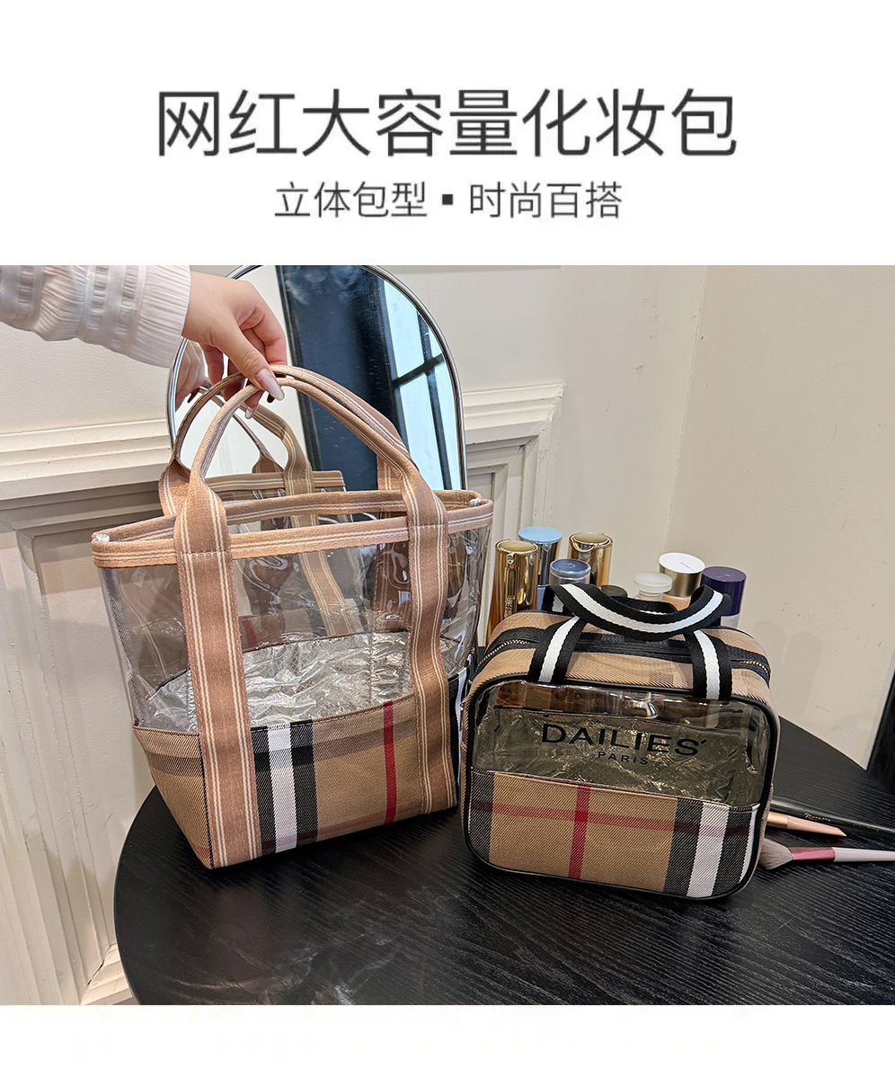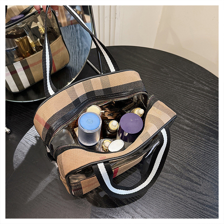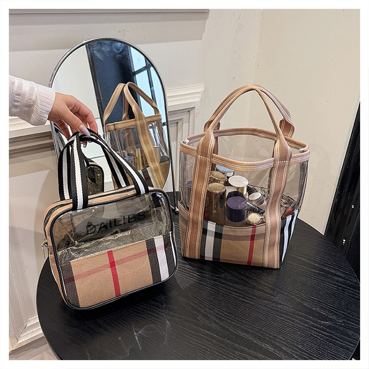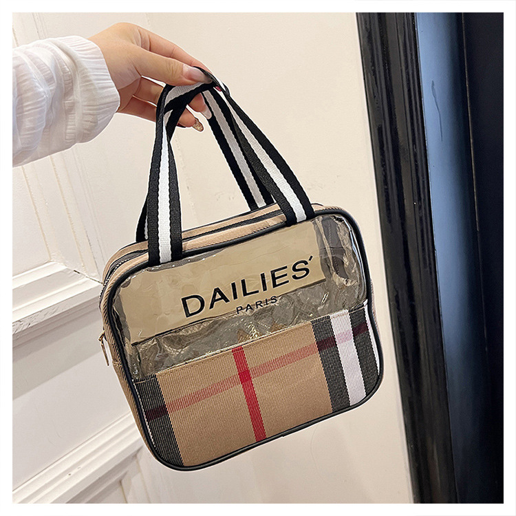 편리한 여행 보관 휴대용 격자 무늬 투명한 화장품 가방 접이식 대용량 메쉬 핸드백 도시락 가방 도매스토어 가기