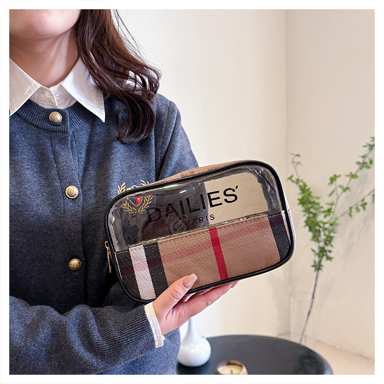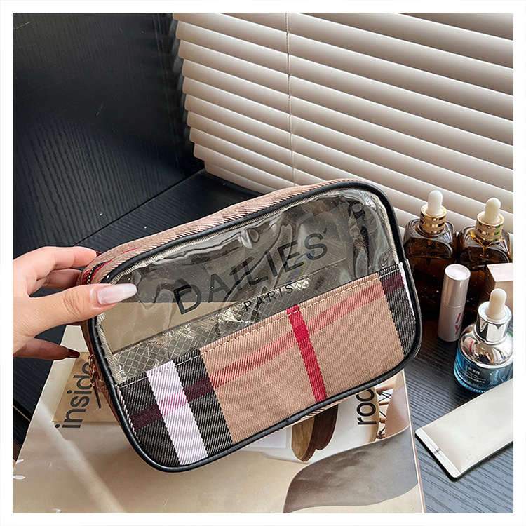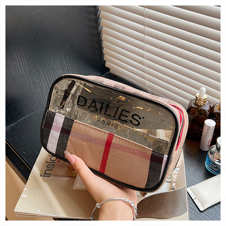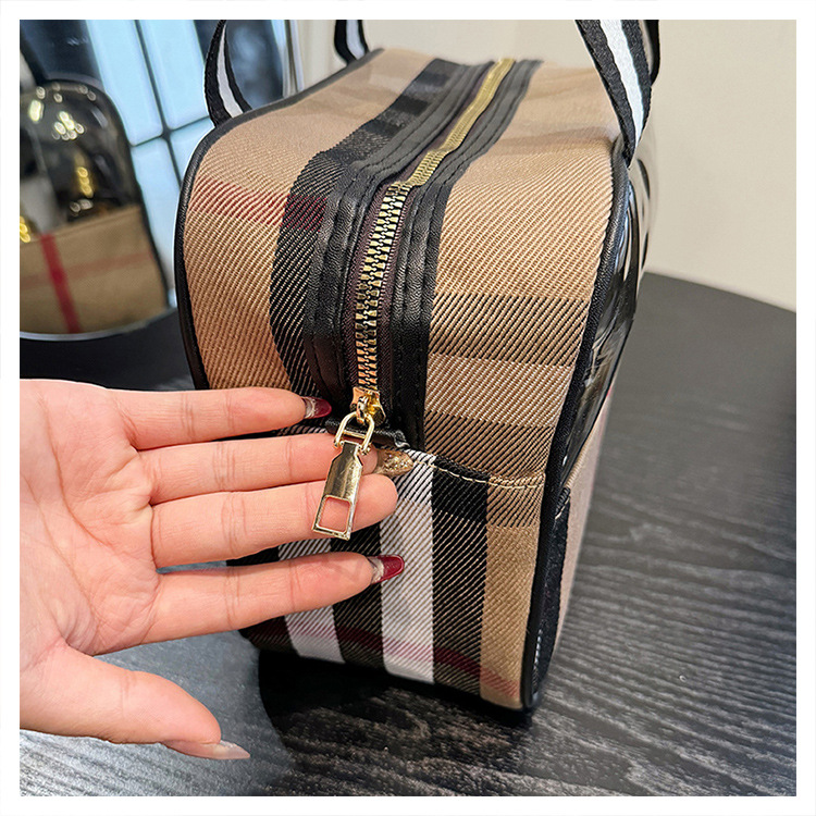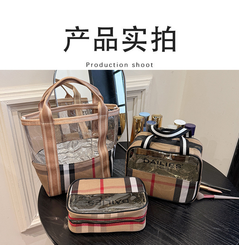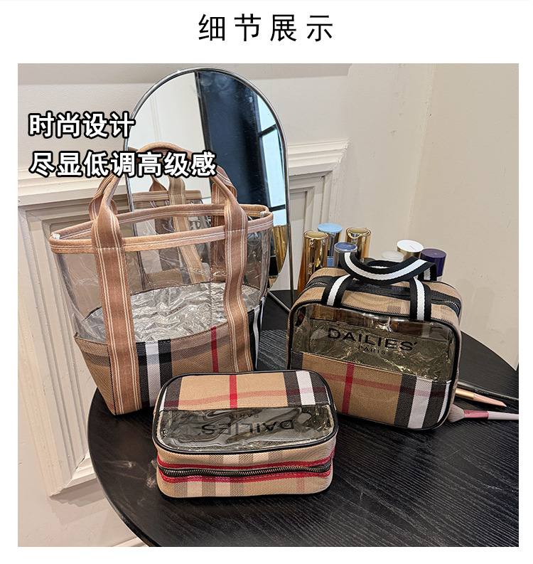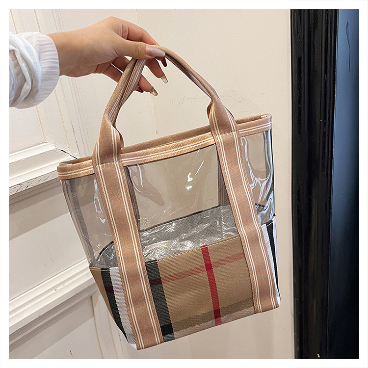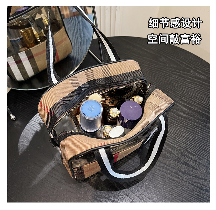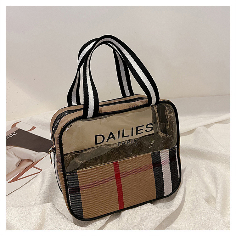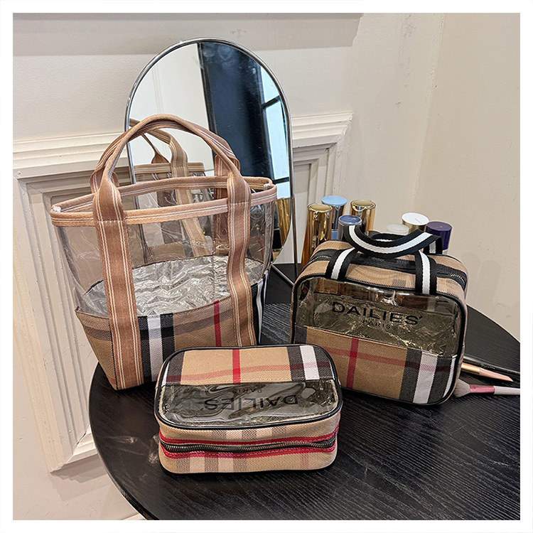 편리한 여행 보관 휴대용 격자 무늬 투명한 화장품 가방 접이식 대용량 메쉬 핸드백 도시락 가방 도매스토어 가기