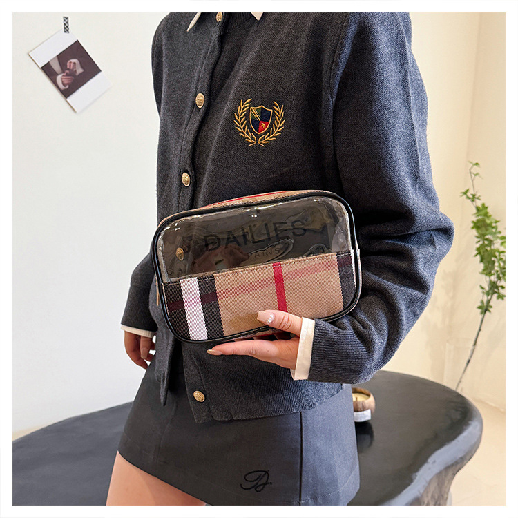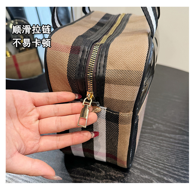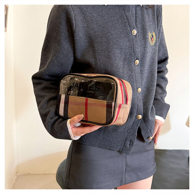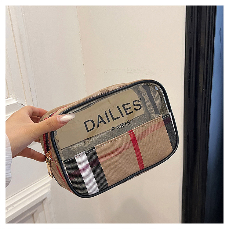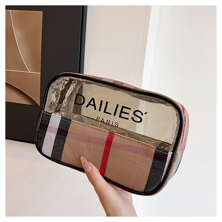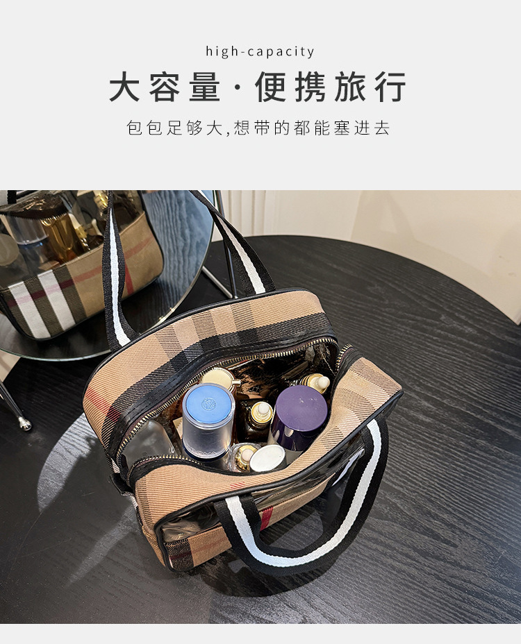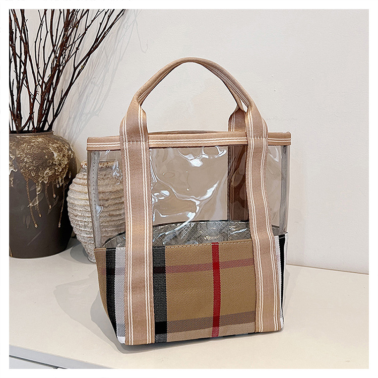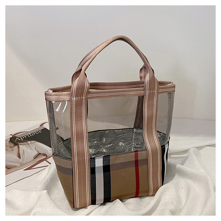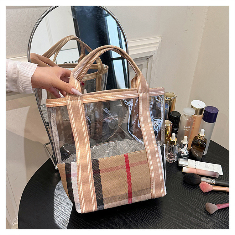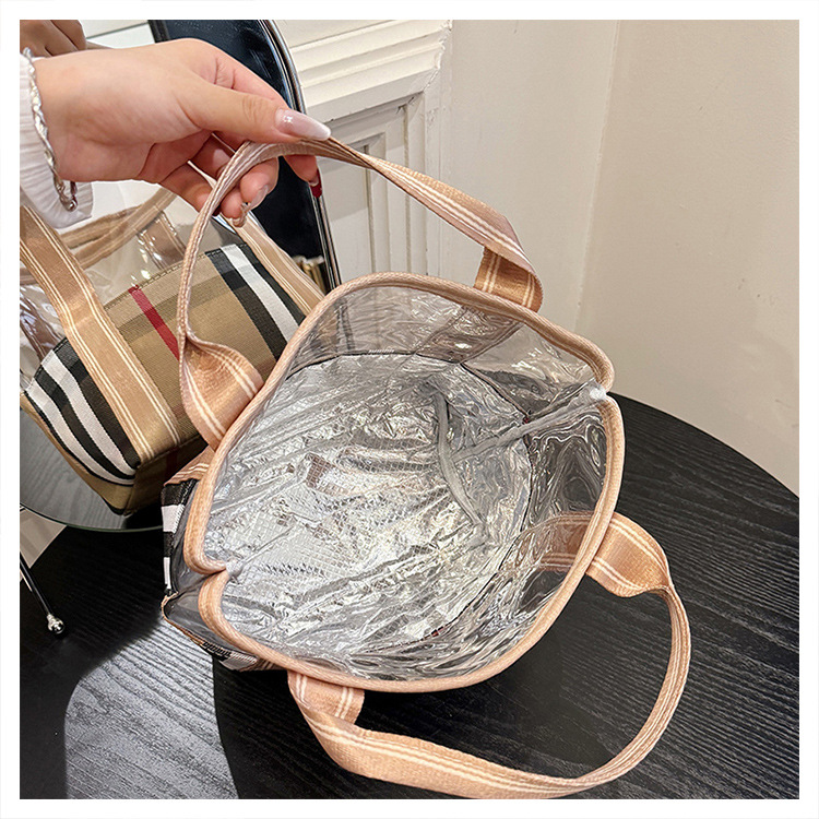 편리한 여행 보관 휴대용 격자 무늬 투명한 화장품 가방 접이식 대용량 메쉬 핸드백 도시락 가방 도매스토어 가기