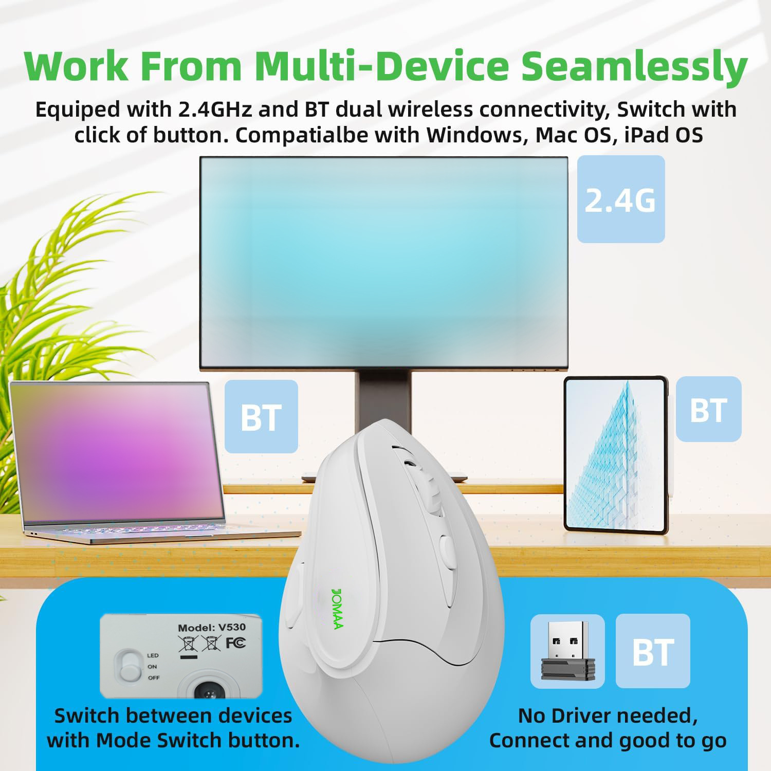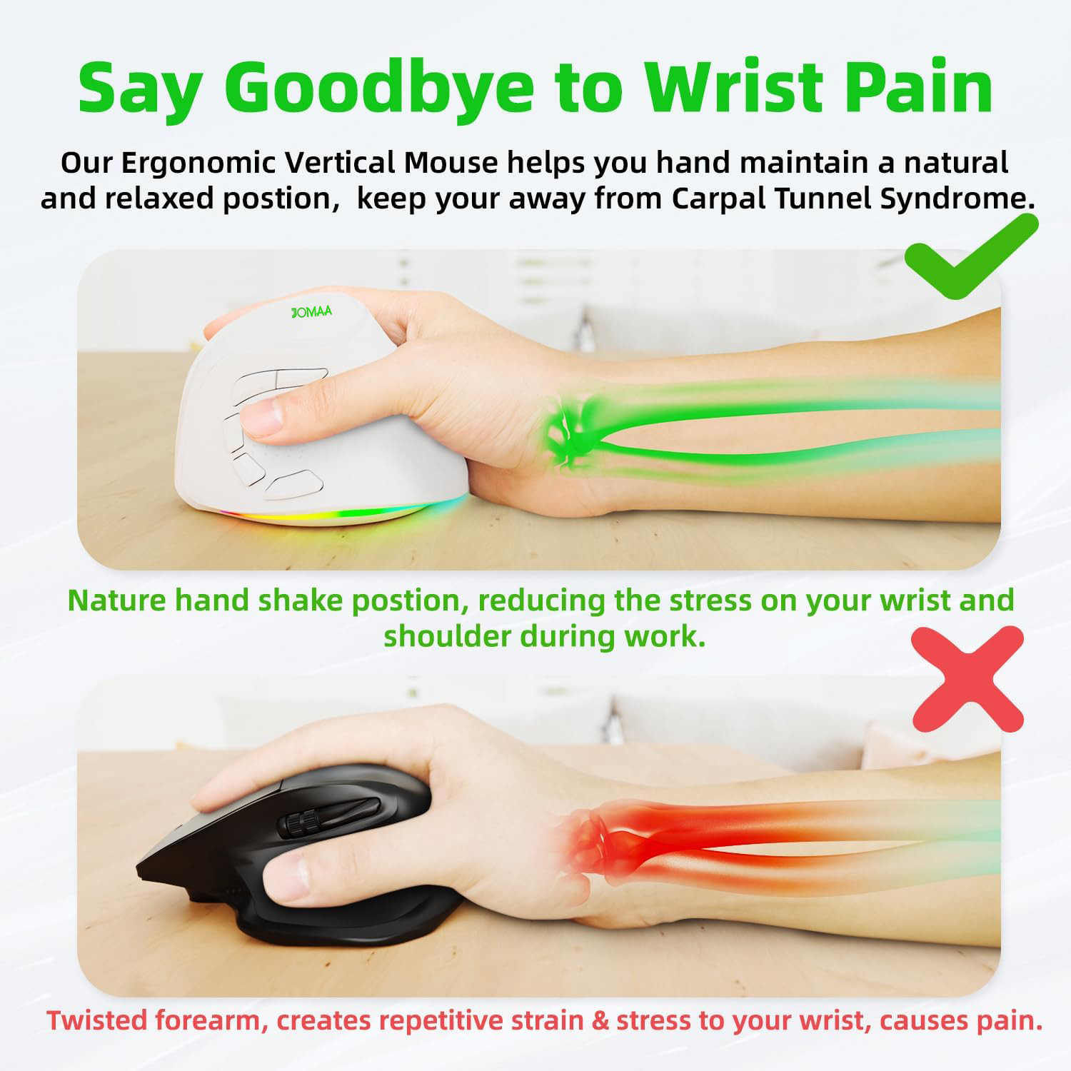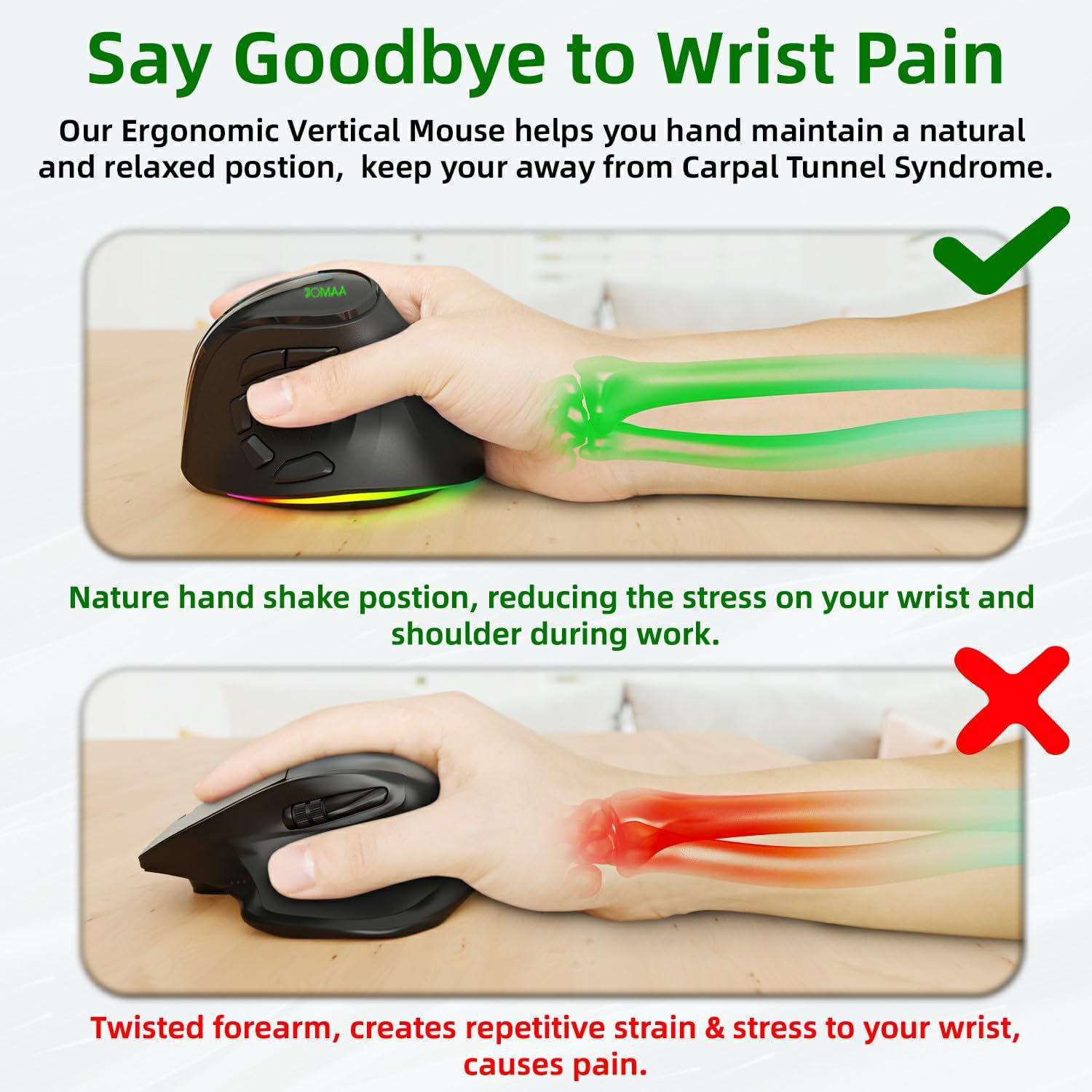 JOMAA 무선 블루투스 듀얼 모드 인체 공학적 수직 마우스 RGB 충전식 자동 사무실 국경 간 뜨거운 판매