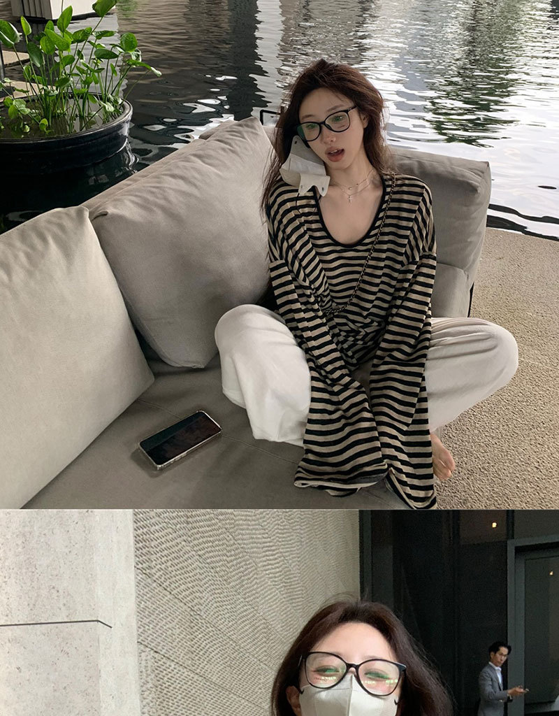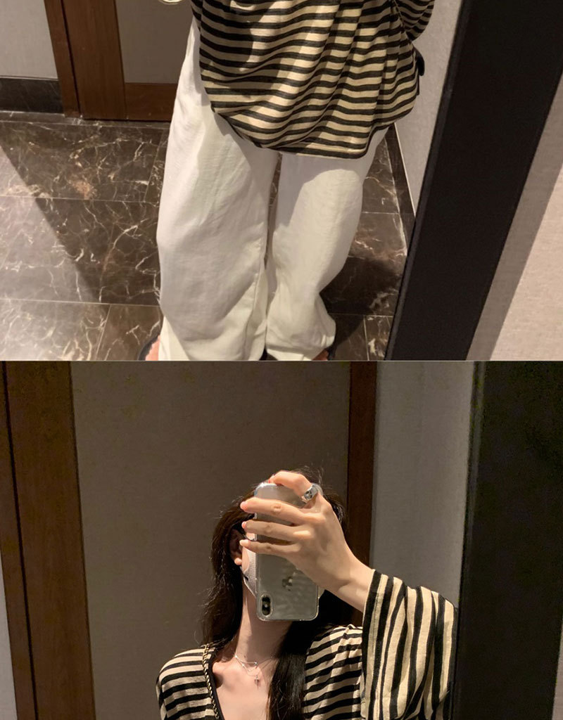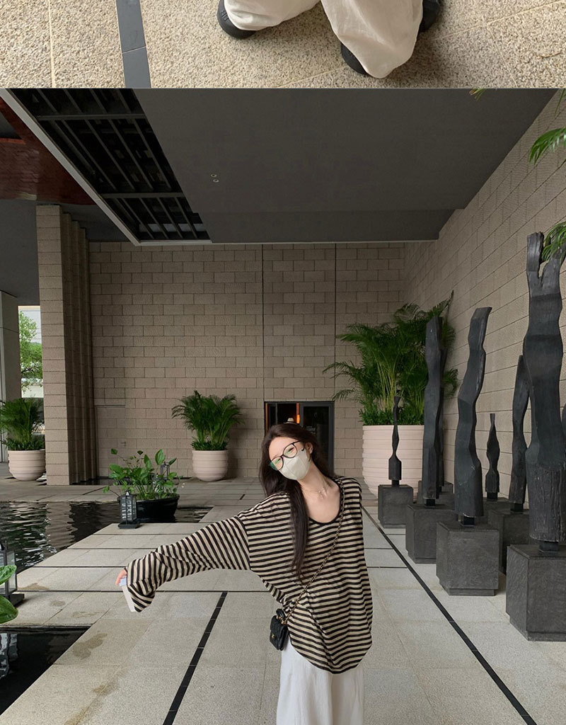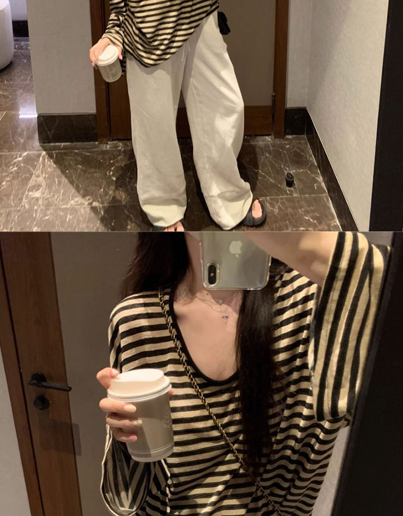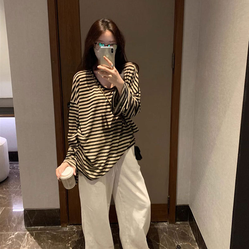 뜨거운 소녀 줄무늬 티셔츠 여성의 봄과 가을 2024 새로운 느슨한 U 칼라 미국 긴팔 티셔츠 얇은 외부 탑스토어 가기