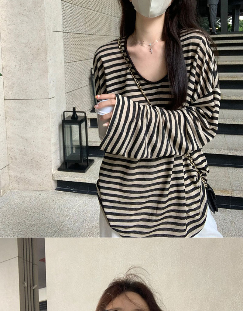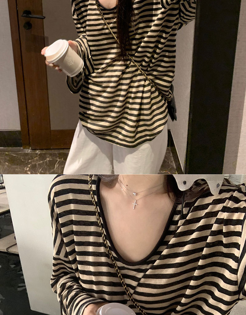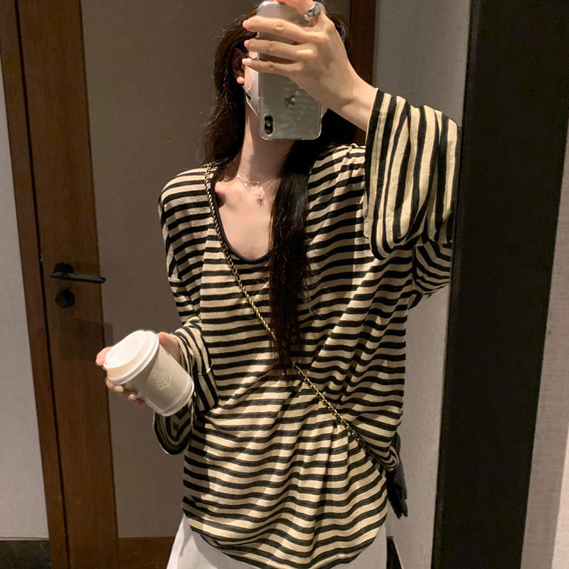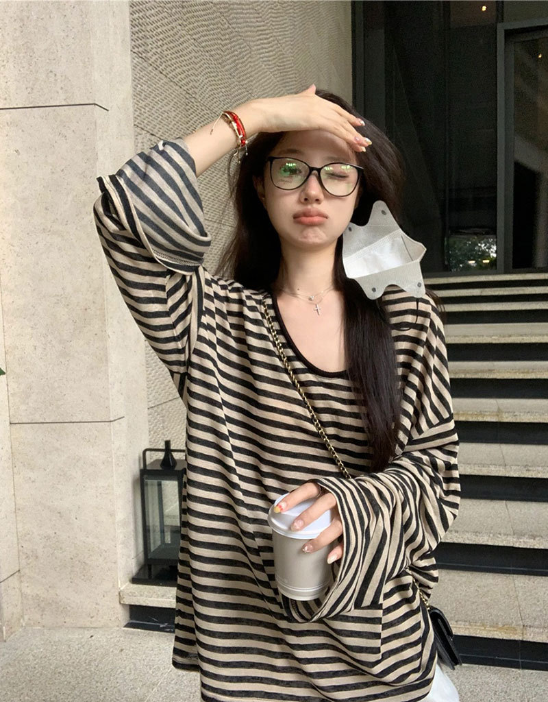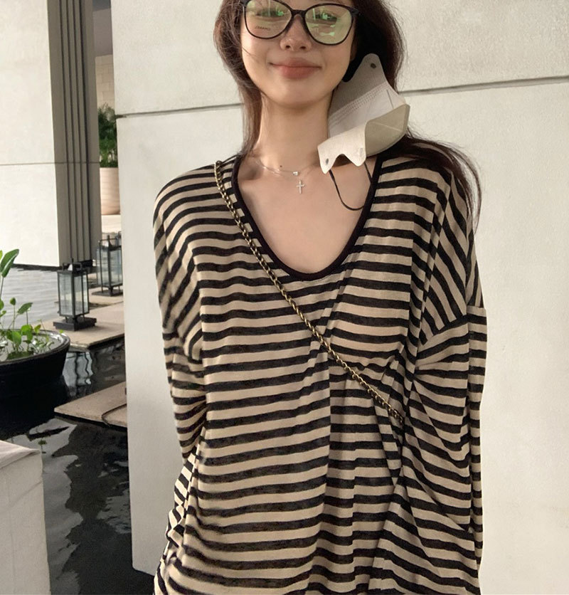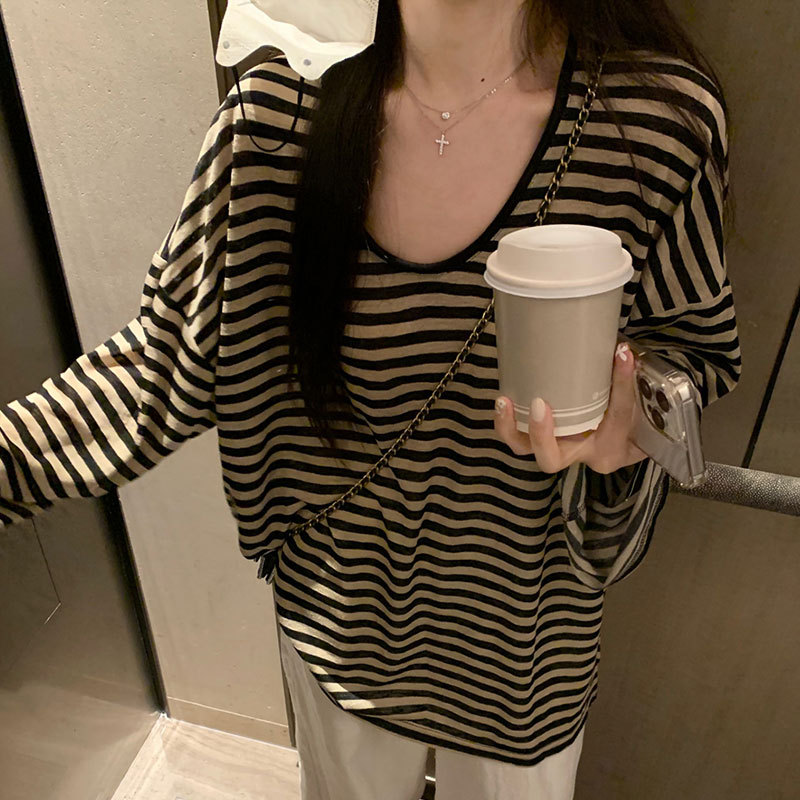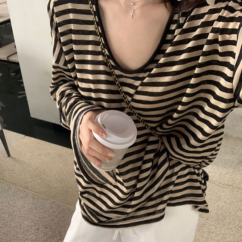 뜨거운 소녀 줄무늬 티셔츠 여성의 봄과 가을 2024 새로운 느슨한 U 칼라 미국 긴팔 티셔츠 얇은 외부 탑
