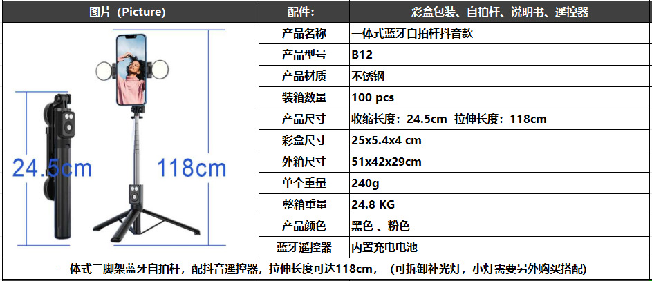B12 블루투스 트레몰로 원격 제어 셀카 스틱 1.1 m 휴대 전화 라이브 방송 브래킷 뷰티 라이트 휴대용 휴대용 통합스토어 가기
