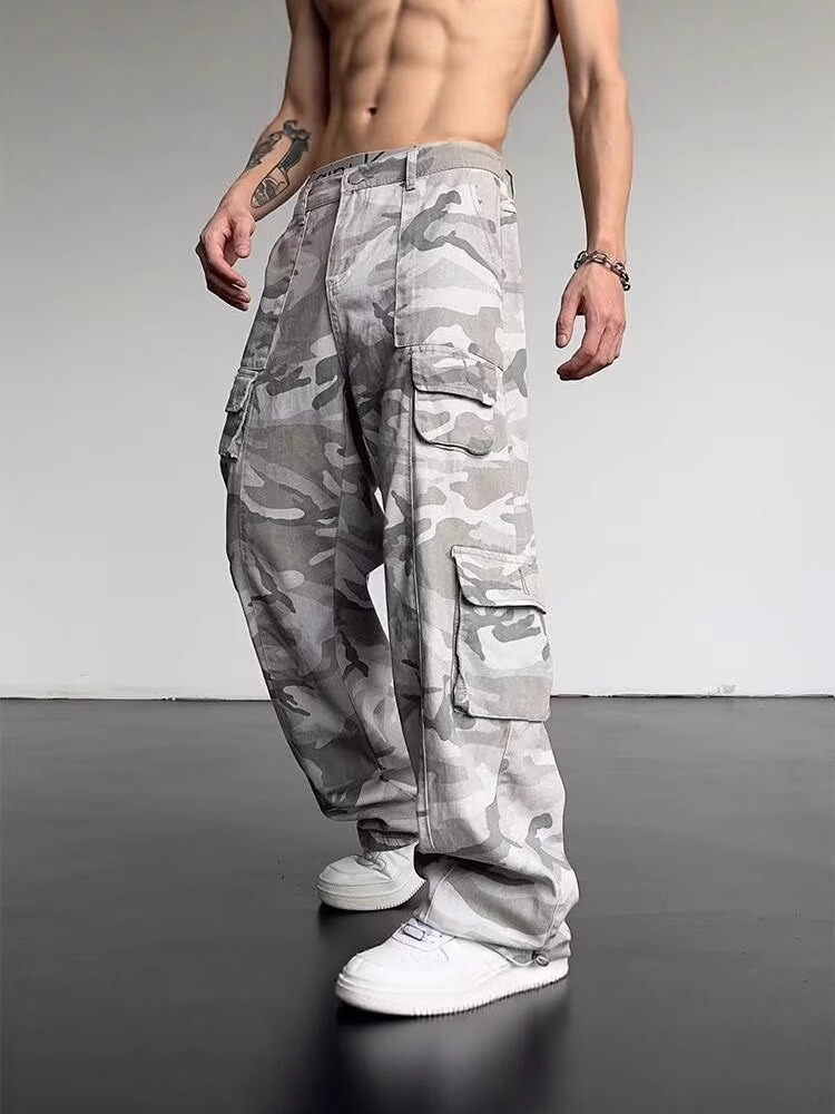 아메리칸 스타일 빈티지 씻어 올드 화이트 위장 캐주얼 바지 남성 봄과 가을 새로운 넓은 다리 느슨한 작업복