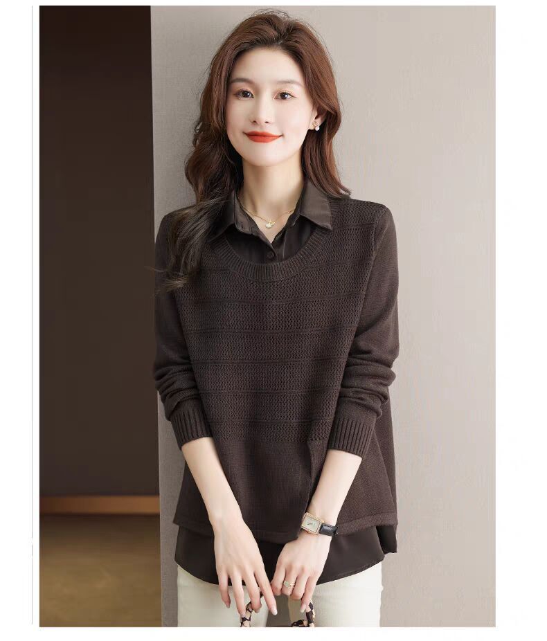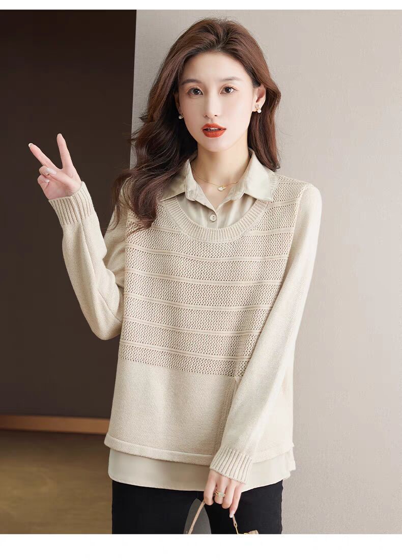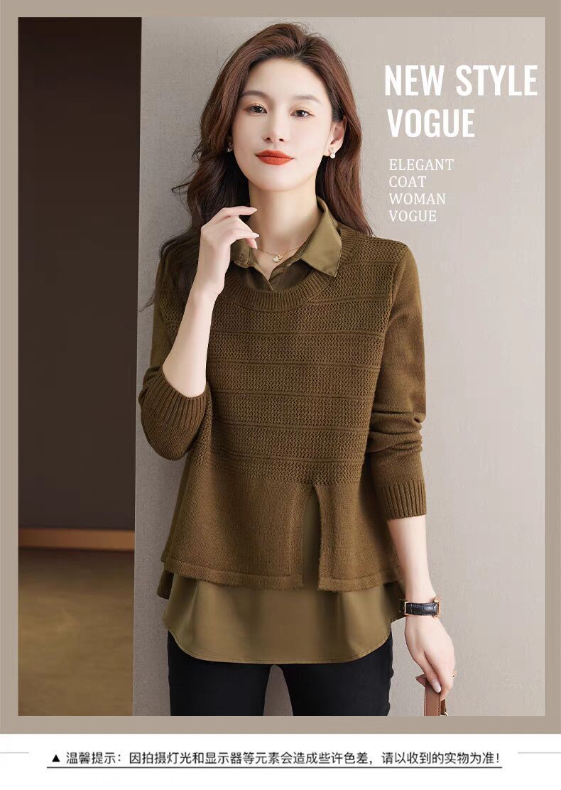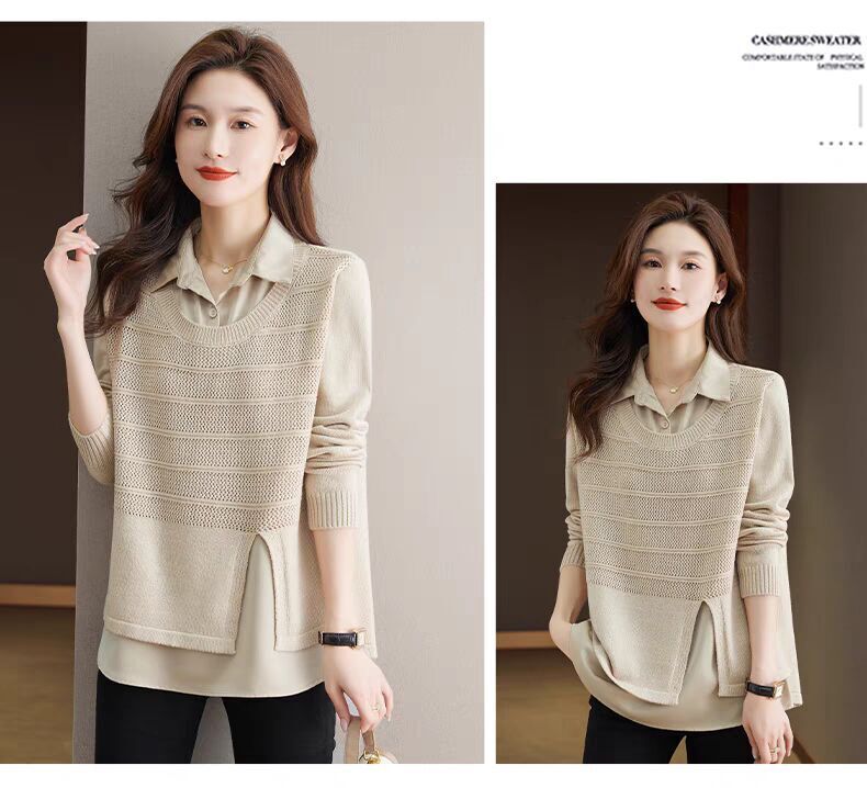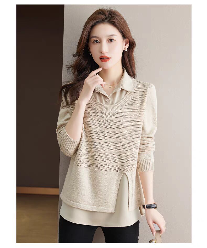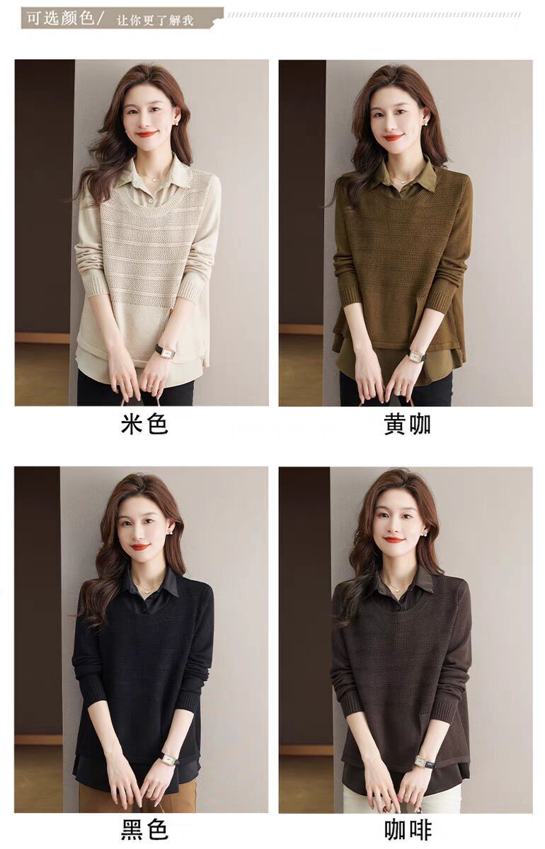 재고 가짜 투피스 탑 여성 패션 서양식 느슨한 배꼽 아우터 착용 니트 셔츠 봄과 가을 새로운베이스 셔츠