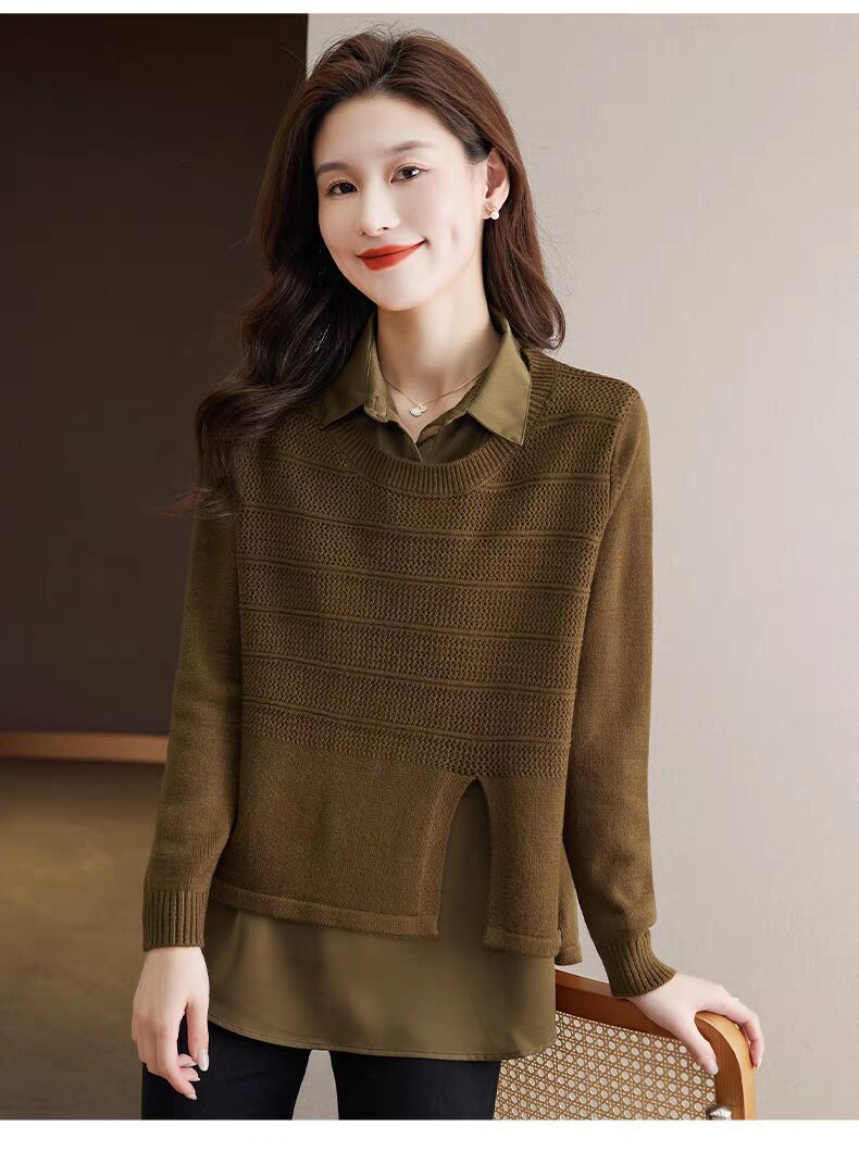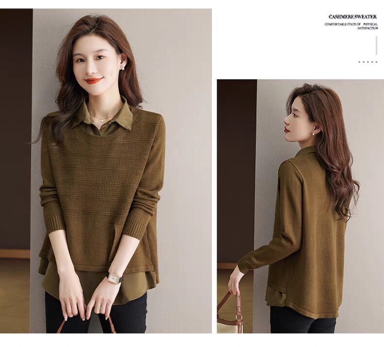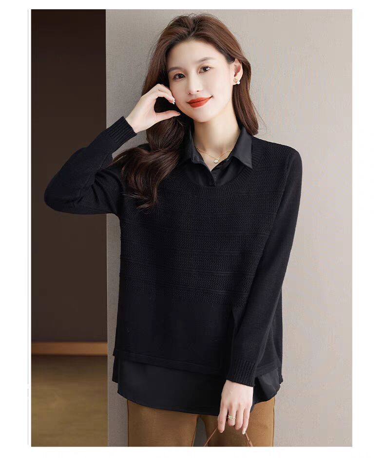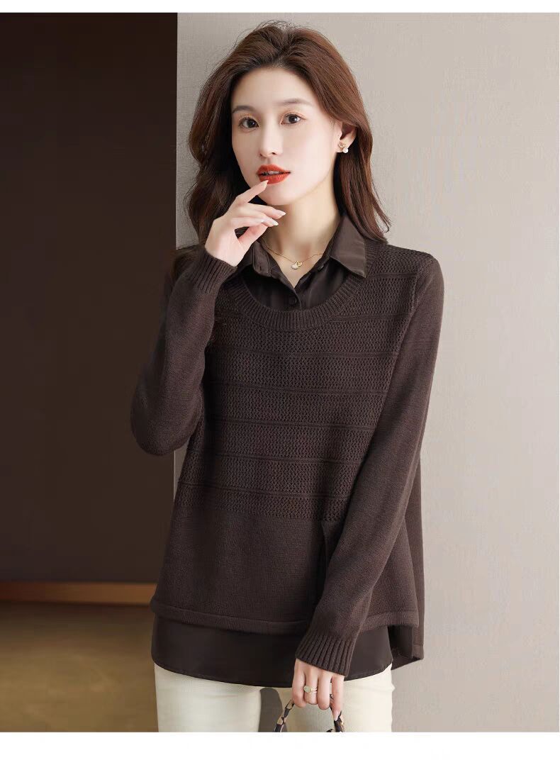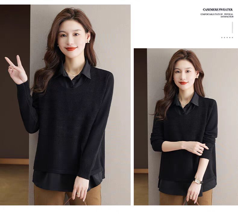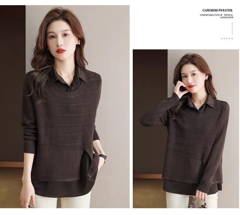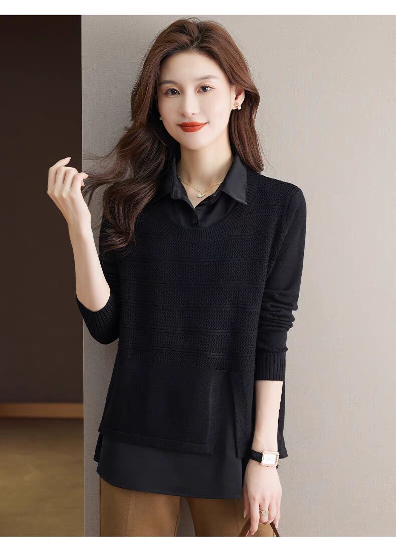 재고 가짜 투피스 탑 여성 패션 서양식 느슨한 배꼽 아우터 착용 니트 셔츠 봄과 가을 새로운베이스 셔츠