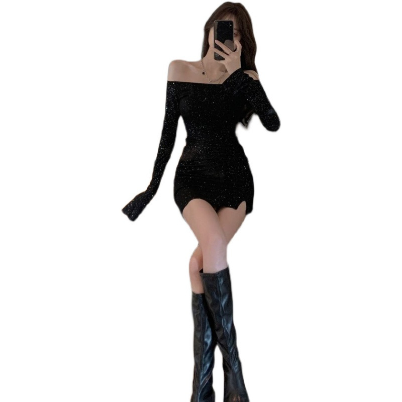어깨 원피스 여성용 슬림 핏 다이아몬드 스터드 긴팔 불규칙한 엉덩이 스커트 2024 년 초가을 새로운 블랙 스커트