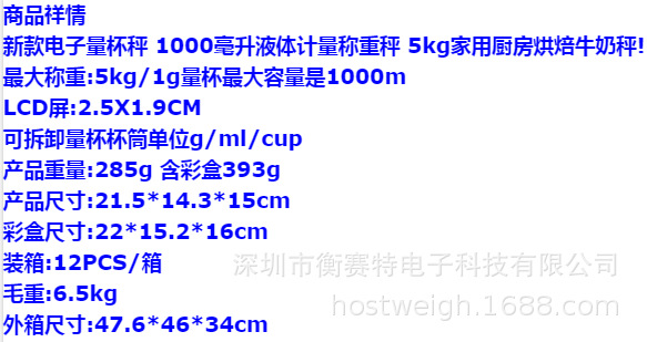 대외 무역 인기 판매 전자 측정 컵 저울 1000ml 대용량 분리형 주방 베이킹 저울 5kg 가정용 우유