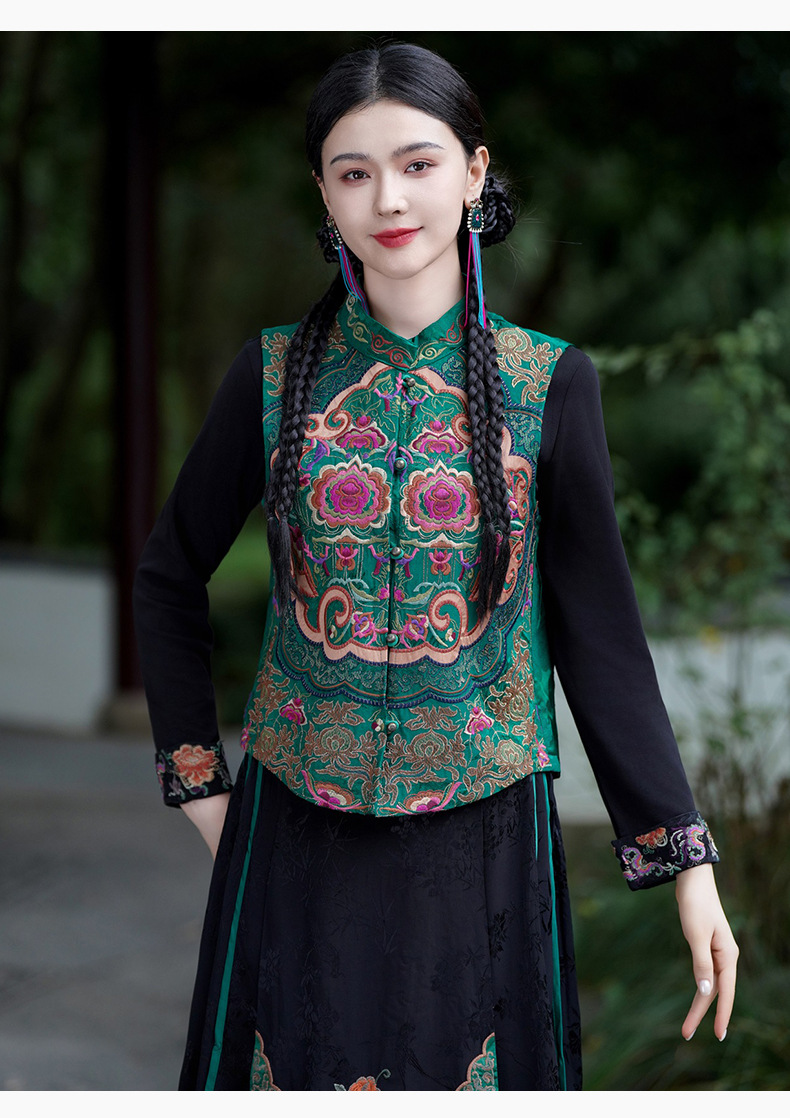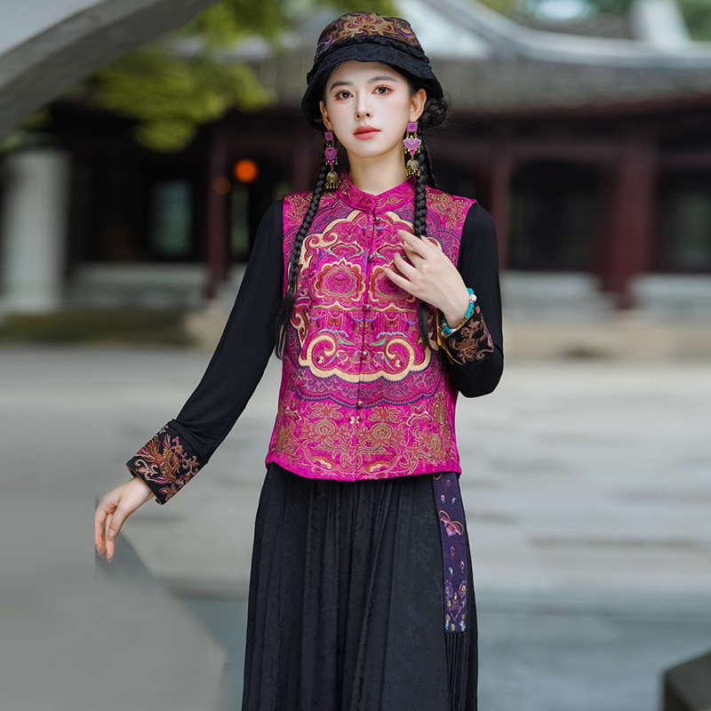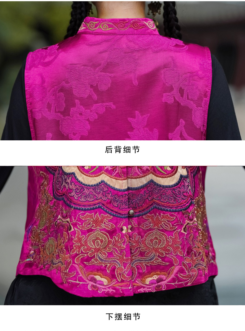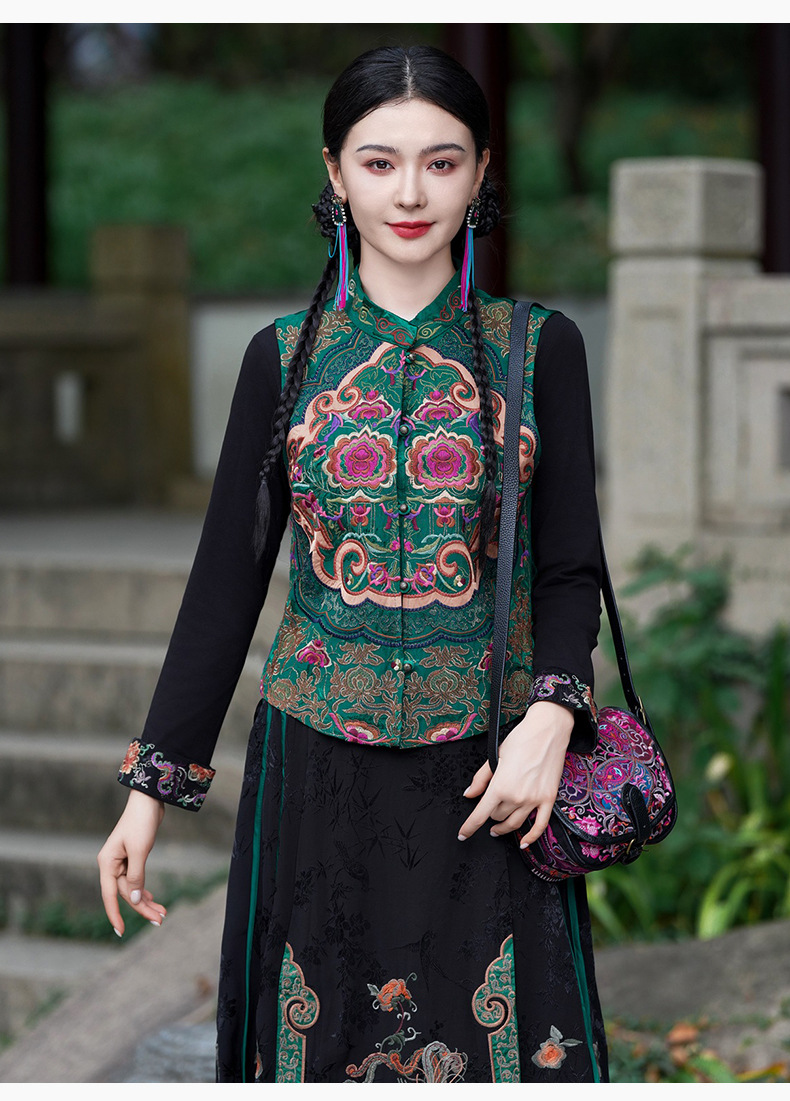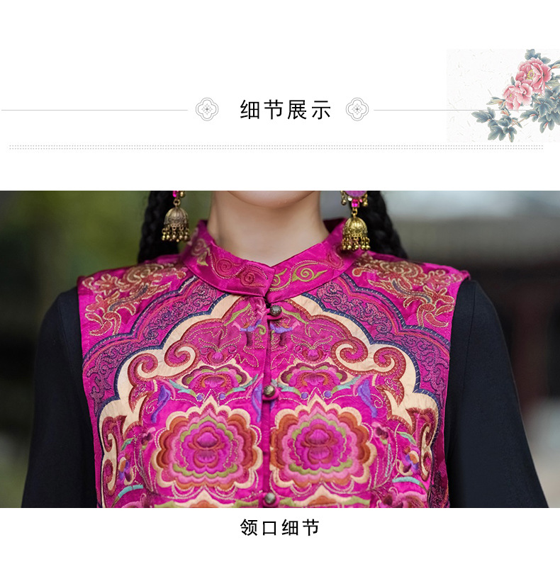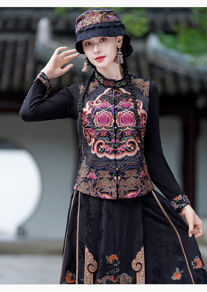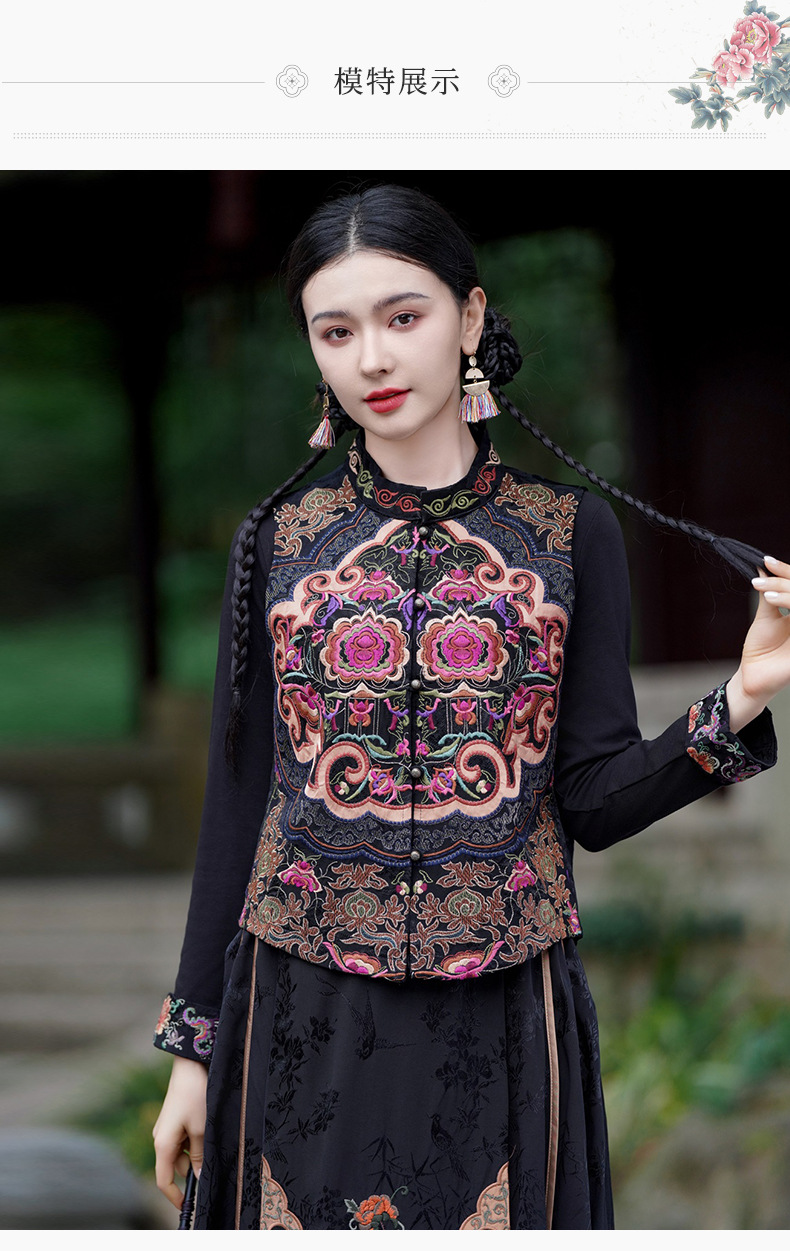중공업 수놓은 조끼 여성 조끼 레트로 레트로 민소매 아우터웨어 2024 가을 신민족스타일 웨이스트밴드 조끼 재킷
