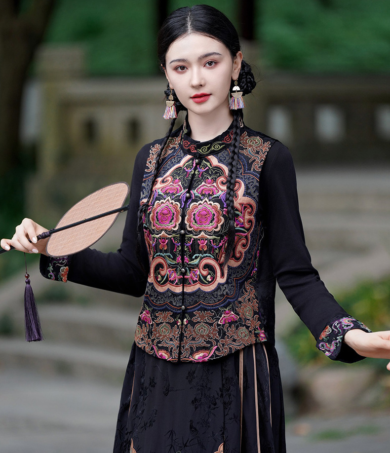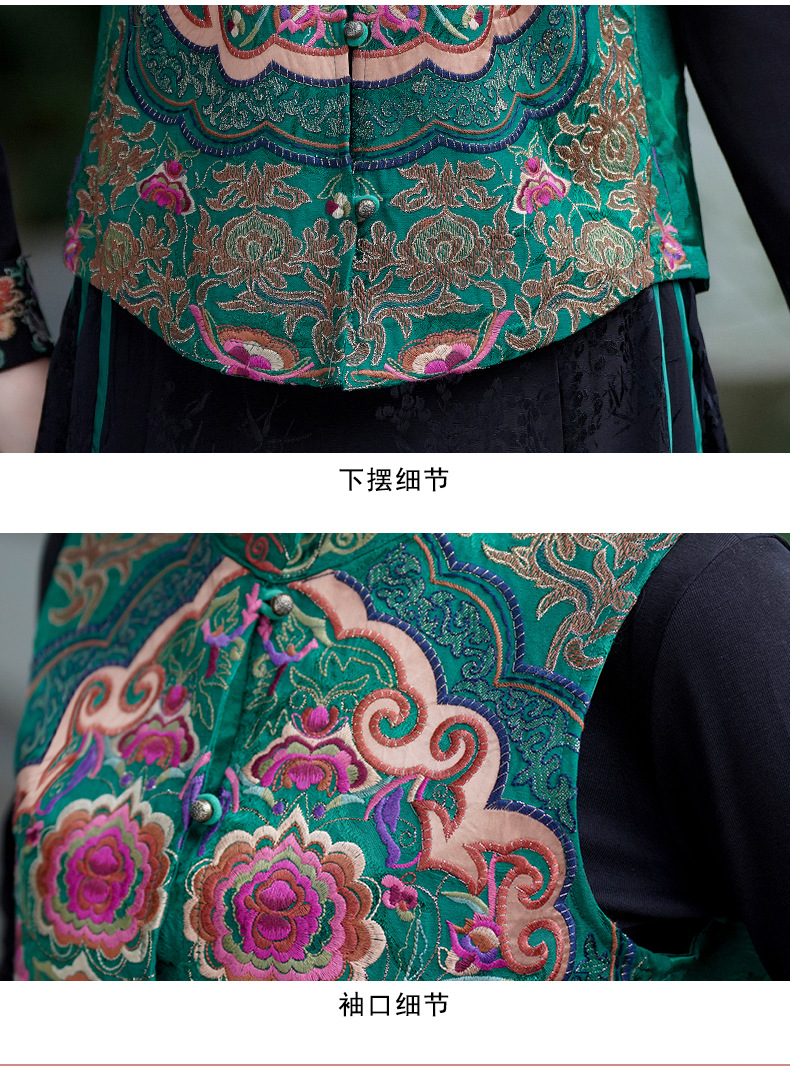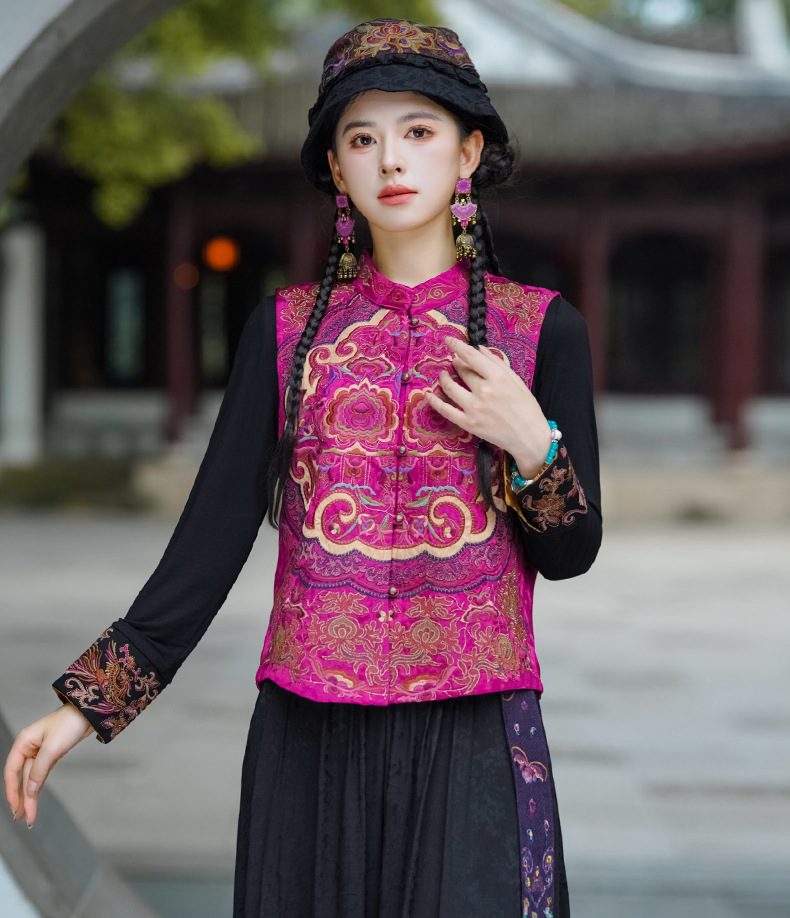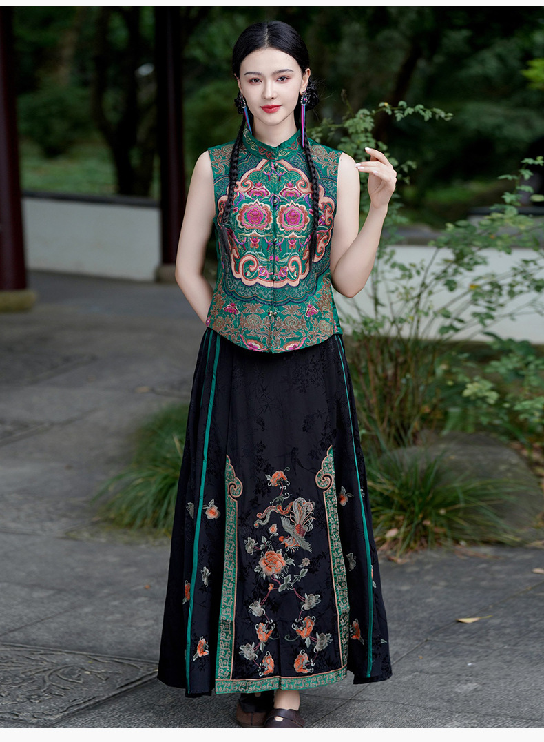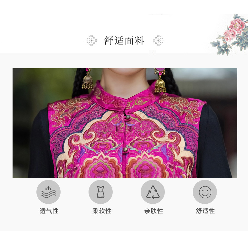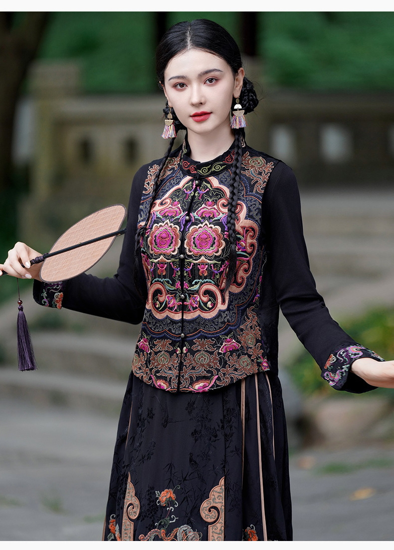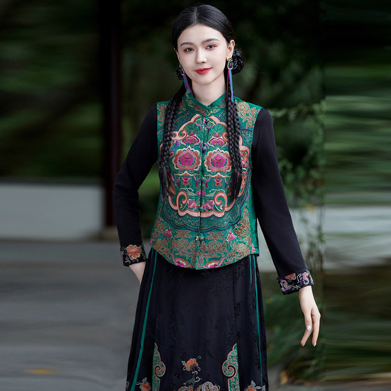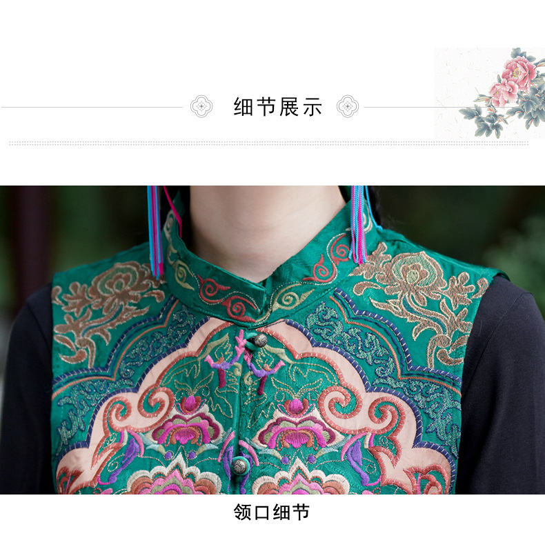 중공업 수놓은 조끼 여성 조끼 레트로 레트로 민소매 아우터웨어 2024 가을 신민족스타일 웨이스트밴드 조끼 재킷