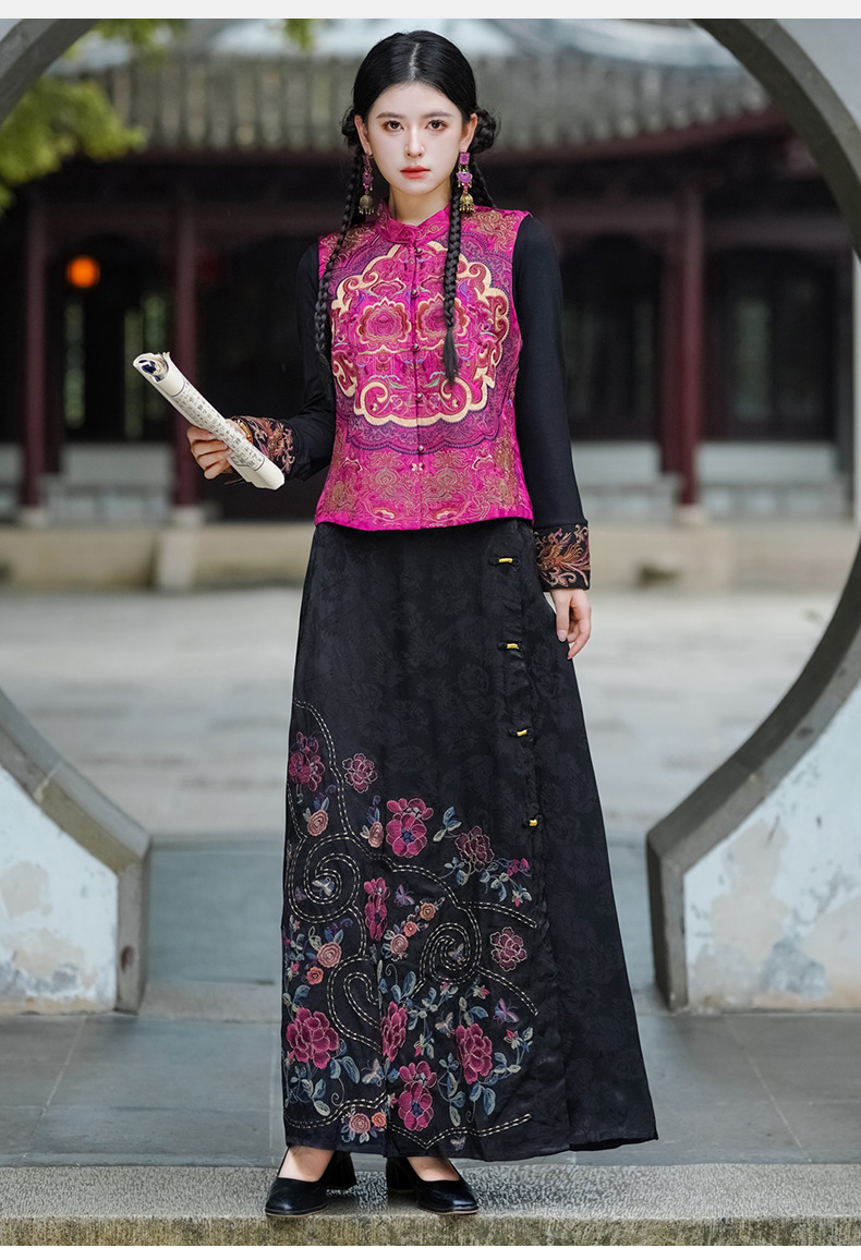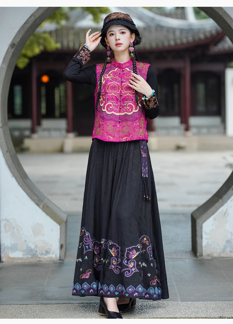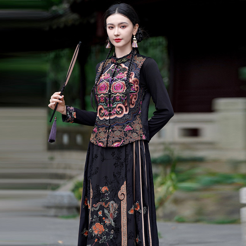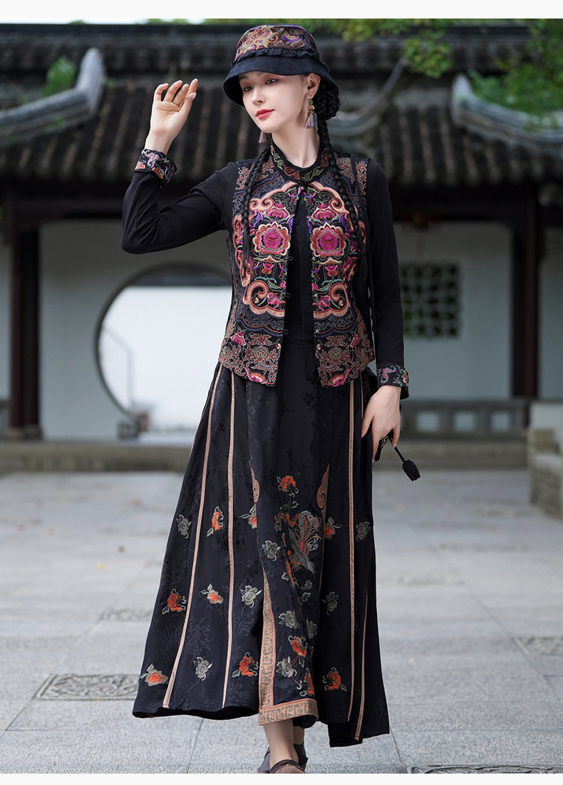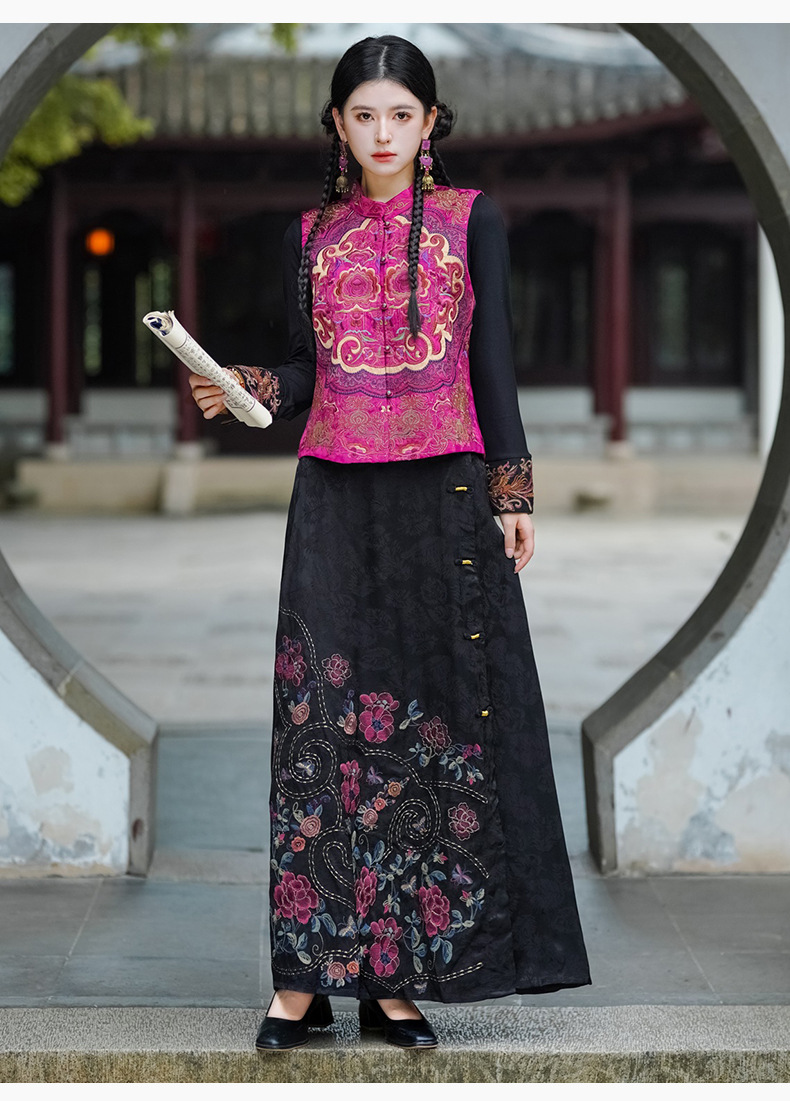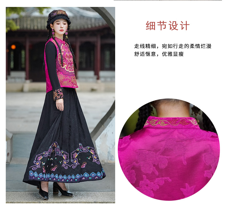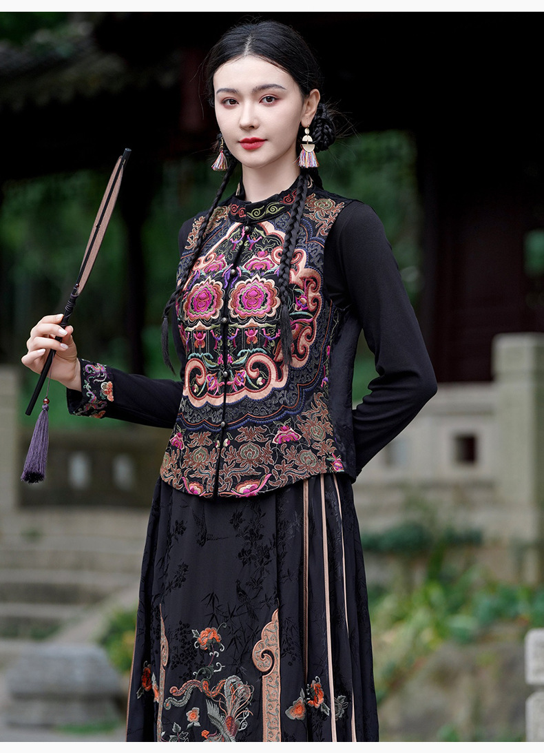 중공업 수놓은 조끼 여성 조끼 레트로 레트로 민소매 아우터웨어 2024 가을 신민족스타일 웨이스트밴드 조끼 재킷