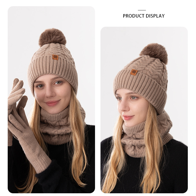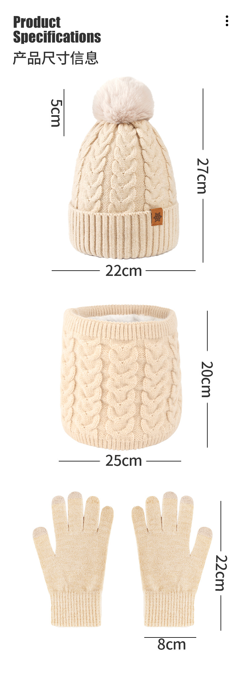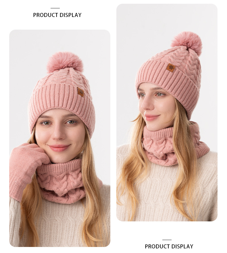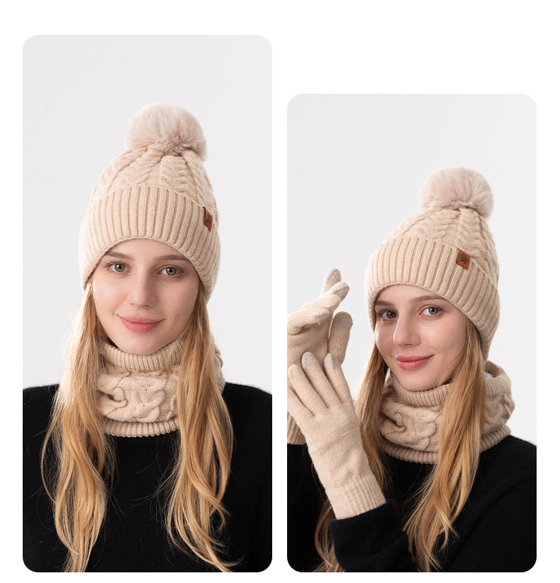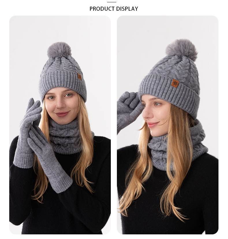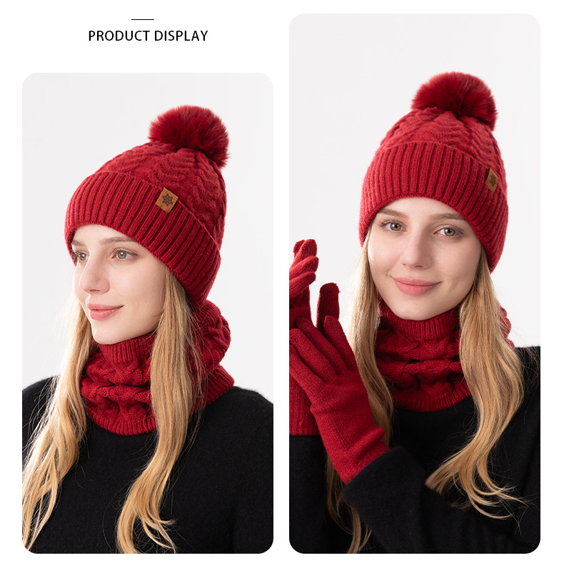 니트 모자 여성의 겨울 모자 스카프 장갑 3 피스 세트 야외 냉장 따뜻한 솔리드 컬러 니트 모자