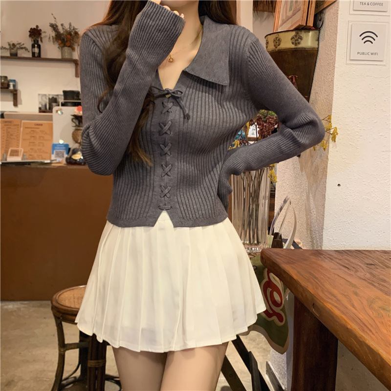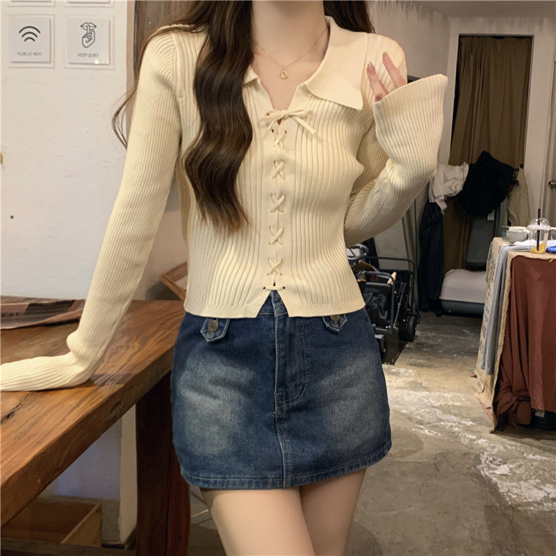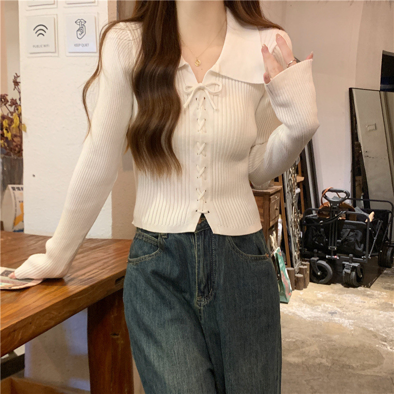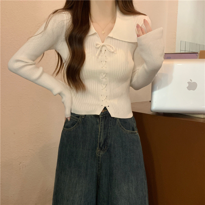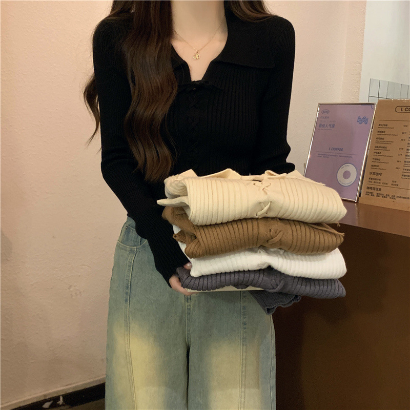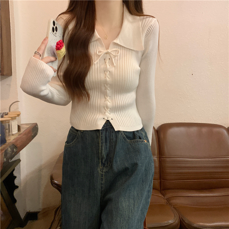진북강 가을 새 폴로 칼라 긴팔 보토밍 스웨터 탑 쇼트 작은 내부 스웨터 여성의 가을스토어 가기